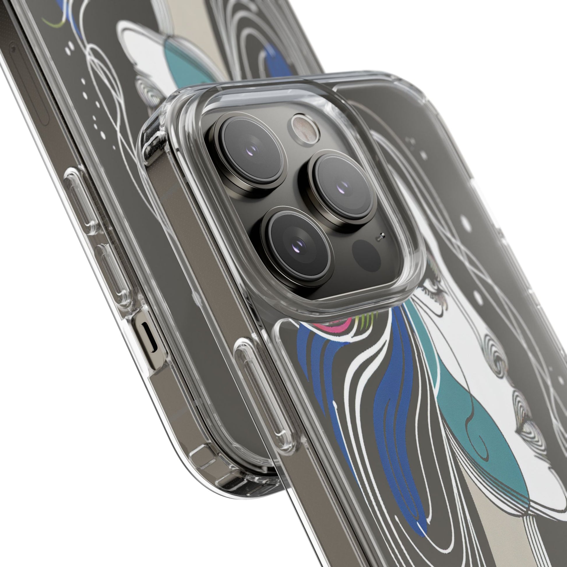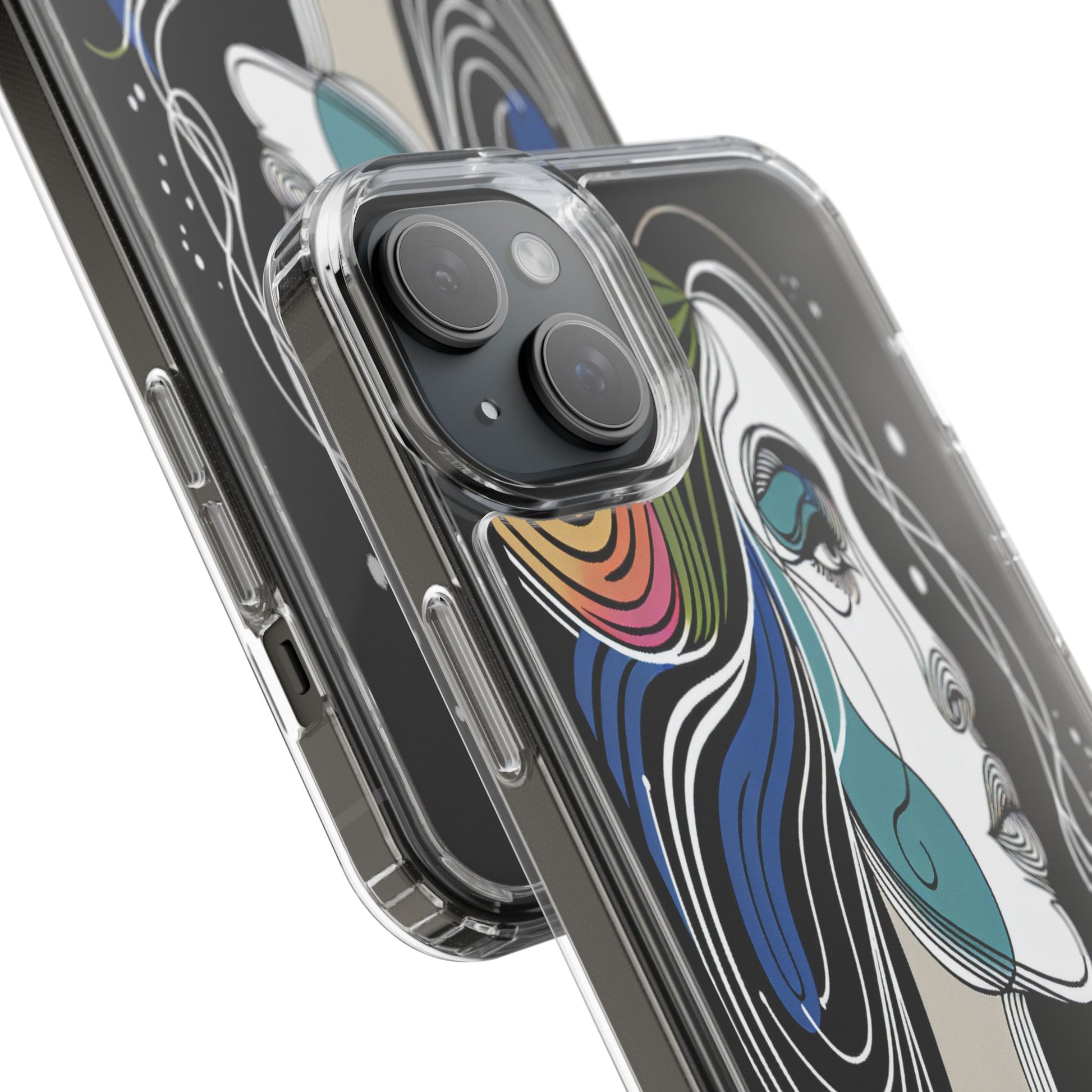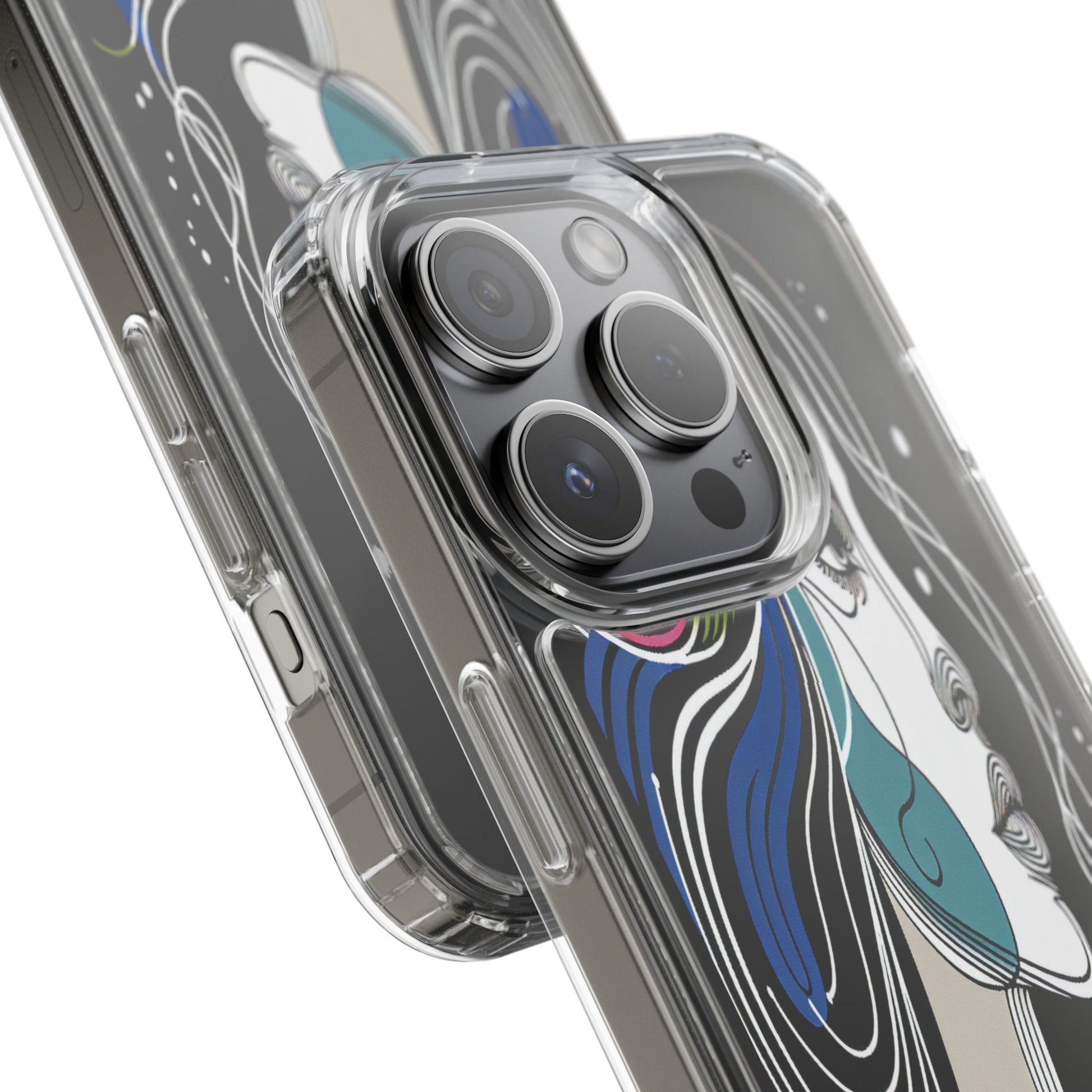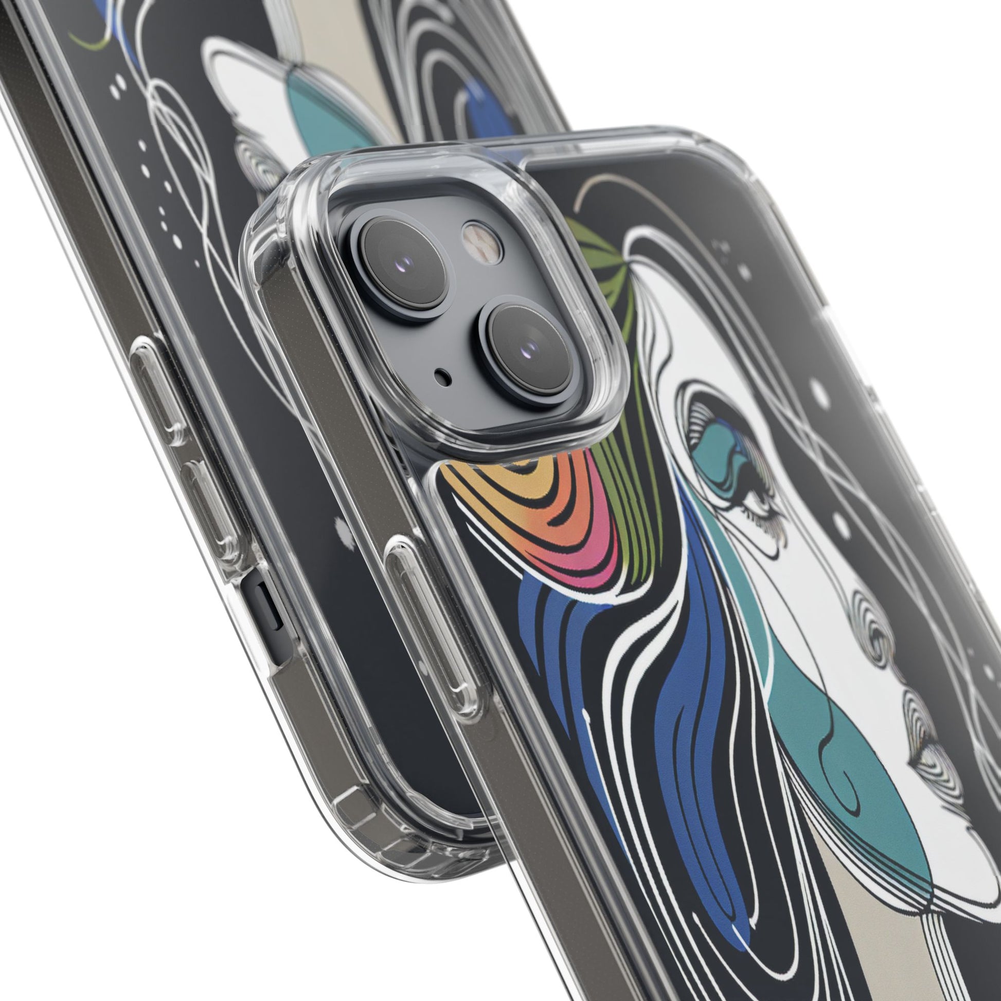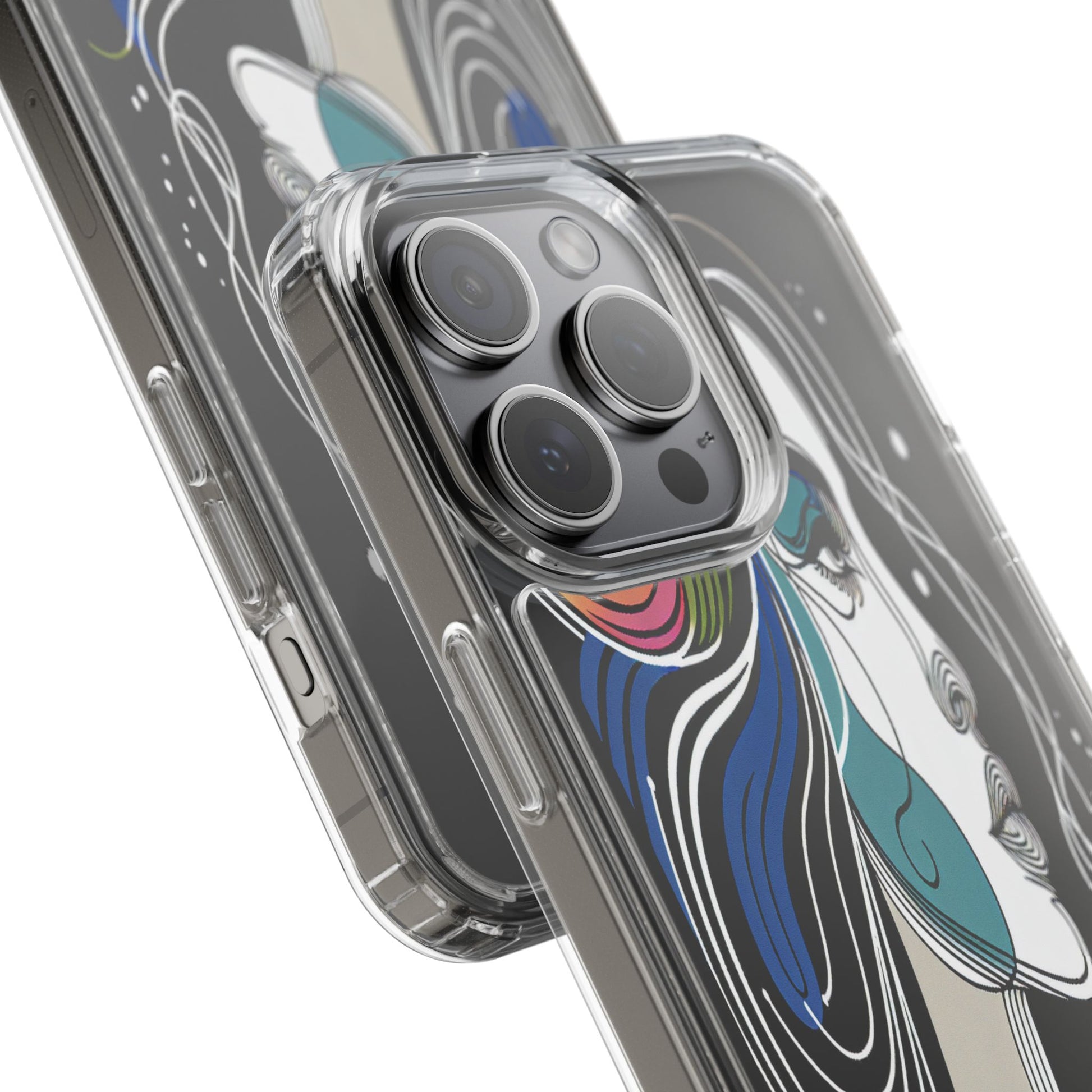 The image showcases an abstract female profile with swirling lines and vibrant colors. Fluid curves blend seamlessly, creating a harmonious flow of blues, greens, and reds. This artistic design exudes dynamic movement and elegance in its intricate detailing and vivid palette. Protect your phone while showcasing its sleek design with our customizable clear phone case, designed to fit iPhones from the latest iPhone 16 to earlier models like iPhone XR, XS, and X. This slim and lightweight case is perfect for guarding against daily wear and tear, offering shock-absorbing and scratch-resistant protection.
