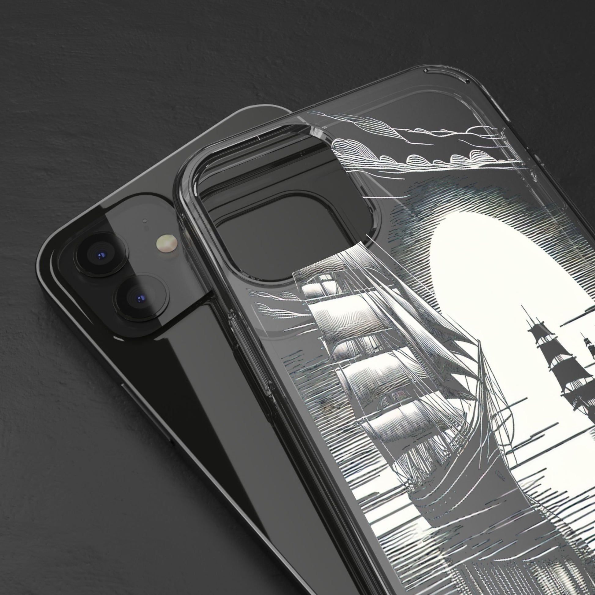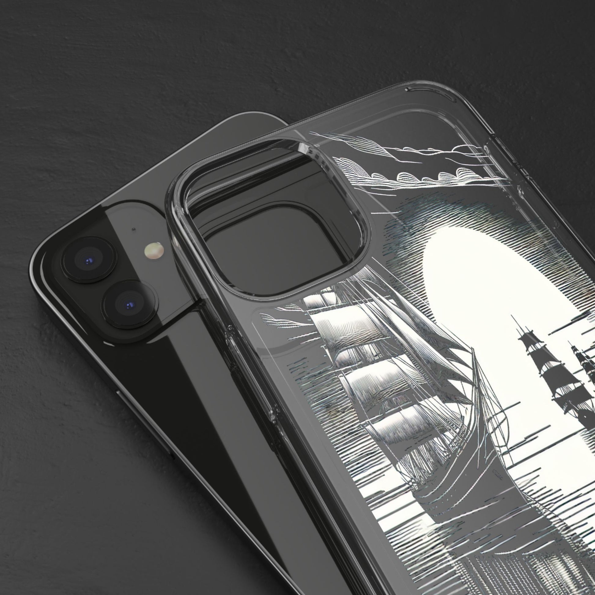 Monochrome brilliance captures a fleet of ships sailing under a luminous, oversized moon. Intricate line work evokes motion, while reflections on the water create a kaleidoscope of light and shadow, blending vintage style with a surreal twist. Protect your phone while showcasing its sleek design with our customizable clear phone case, designed to fit iPhones from the latest iPhone 16 to earlier models like iPhone XR, XS, and X. This slim and lightweight case is perfect for guarding against daily wear and tear, offering shock-absorbing and scratch-resistant protection.