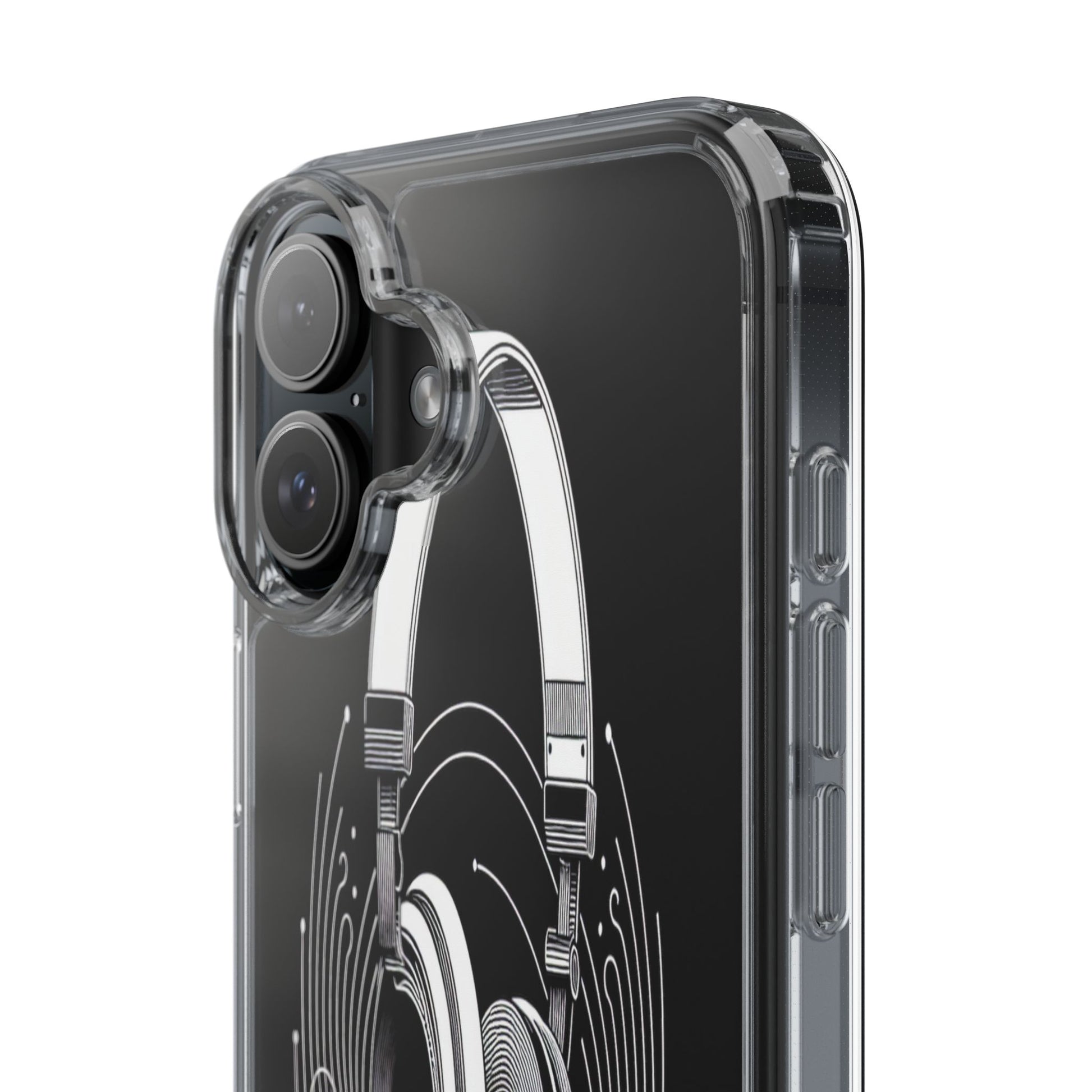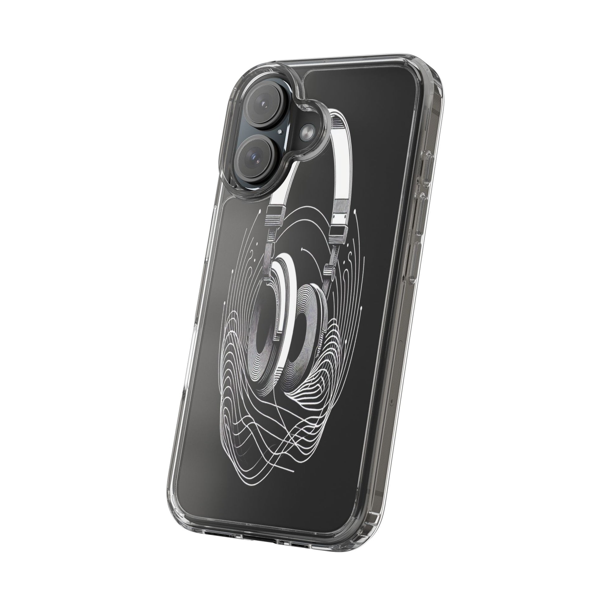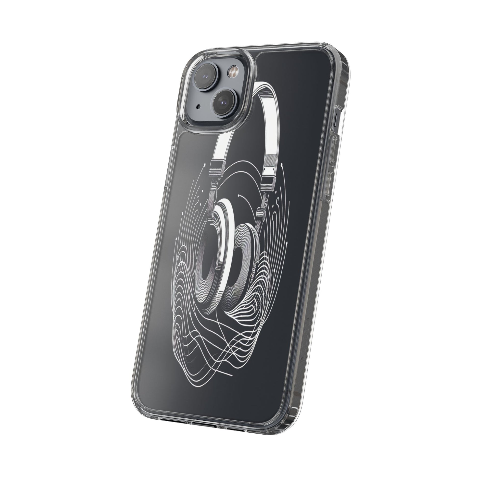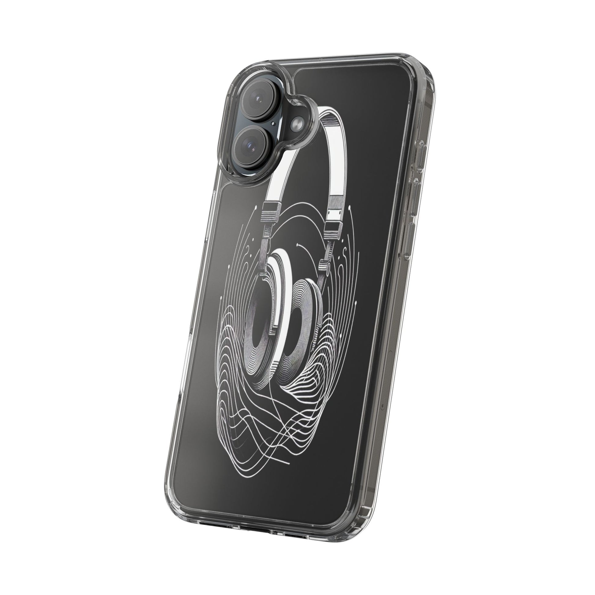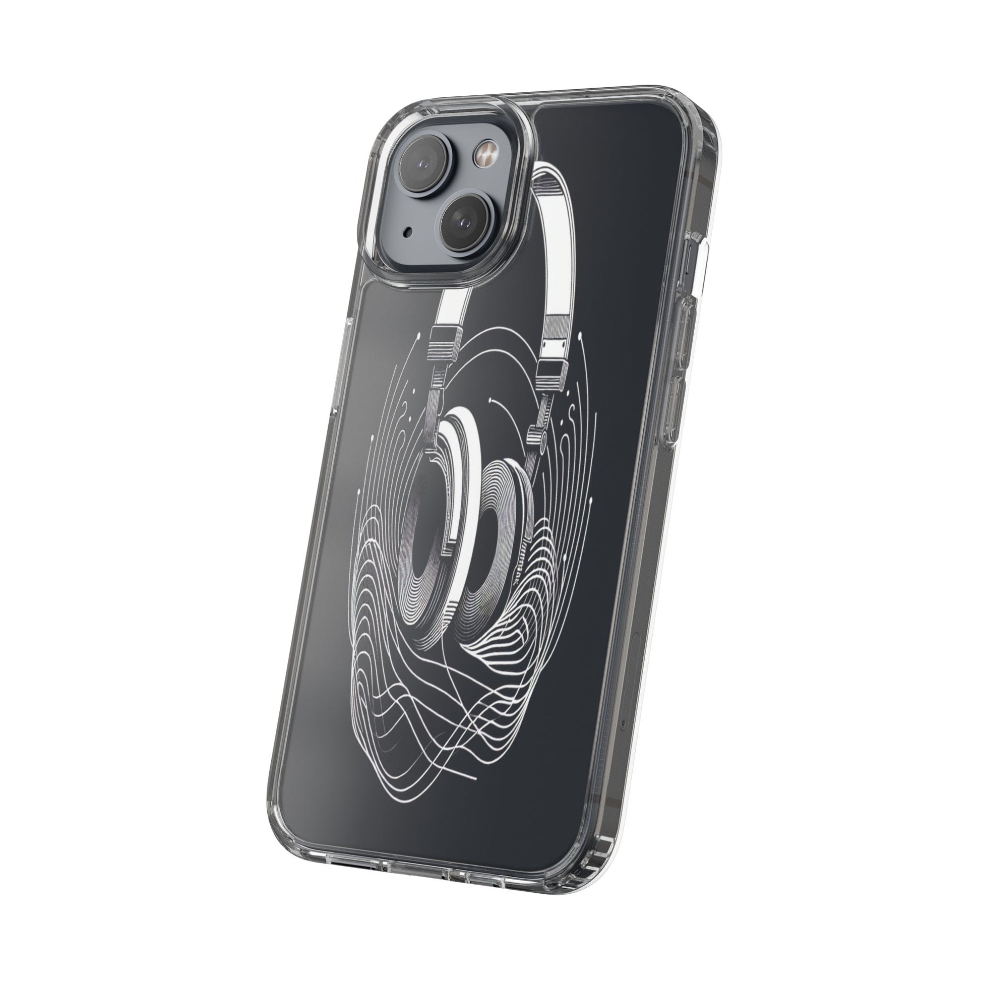 This striking line-art illustration features headphones with intertwined, flowing lines, symbolizing sound waves. The monochrome design combines technical precision with artistic fluidity, creating a sense of dynamic movement and musical connectivity. Protect your phone while showcasing its sleek design with our customizable clear phone case, designed to fit iPhones from the latest iPhone 16 to earlier models like iPhone XR, XS, and X. This slim and lightweight case is perfect for guarding against daily wear and tear, offering shock-absorbing and scratch-resistant protection.