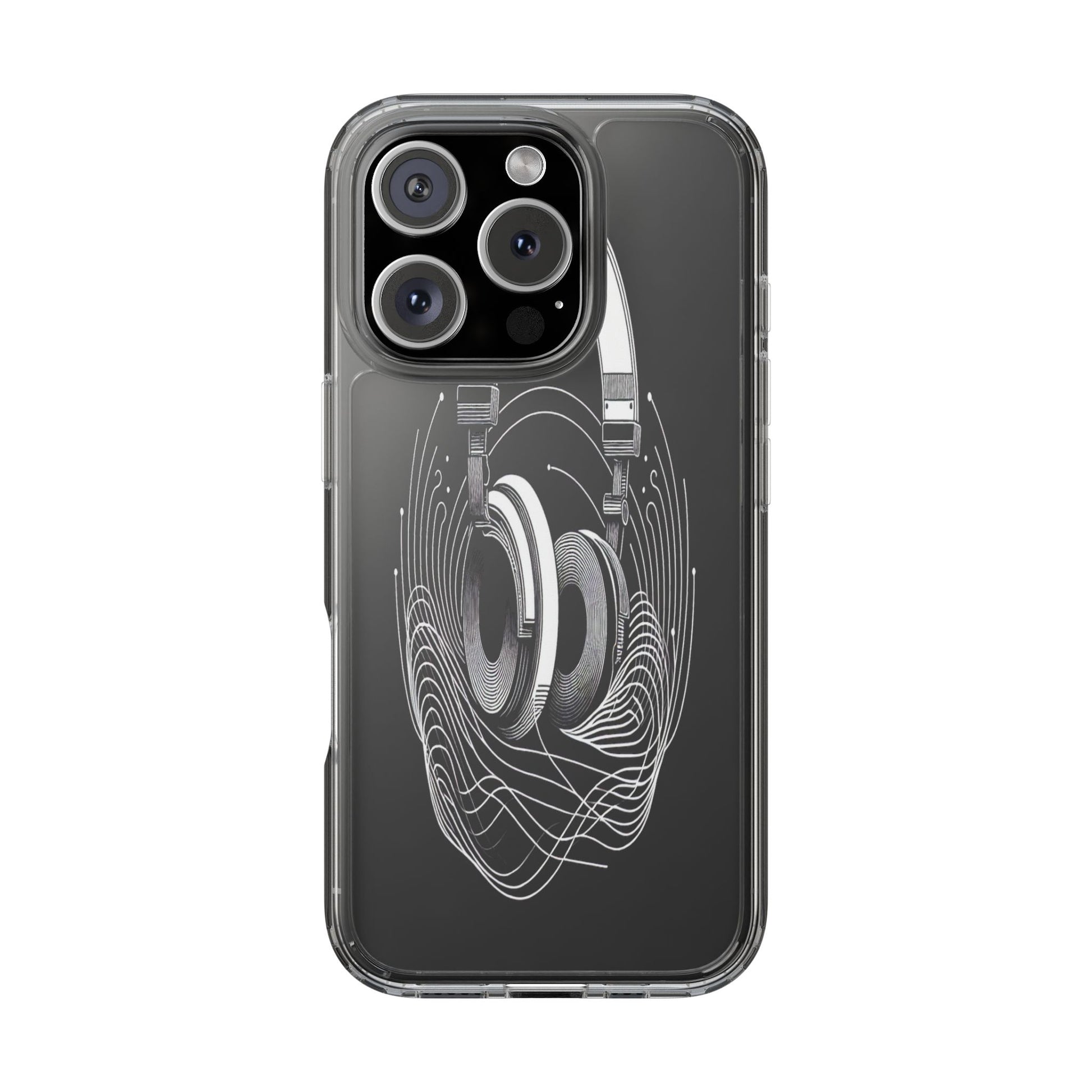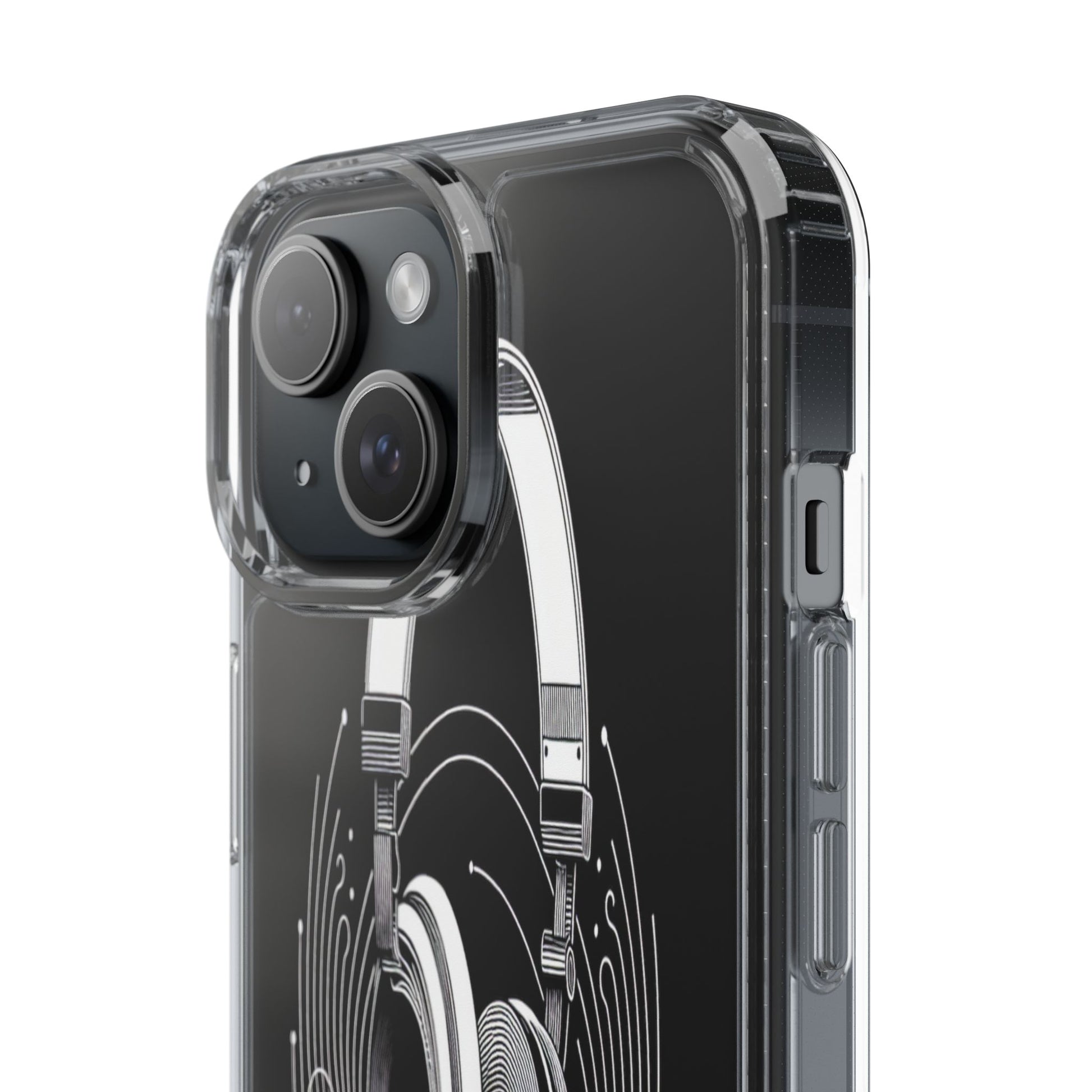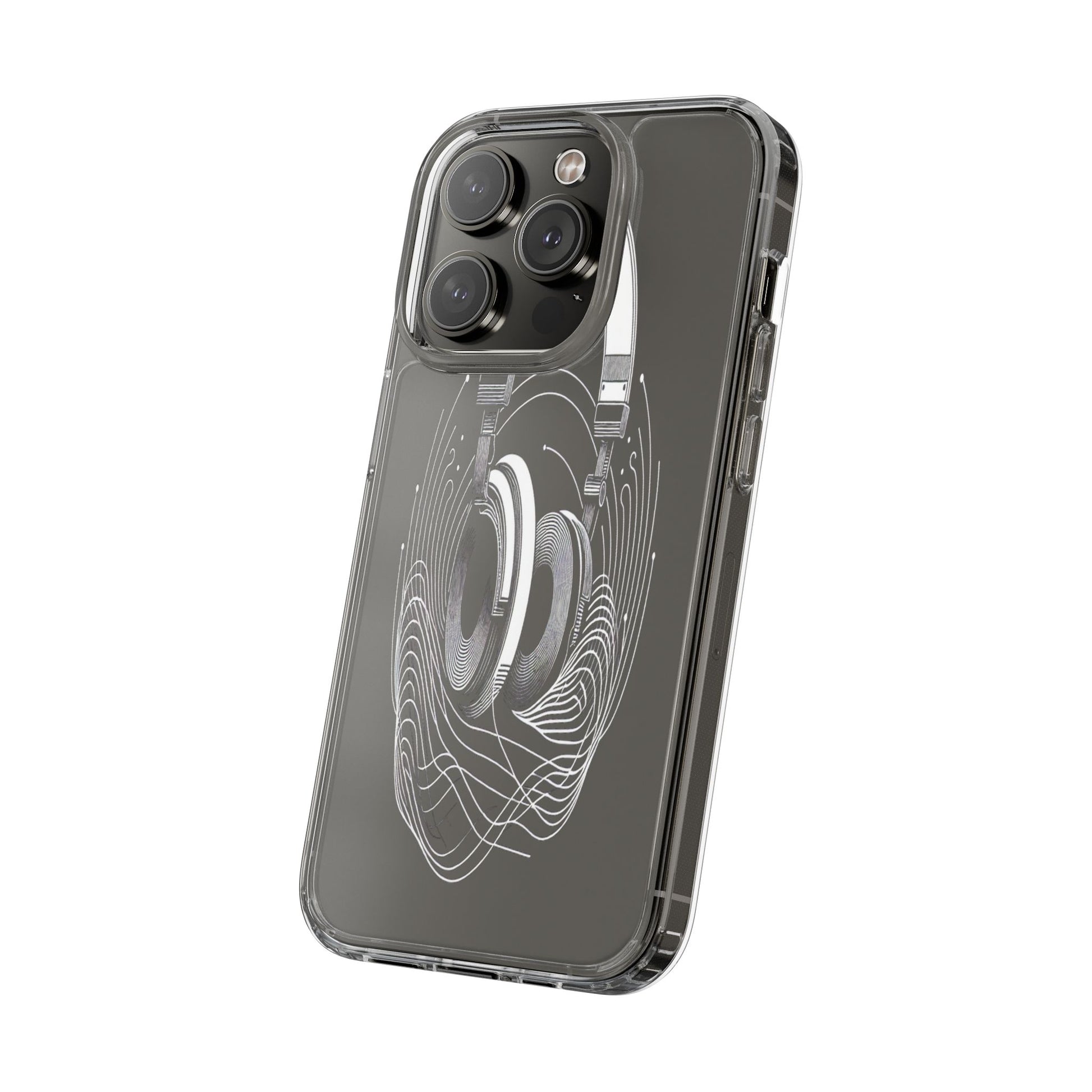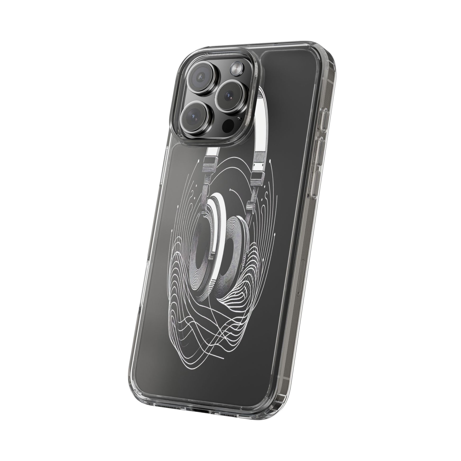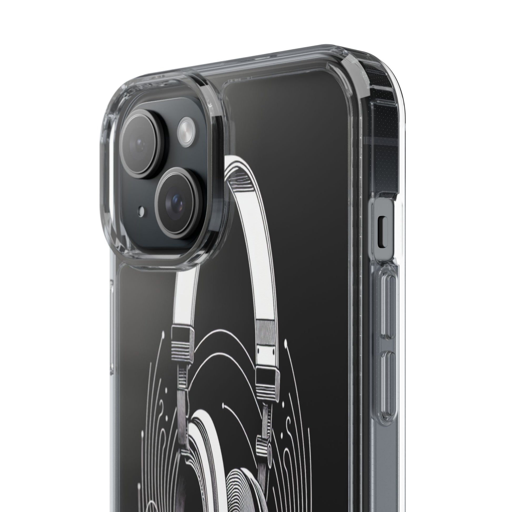 This striking line-art illustration features headphones with intertwined, flowing lines, symbolizing sound waves. The monochrome design combines technical precision with artistic fluidity, creating a sense of dynamic movement and musical connectivity. Protect your phone while showcasing its sleek design with our customizable clear phone case, designed to fit iPhones from the latest iPhone 16 to earlier models like iPhone XR, XS, and X. This slim and lightweight case is perfect for guarding against daily wear and tear, offering shock-absorbing and scratch-resistant protection.