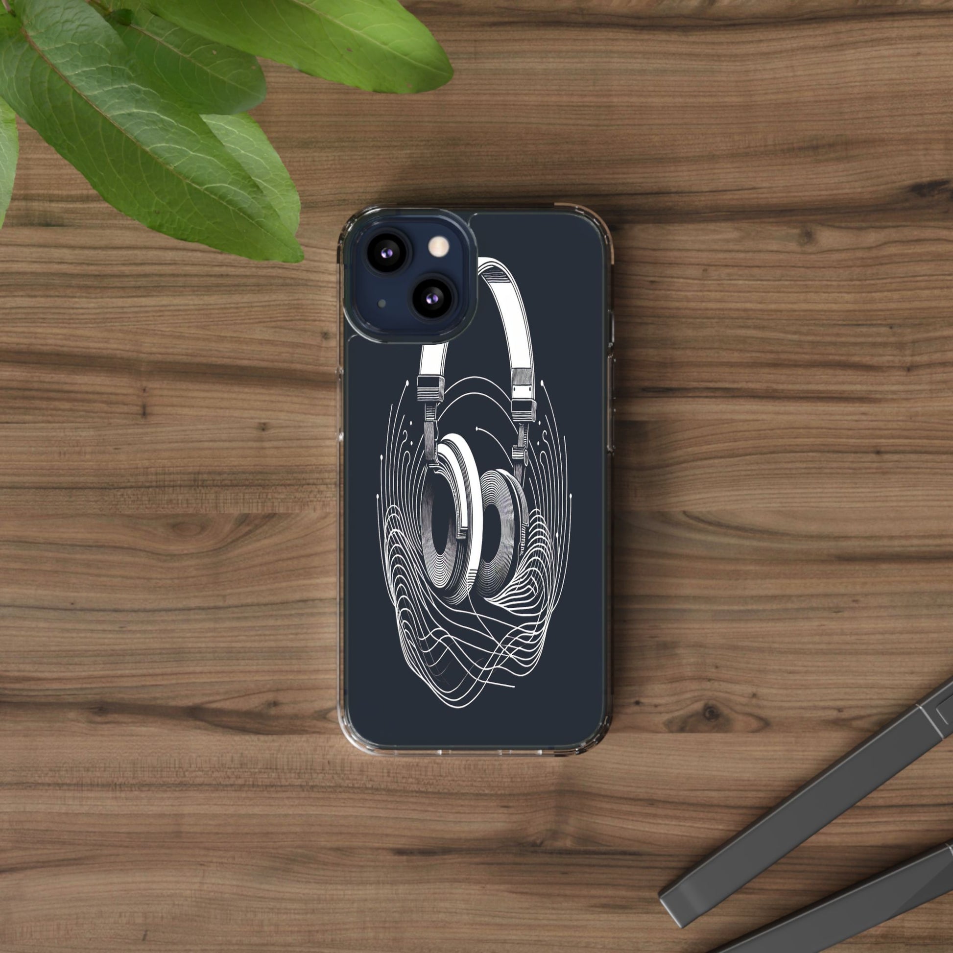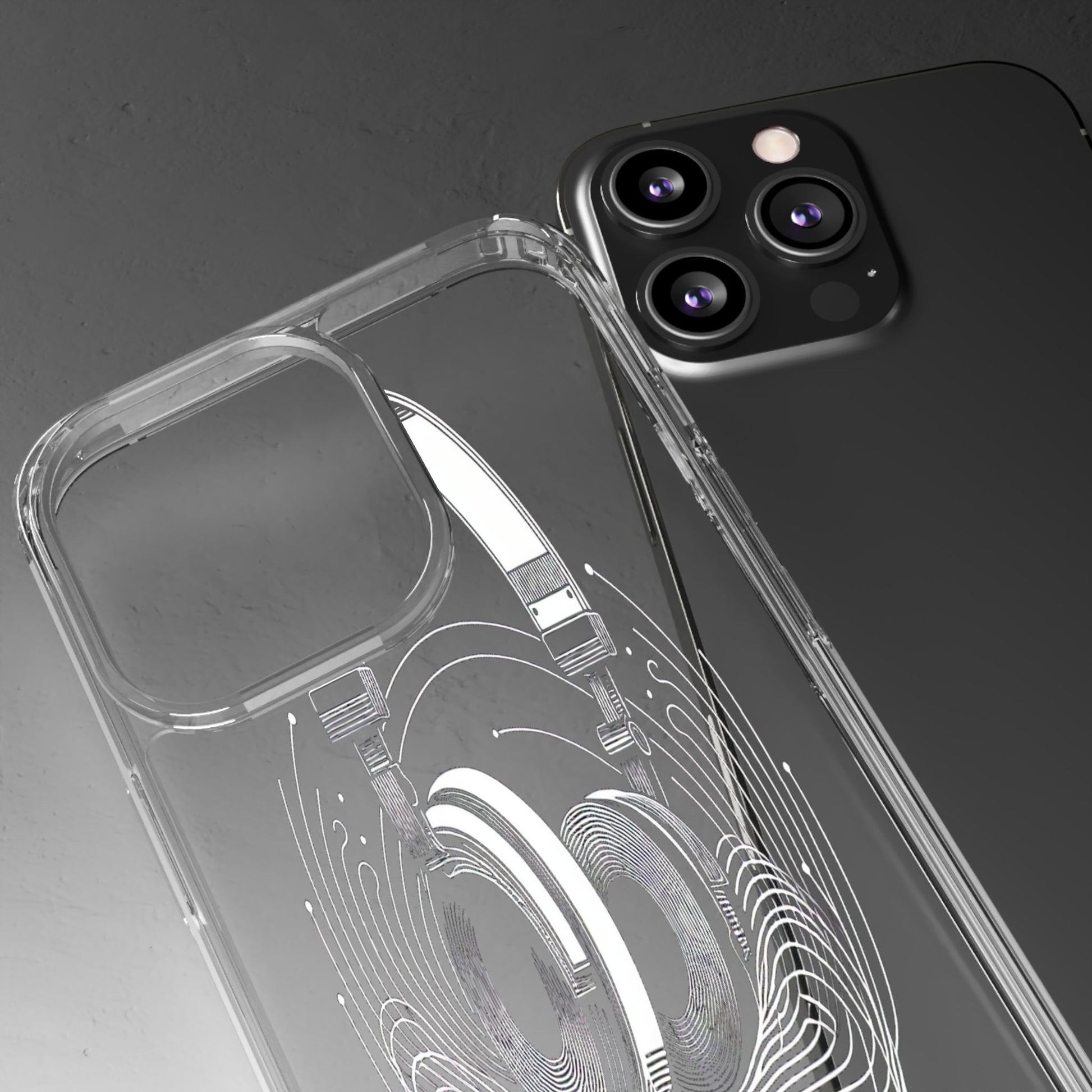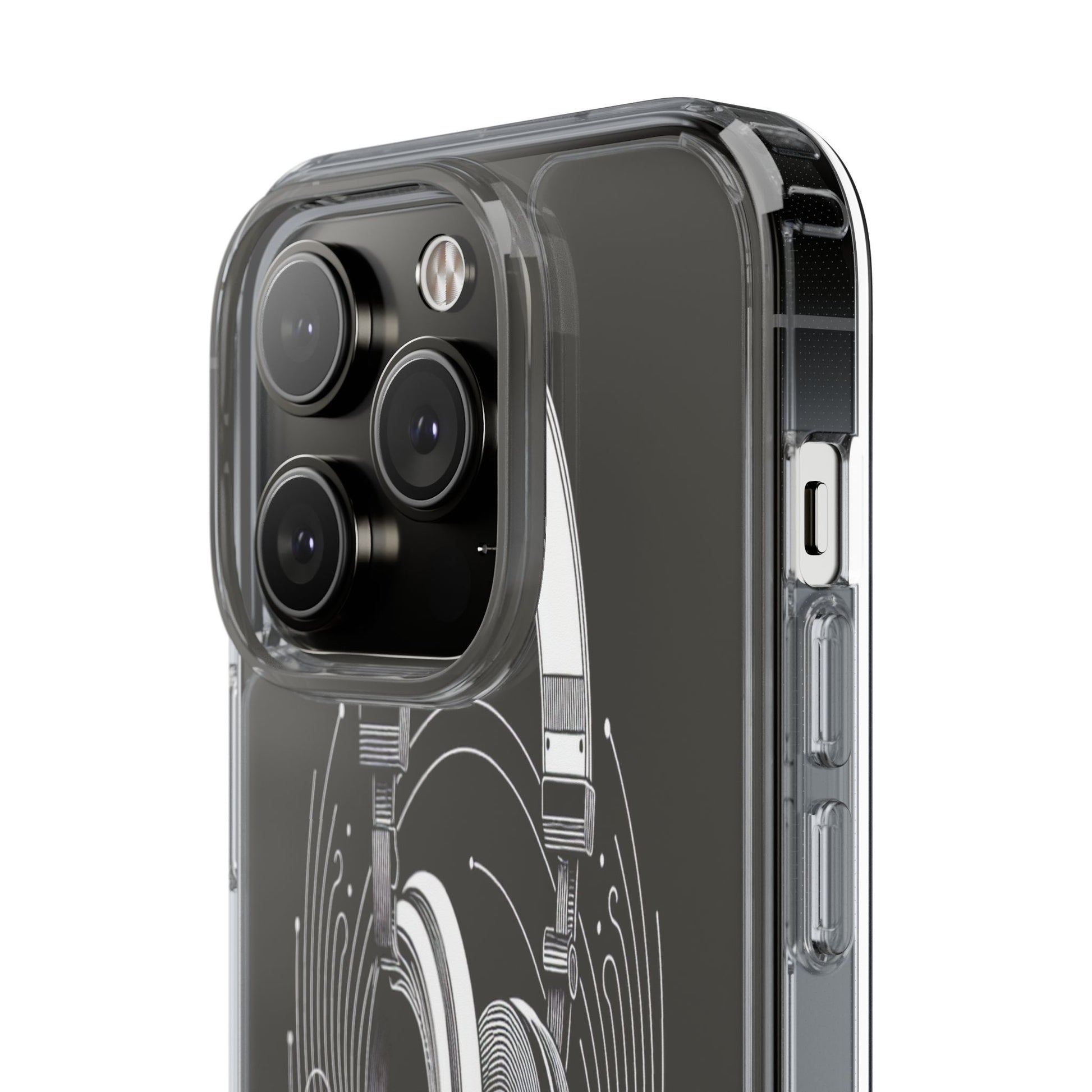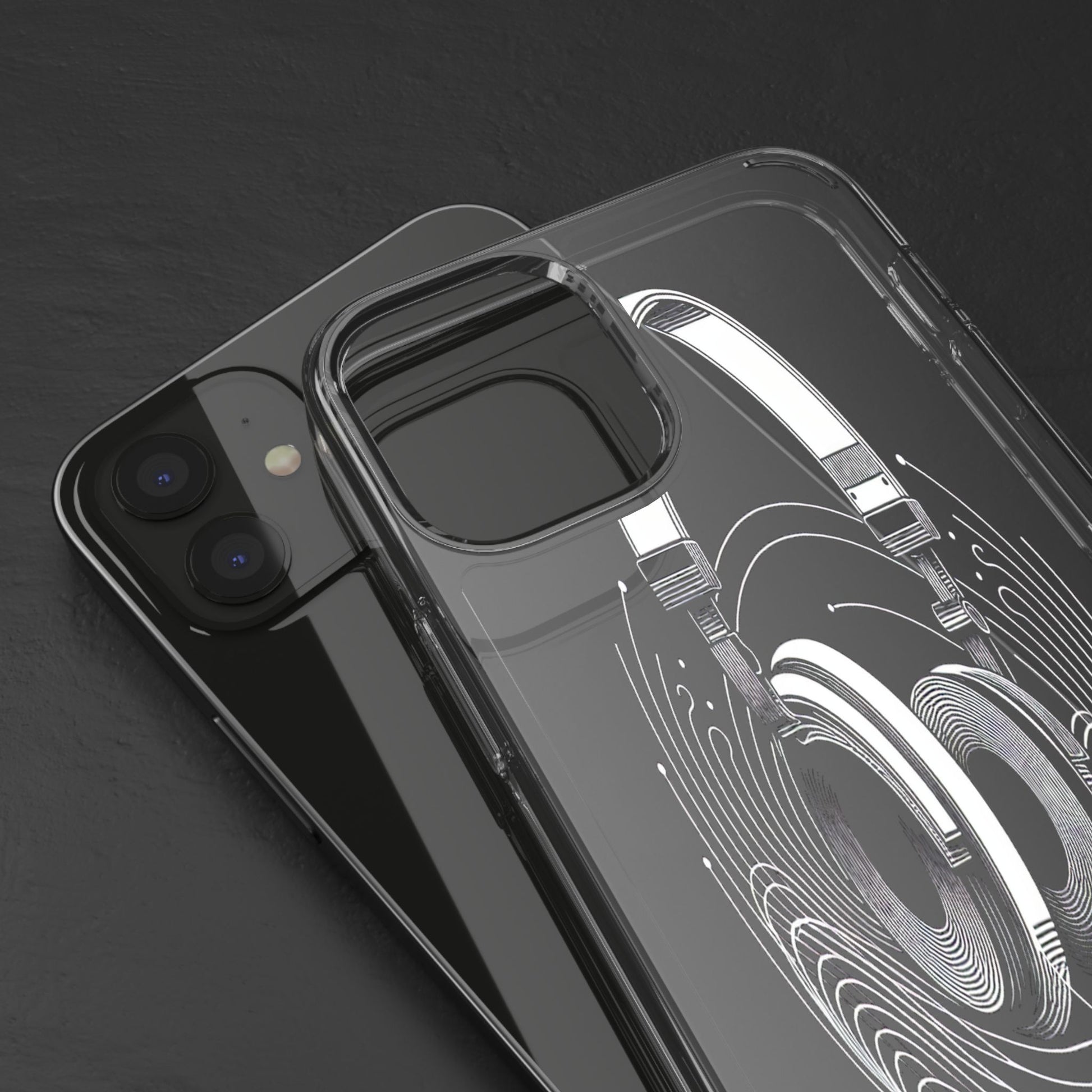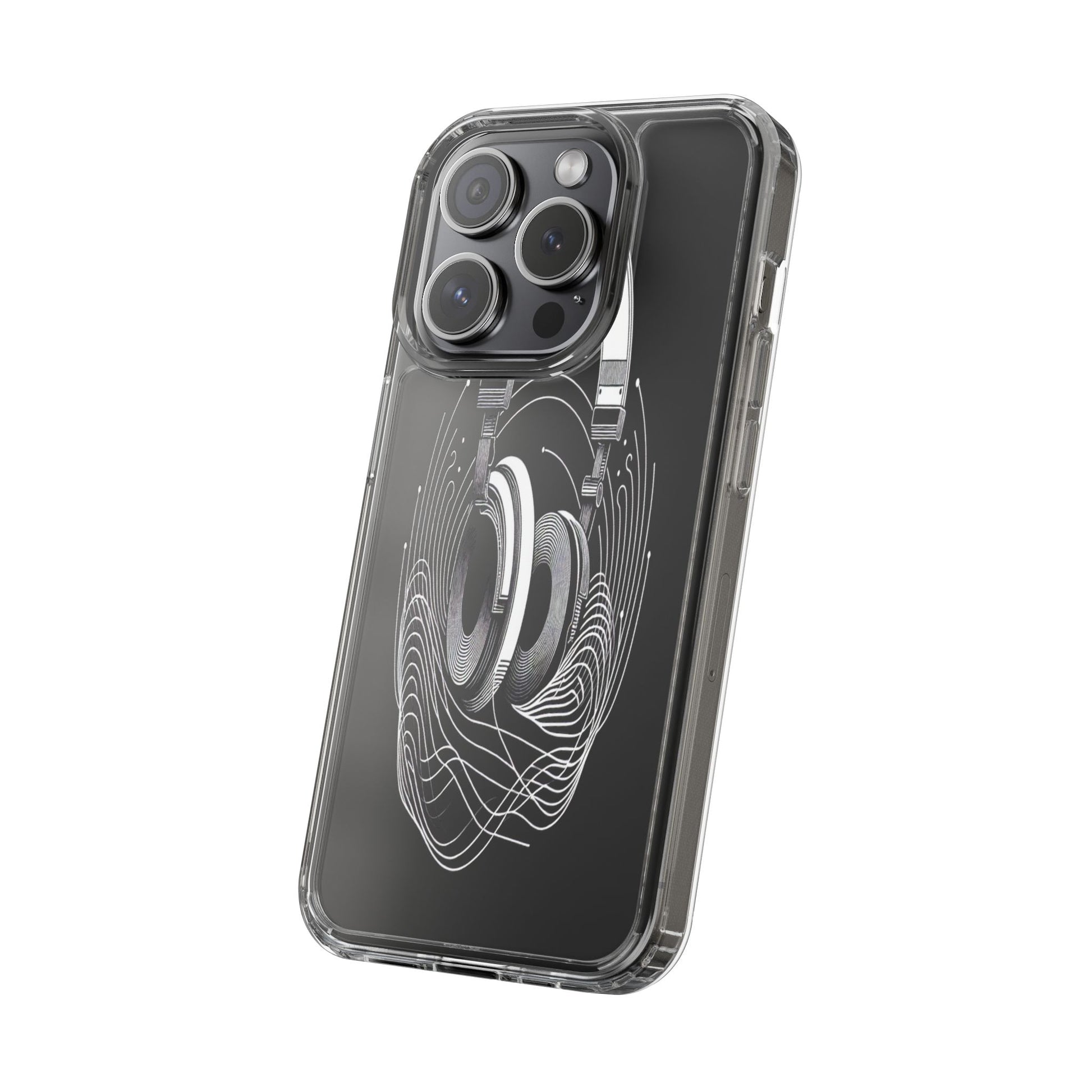 This striking line-art illustration features headphones with intertwined, flowing lines, symbolizing sound waves. The monochrome design combines technical precision with artistic fluidity, creating a sense of dynamic movement and musical connectivity. Protect your phone while showcasing its sleek design with our customizable clear phone case, designed to fit iPhones from the latest iPhone 16 to earlier models like iPhone XR, XS, and X. This slim and lightweight case is perfect for guarding against daily wear and tear, offering shock-absorbing and scratch-resistant protection.