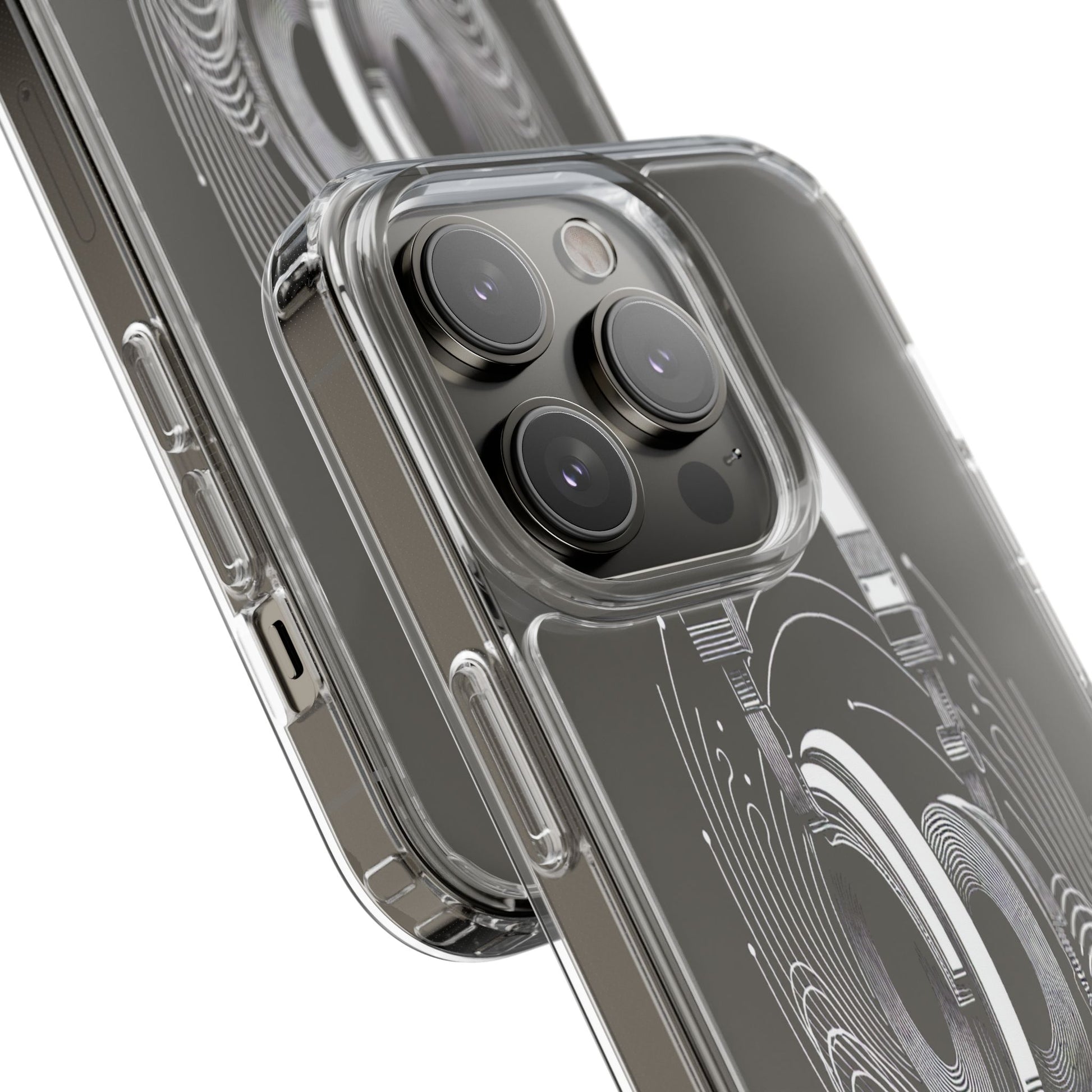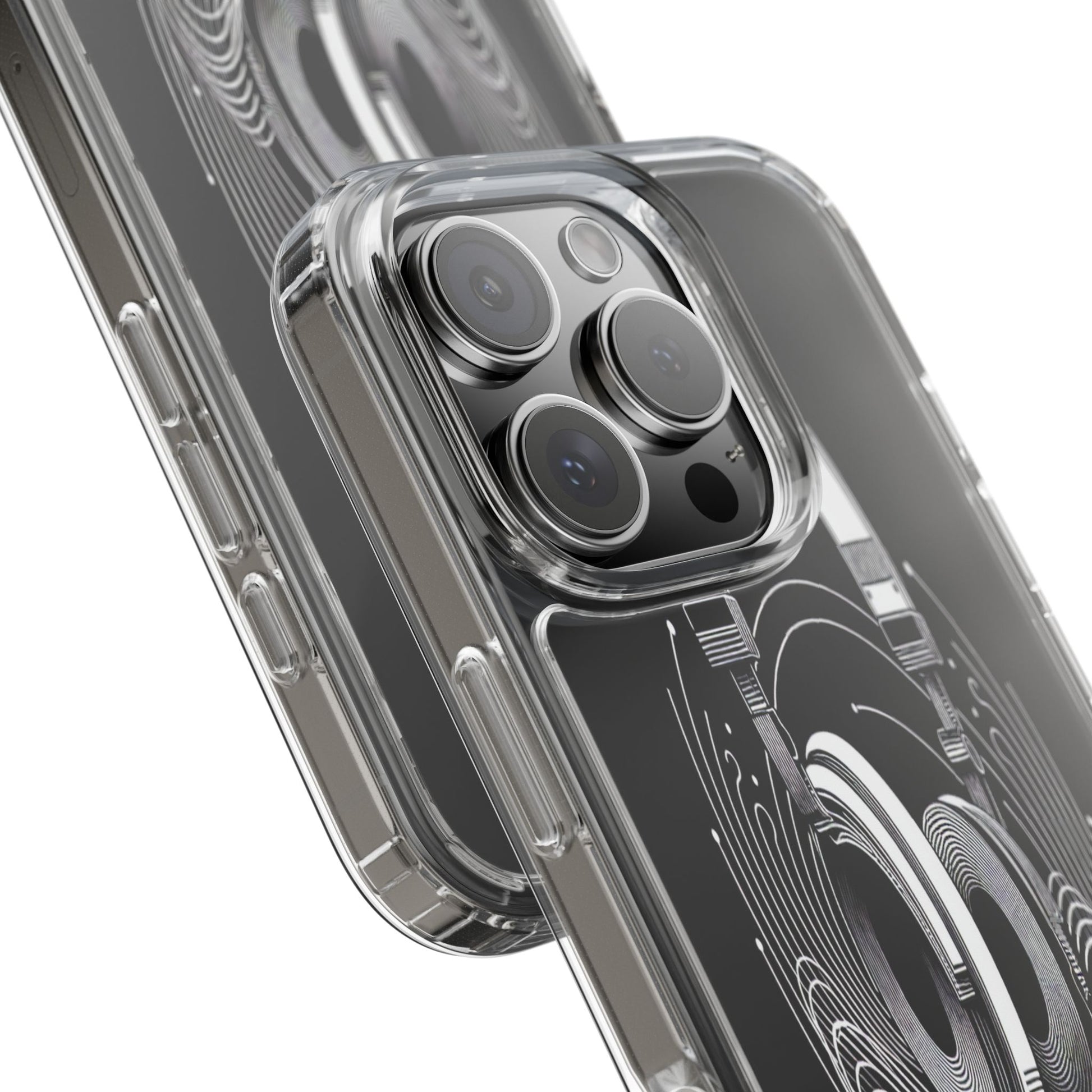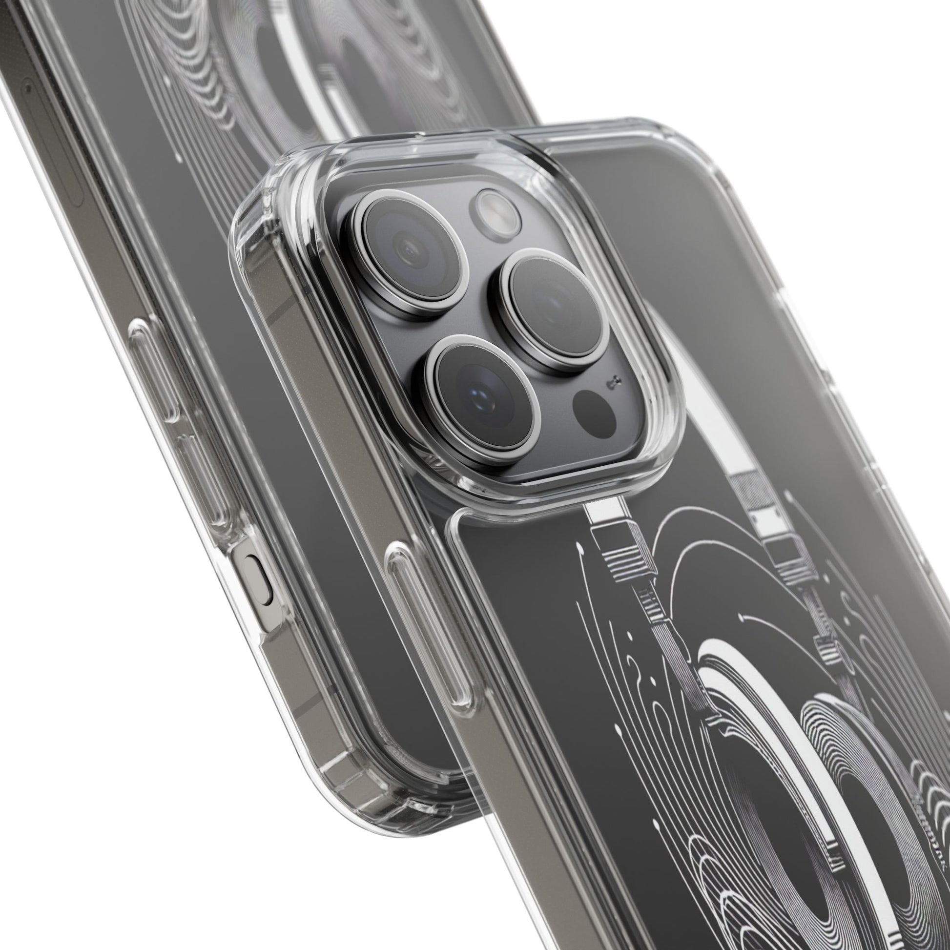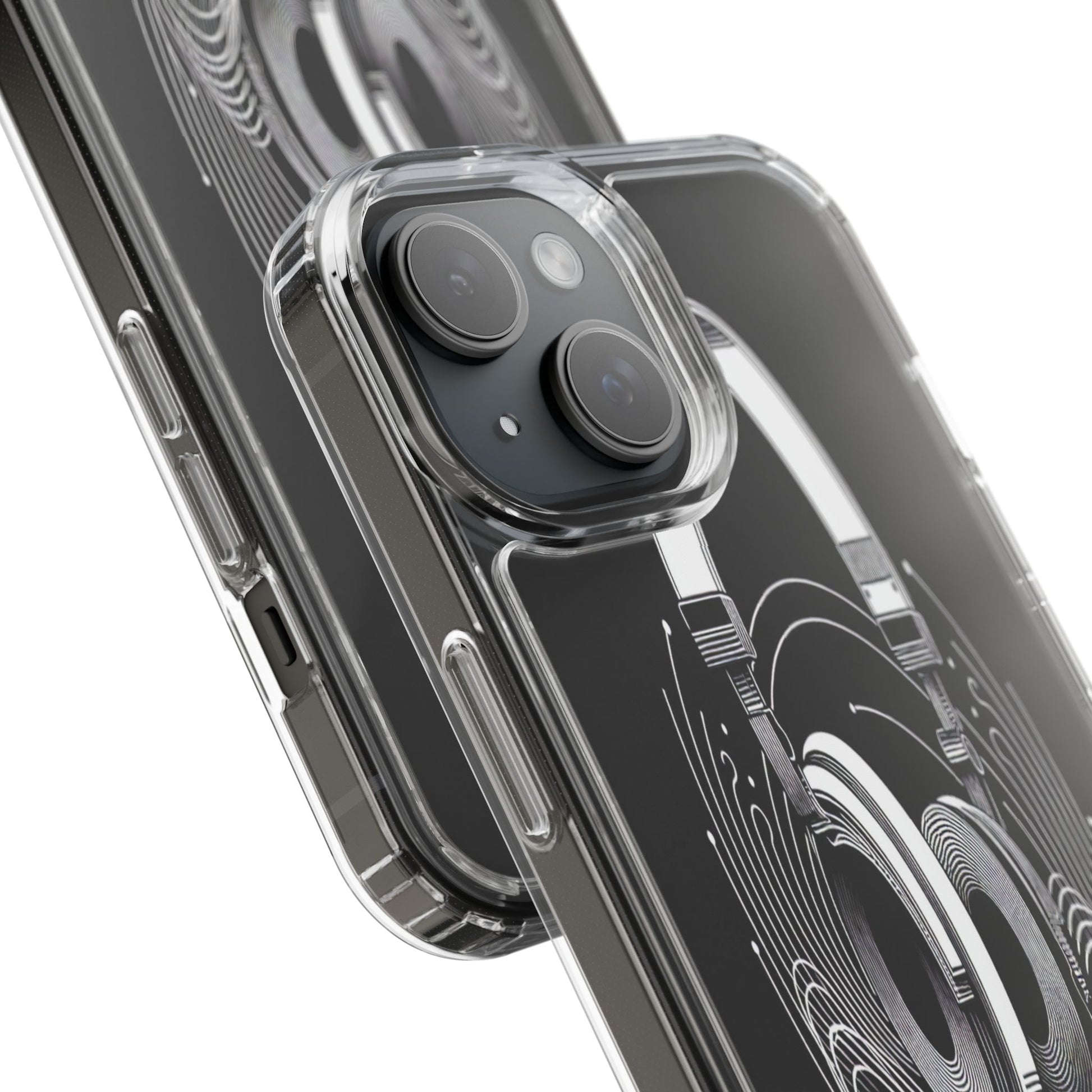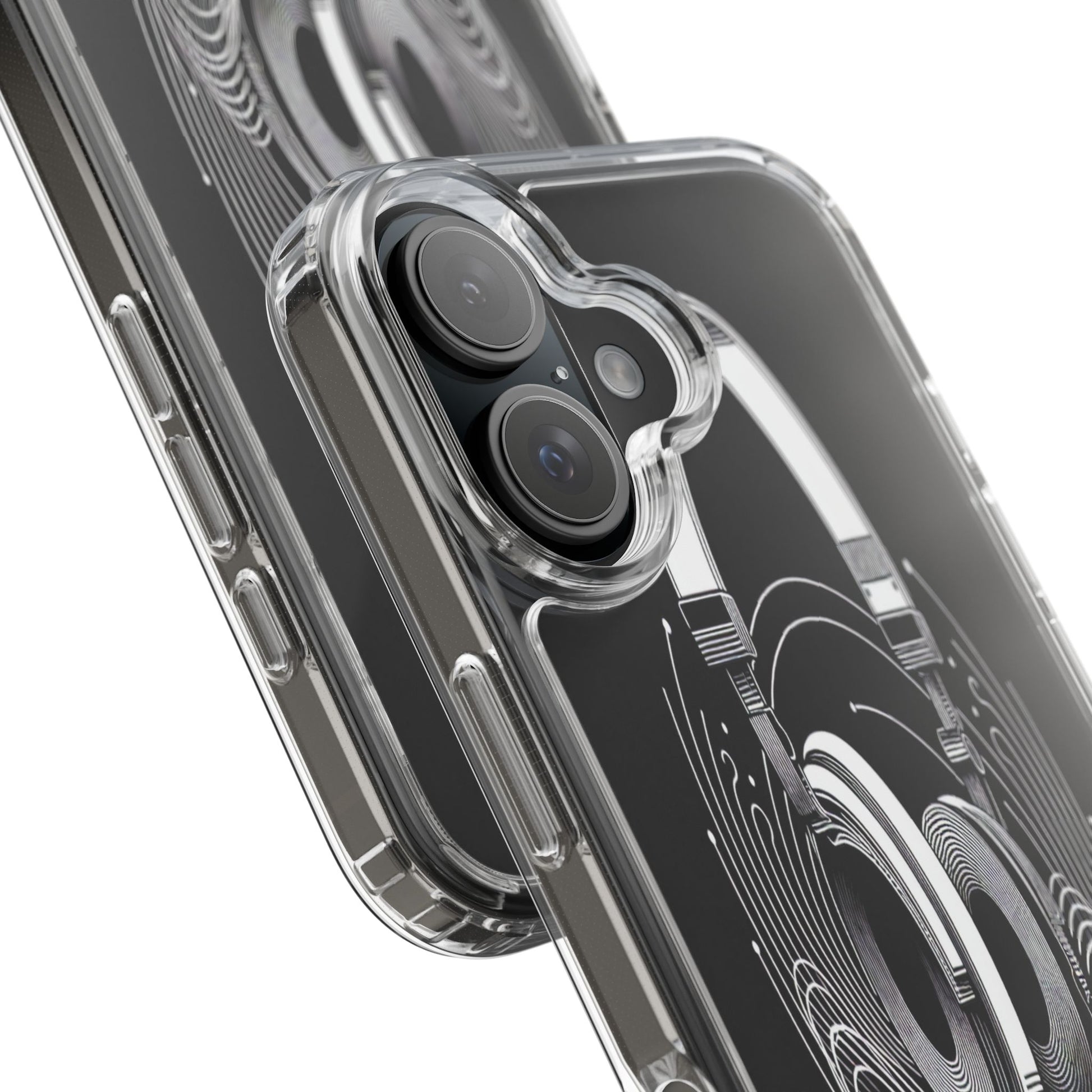 This striking line-art illustration features headphones with intertwined, flowing lines, symbolizing sound waves. The monochrome design combines technical precision with artistic fluidity, creating a sense of dynamic movement and musical connectivity. Protect your phone while showcasing its sleek design with our customizable clear phone case, designed to fit iPhones from the latest iPhone 16 to earlier models like iPhone XR, XS, and X. This slim and lightweight case is perfect for guarding against daily wear and tear, offering shock-absorbing and scratch-resistant protection.