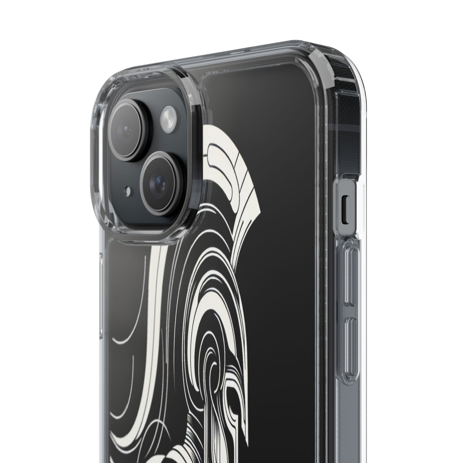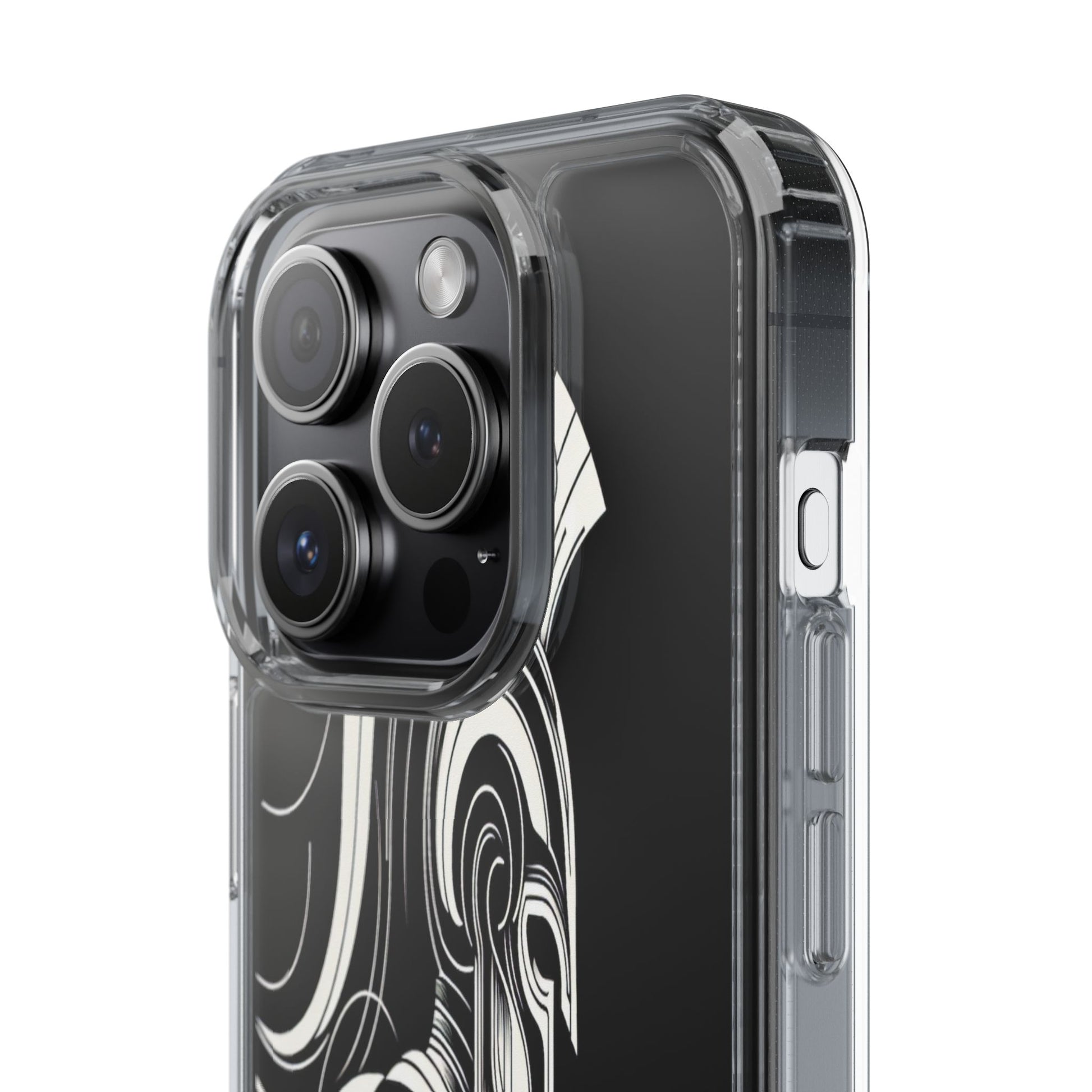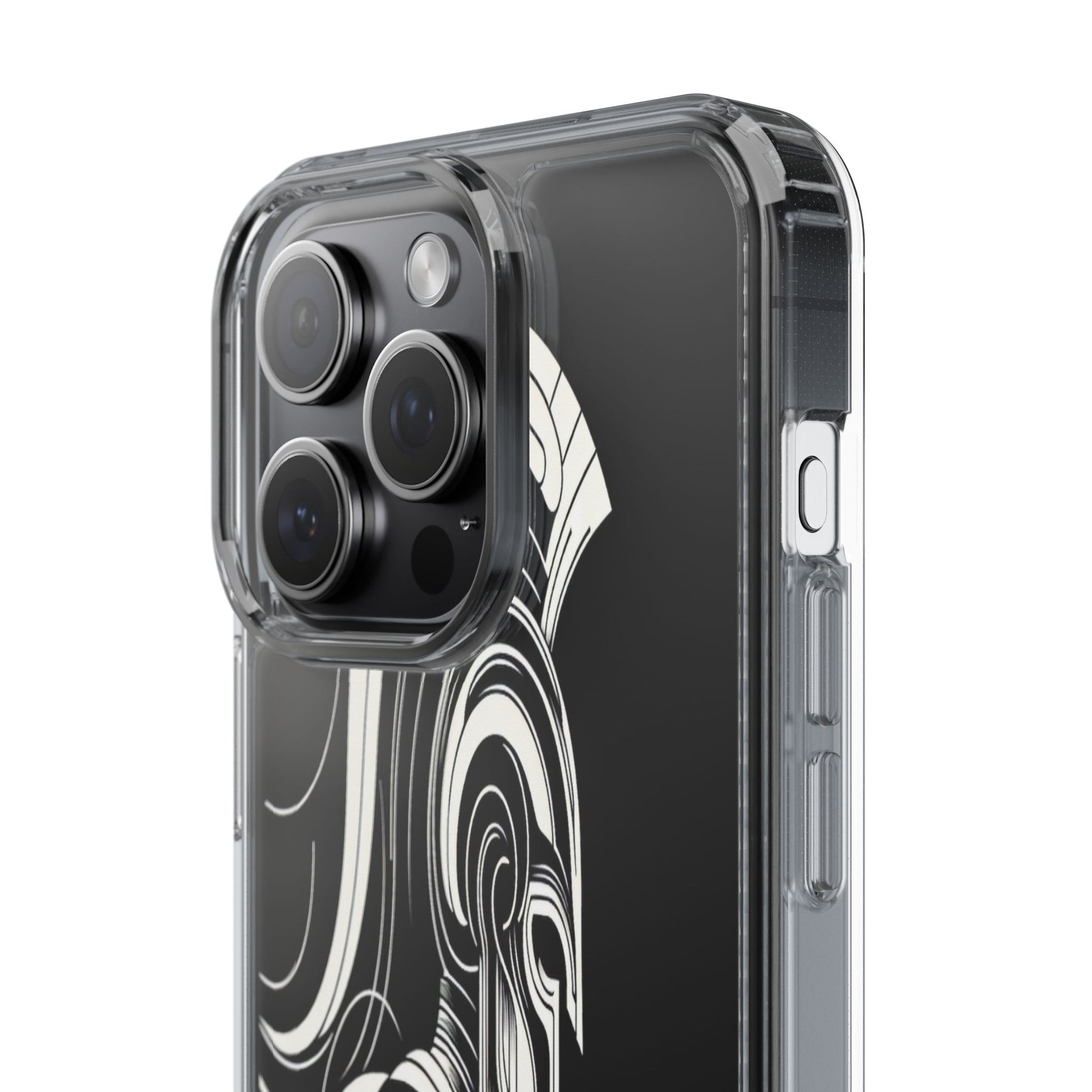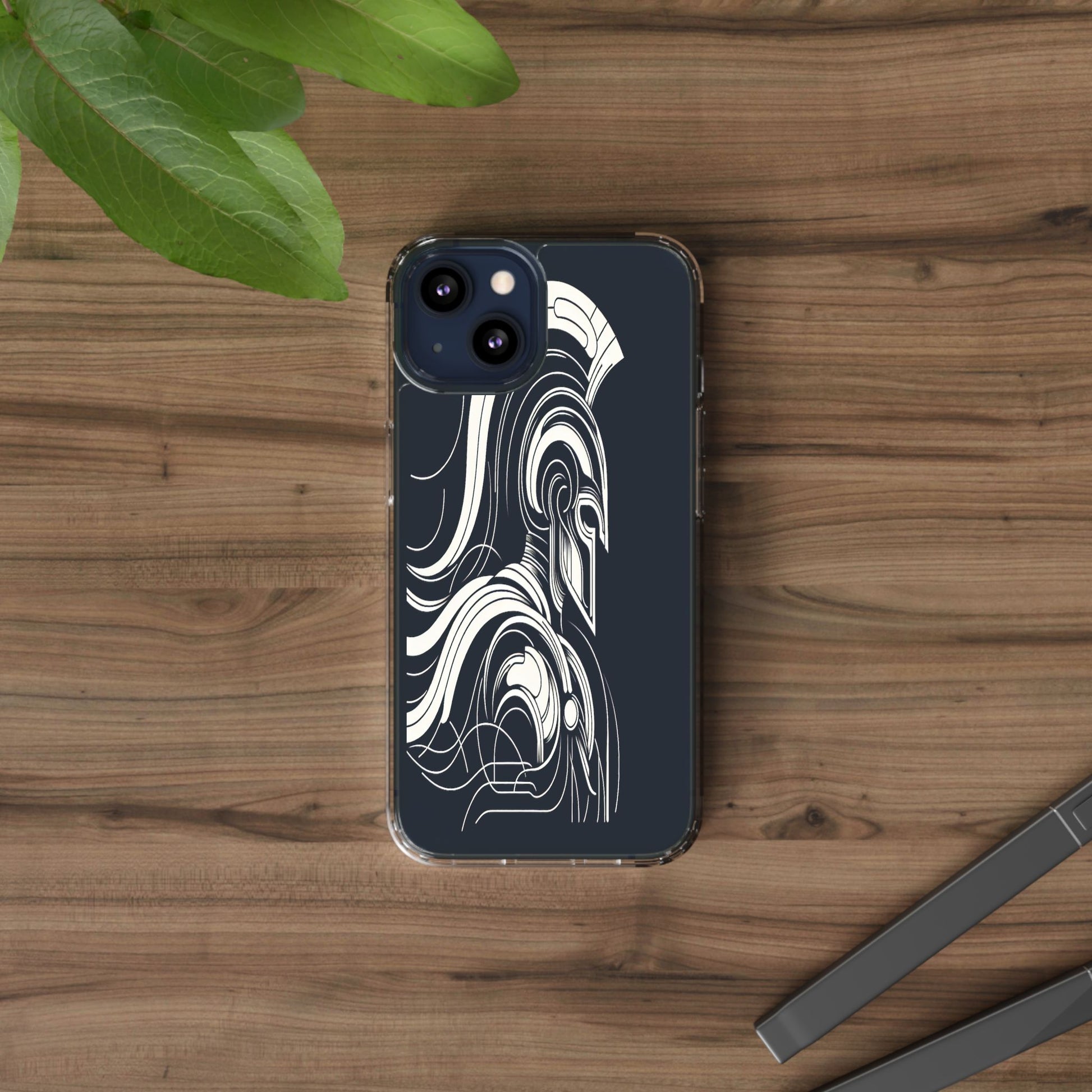 A striking silhouette of a futuristic warrior, crafted with elegant, flowing lines. The intricate design combines traditional armor aesthetics with a modern, abstract twist, creating a sense of movement and strength. Protect your phone while showcasing its sleek design with our customizable clear phone case, designed to fit iPhones from the latest iPhone 16 to earlier models like iPhone XR, XS, and X. This slim and lightweight case is perfect for guarding against daily wear and tear, offering shock-absorbing and scratch-resistant protection.