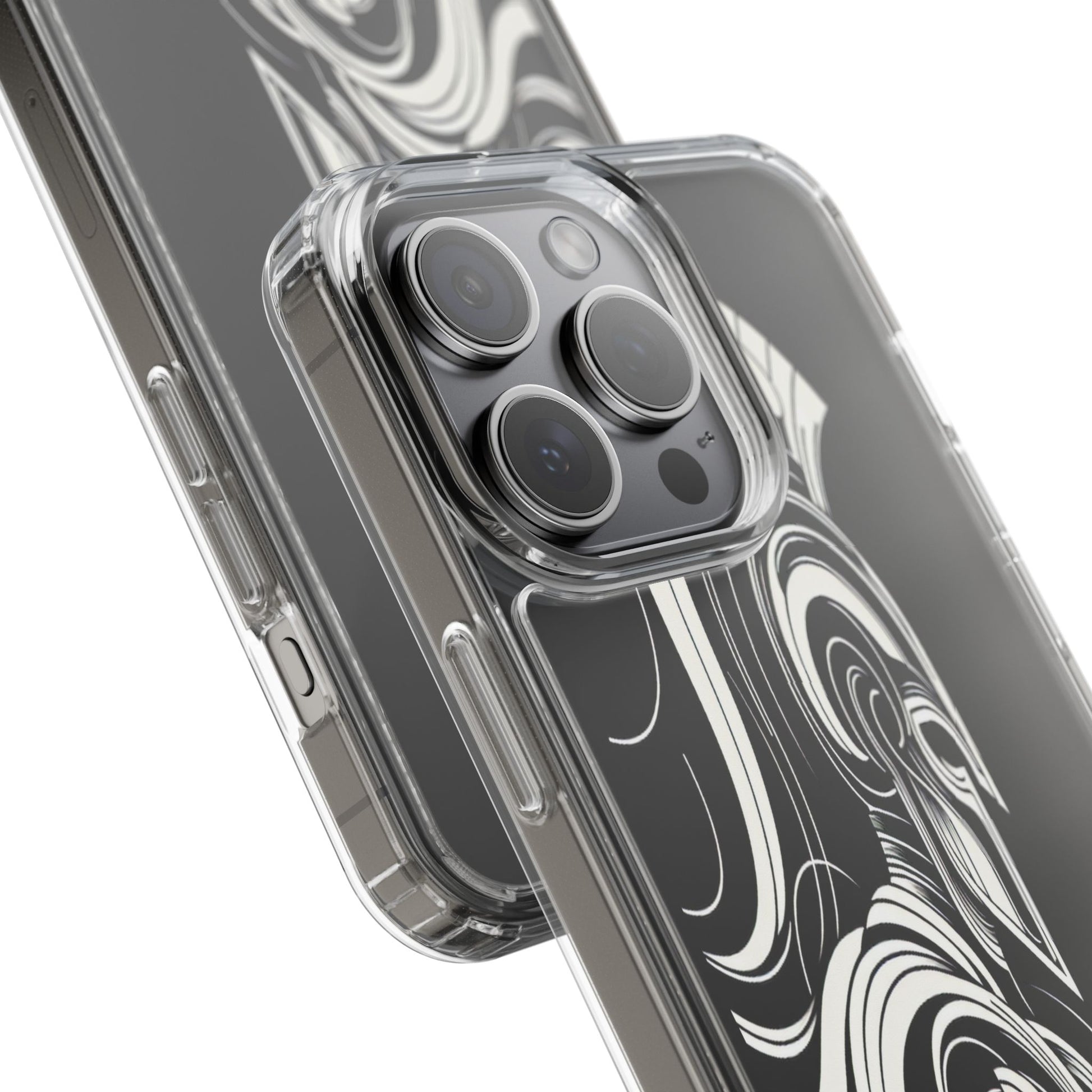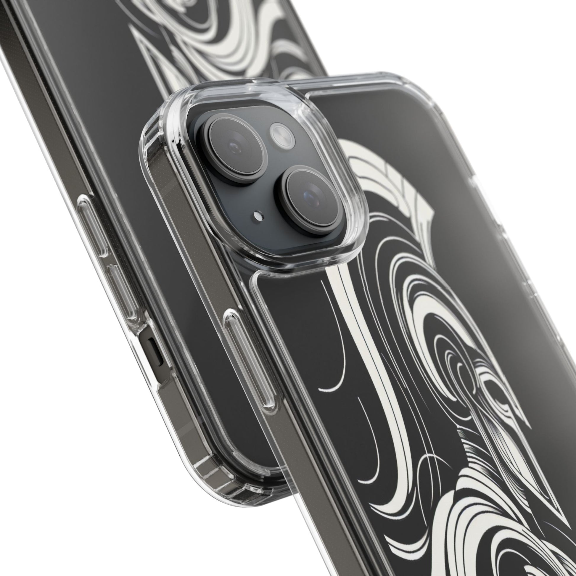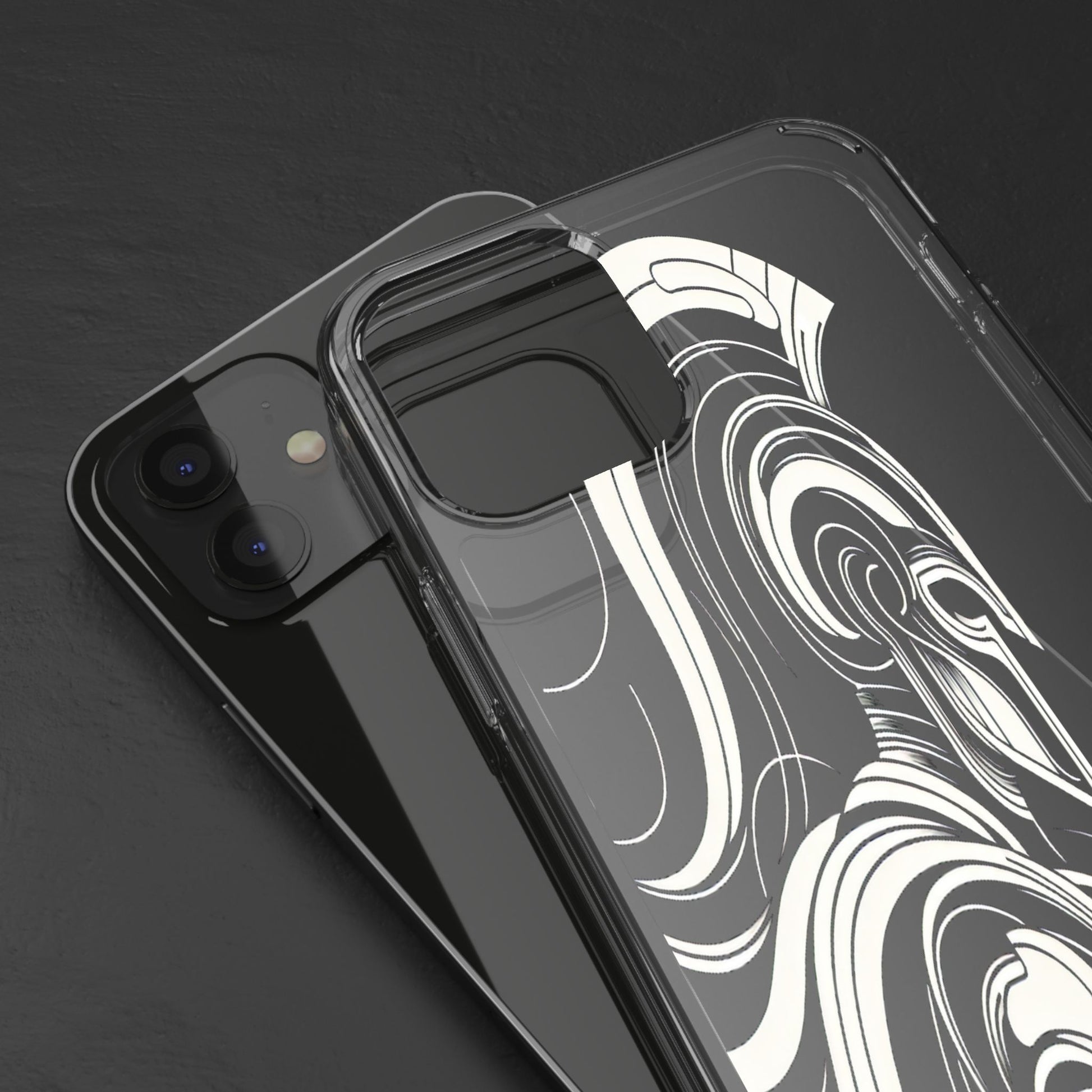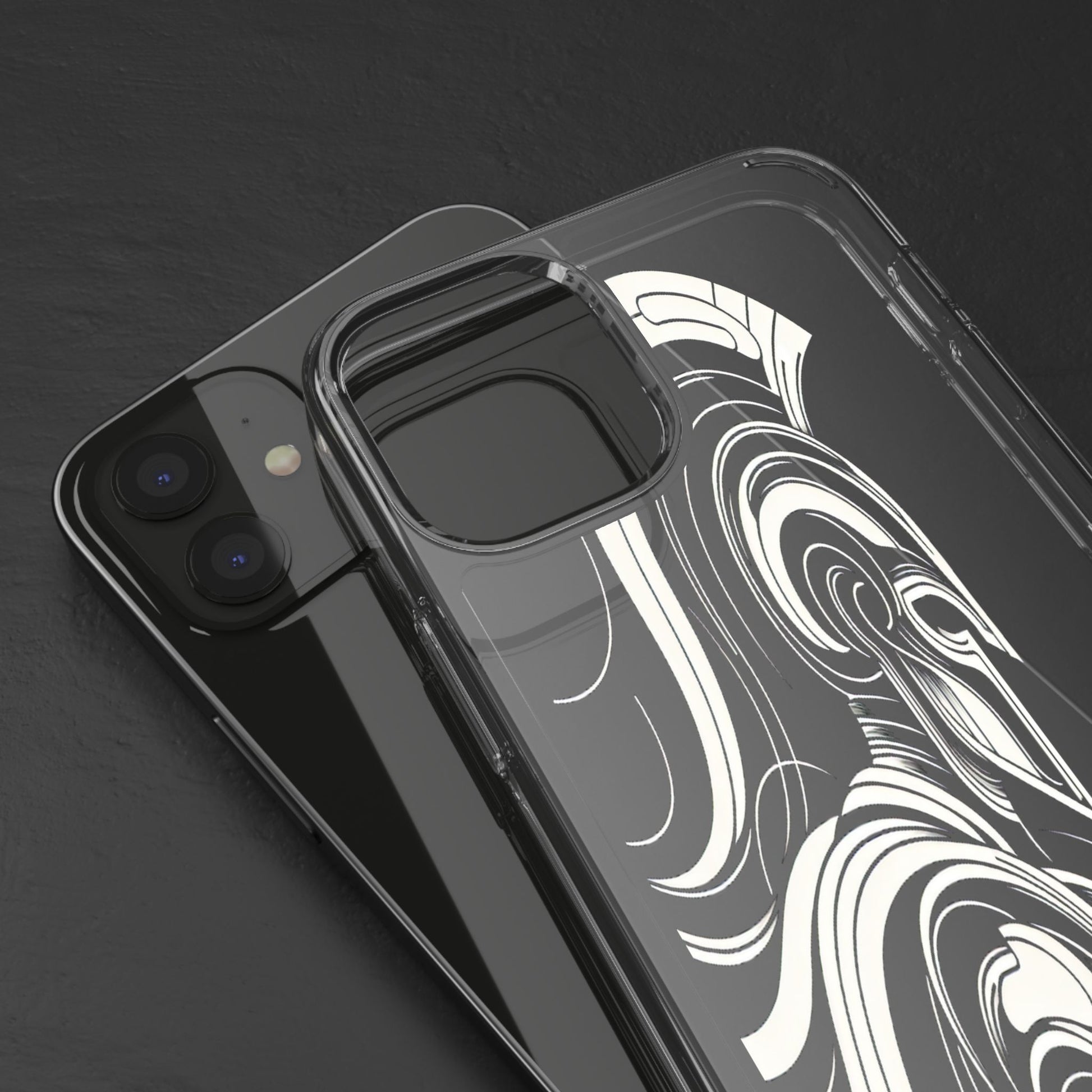 A striking silhouette of a futuristic warrior, crafted with elegant, flowing lines. The intricate design combines traditional armor aesthetics with a modern, abstract twist, creating a sense of movement and strength. Protect your phone while showcasing its sleek design with our customizable clear phone case, designed to fit iPhones from the latest iPhone 16 to earlier models like iPhone XR, XS, and X. This slim and lightweight case is perfect for guarding against daily wear and tear, offering shock-absorbing and scratch-resistant protection.