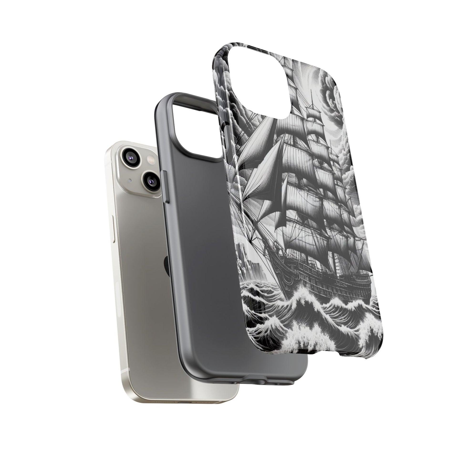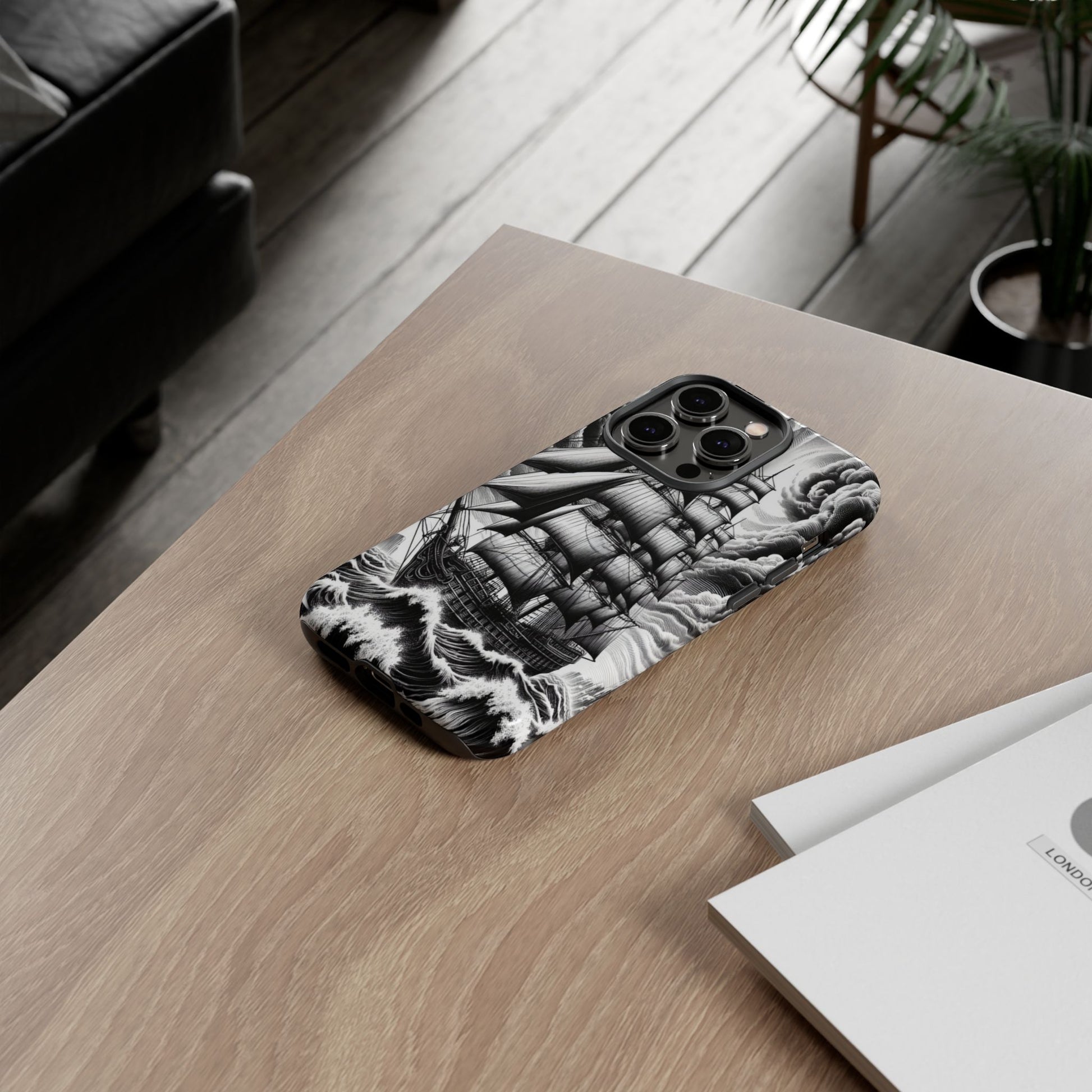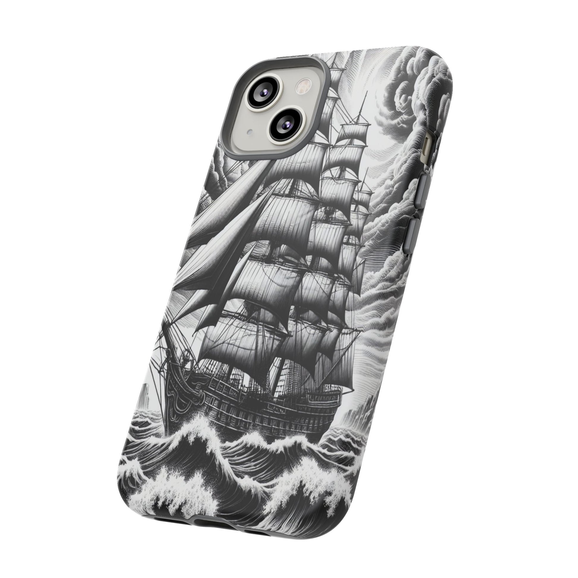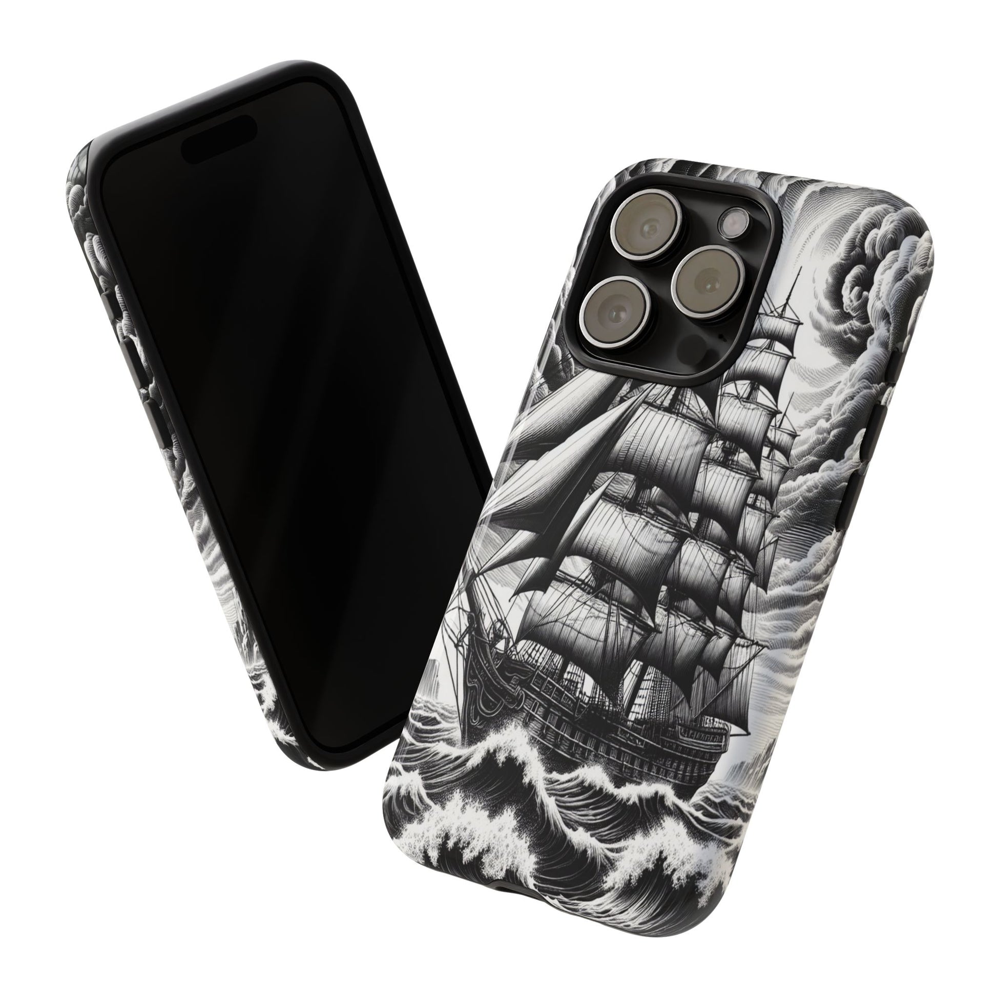 A monochromatic masterpiece, this artwork depicts a grand ship braving tumultuous seas. Dynamic linework creates dramatic waves and swirling clouds, exuding power and movement. The intricate details in the sails and ship's structure add depth and intensity, embodying the timeless struggle between man and nature. iPhone, Samsung Galaxy, and Google Pixel devices with premium-quality custom protective phone cases. Every case has double layers for extra durability and protection while the clear, open ports stay out of your way when it comes to charging. The outer polycarbonate shell will resist daily impacts. Choose between matte or glossy finish and enjoy adding a unique touch to your phone with our custom protective phone cases sourced from Korea.