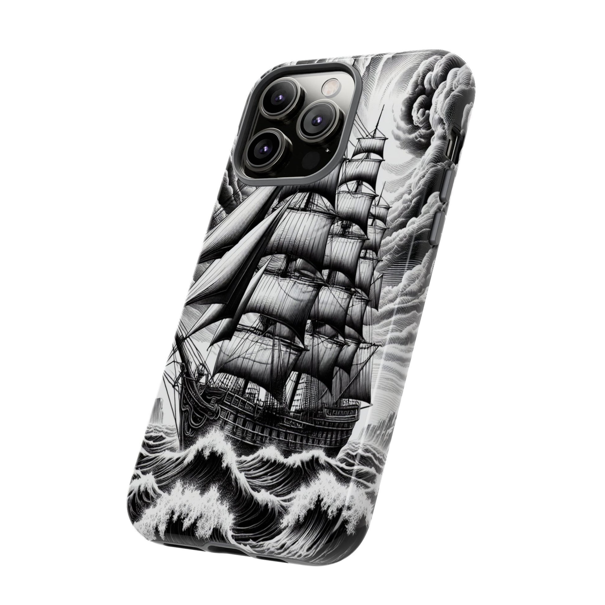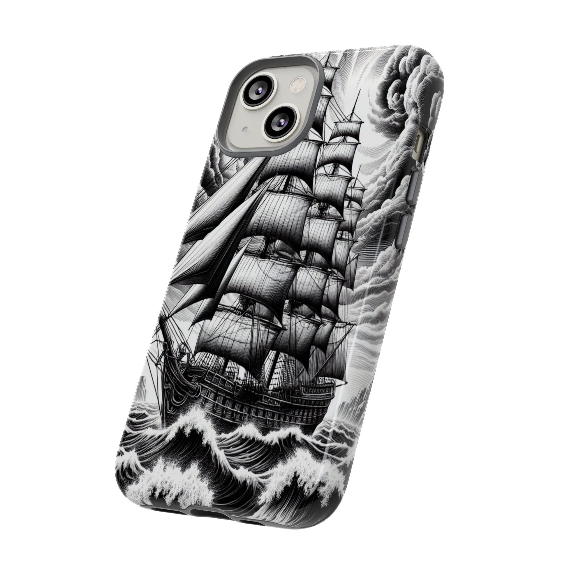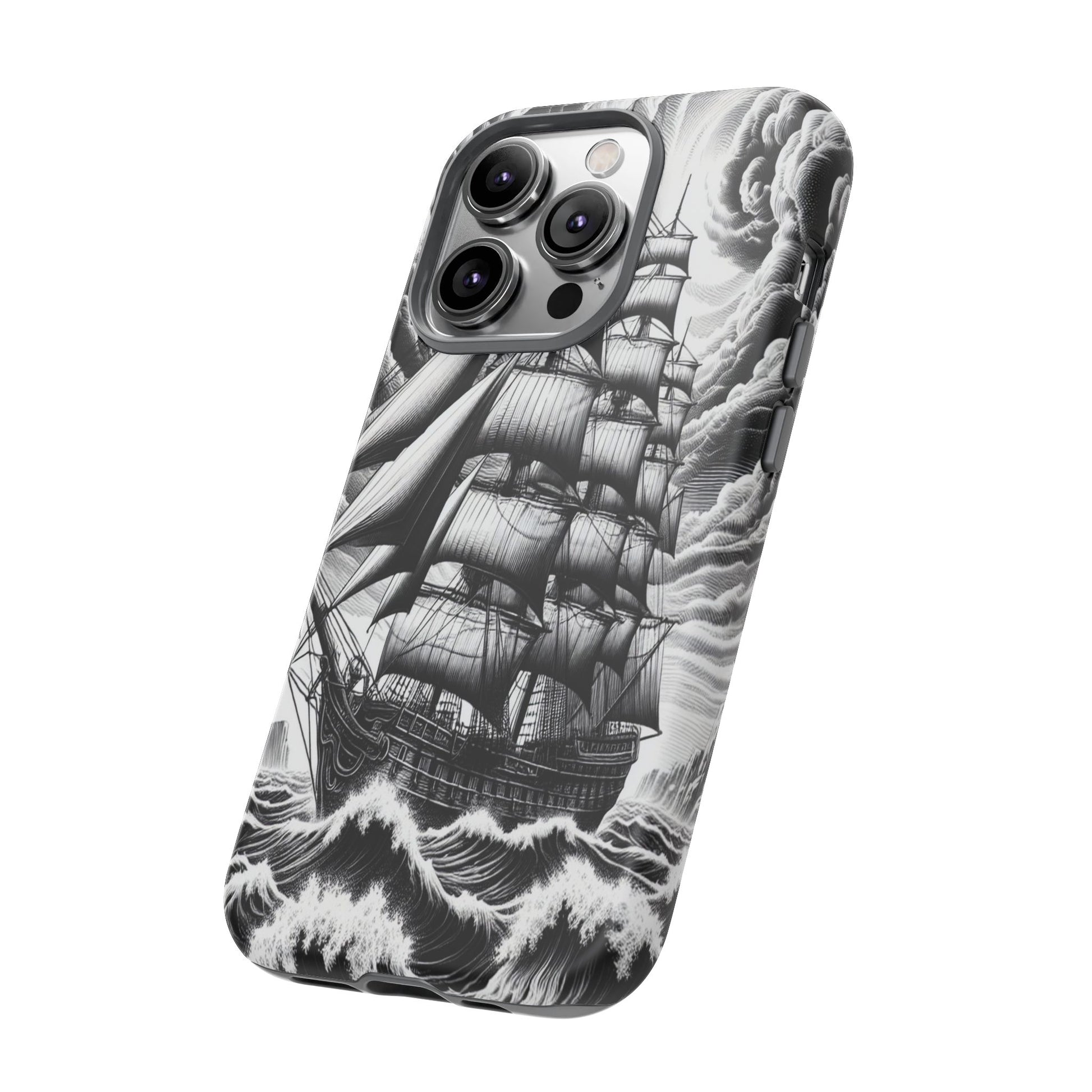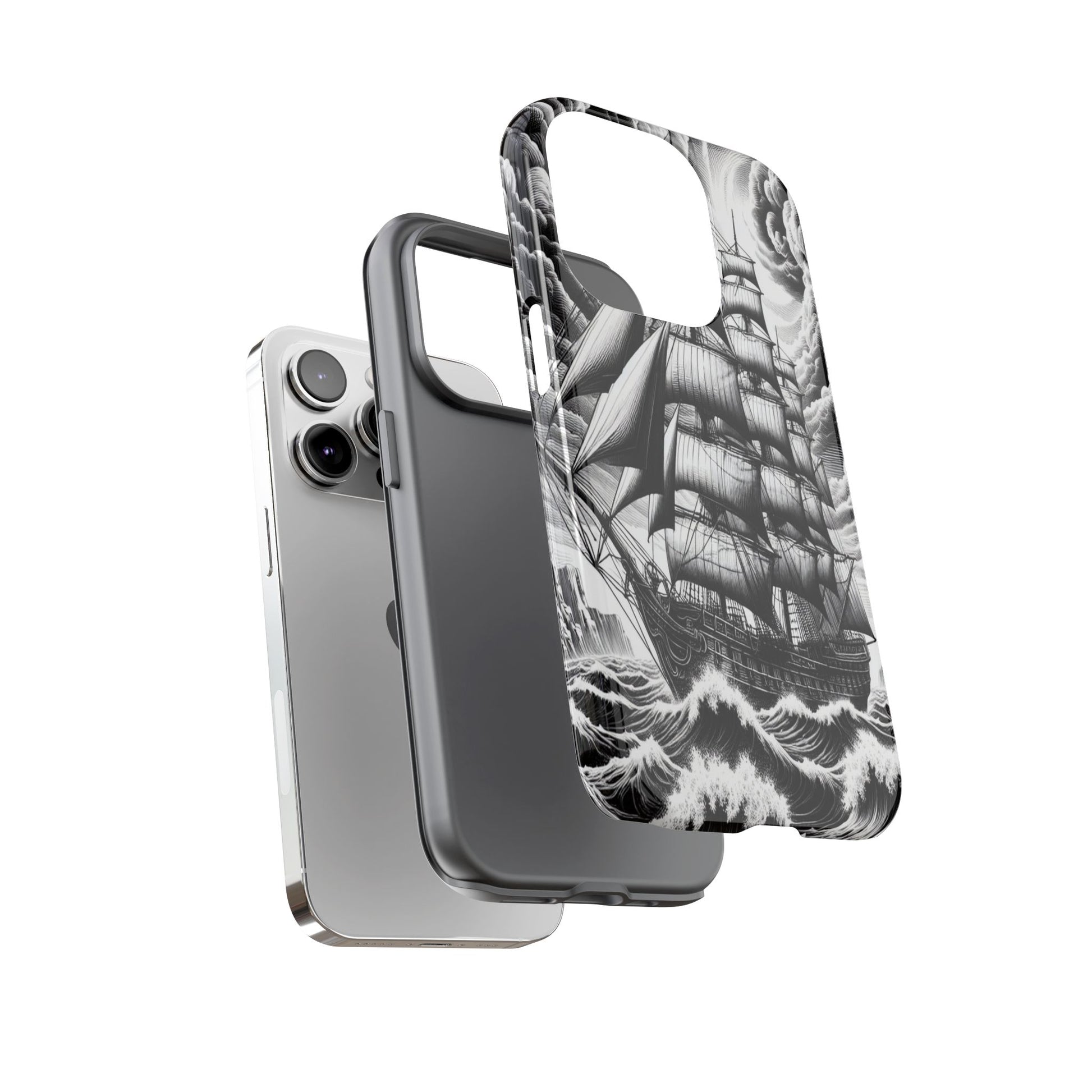 A monochromatic masterpiece, this artwork depicts a grand ship braving tumultuous seas. Dynamic linework creates dramatic waves and swirling clouds, exuding power and movement. The intricate details in the sails and ship's structure add depth and intensity, embodying the timeless struggle between man and nature. iPhone, Samsung Galaxy, and Google Pixel devices with premium-quality custom protective phone cases. Every case has double layers for extra durability and protection while the clear, open ports stay out of your way when it comes to charging. The outer polycarbonate shell will resist daily impacts. Choose between matte or glossy finish and enjoy adding a unique touch to your phone with our custom protective phone cases sourced from Korea.