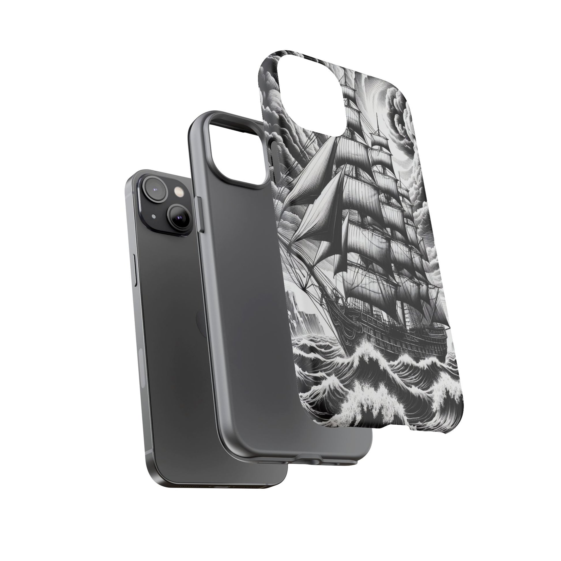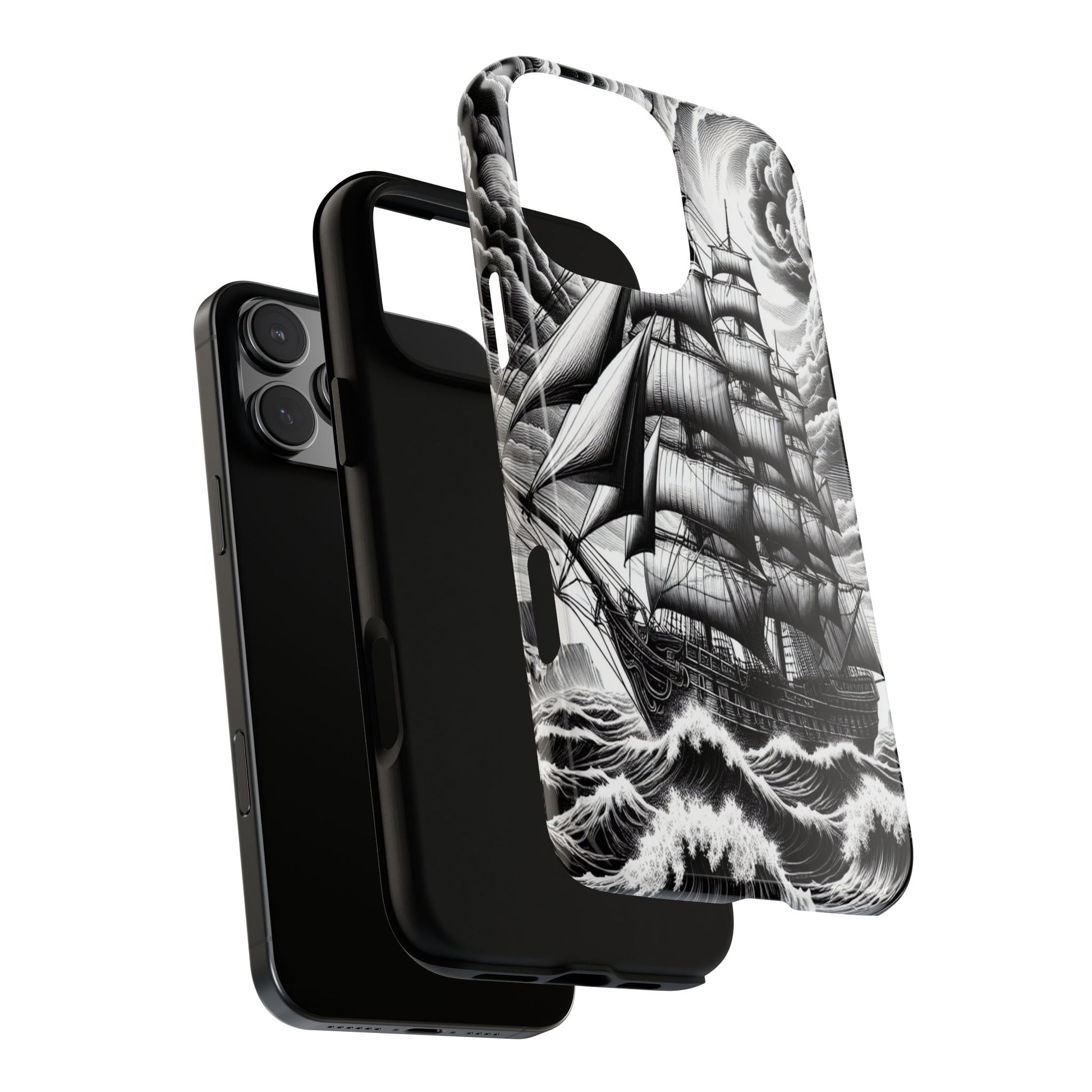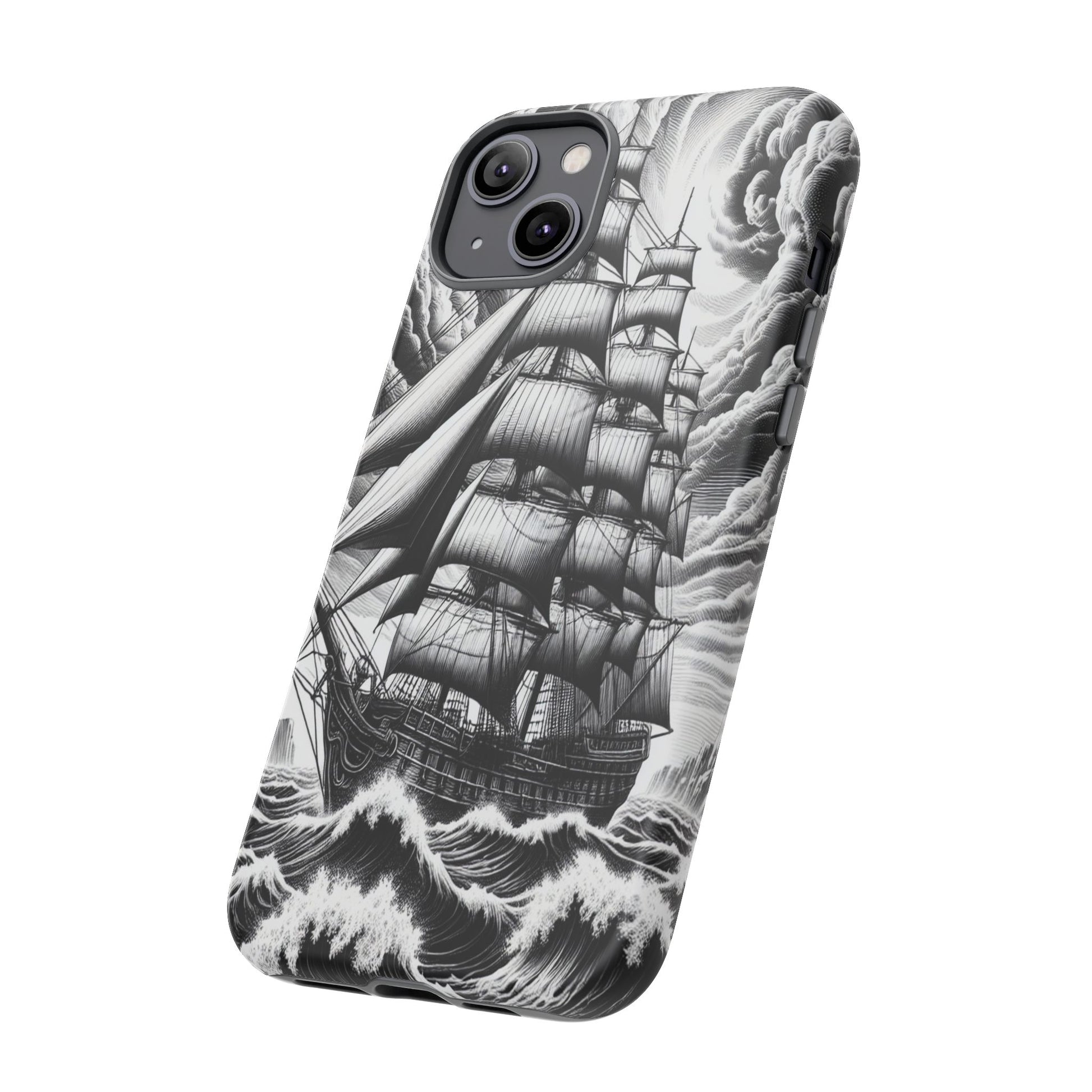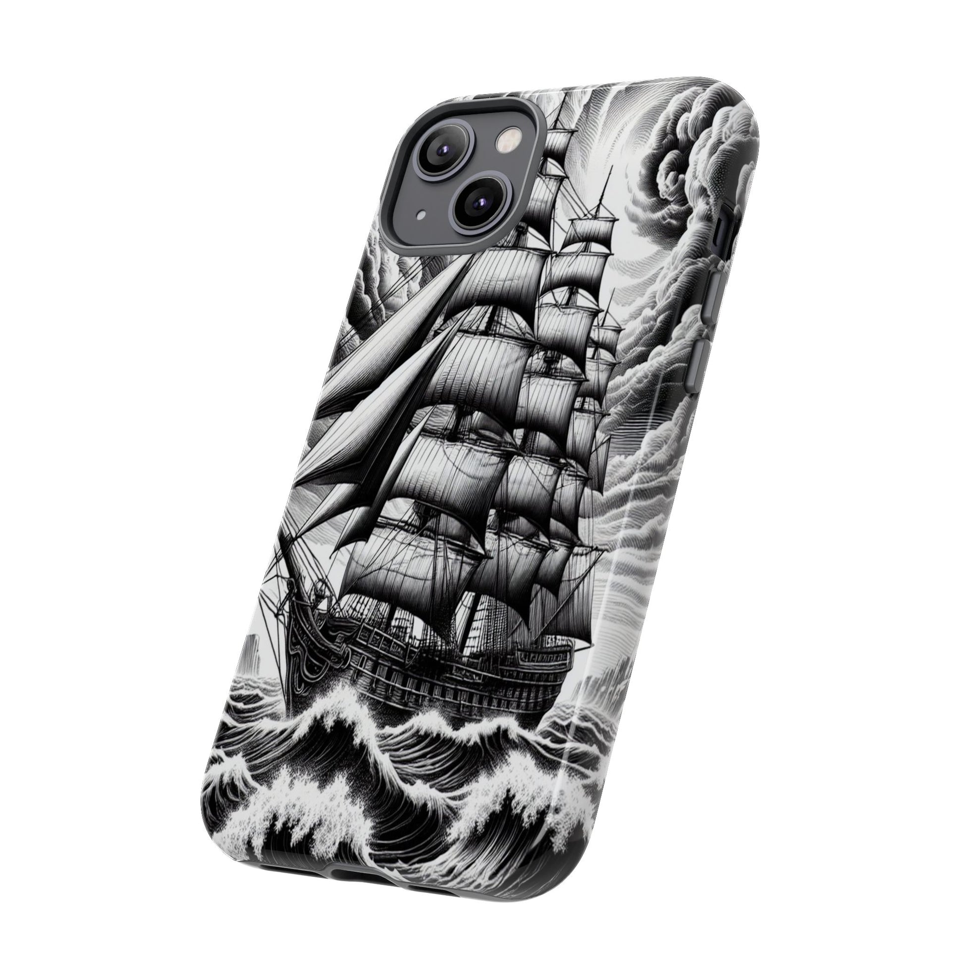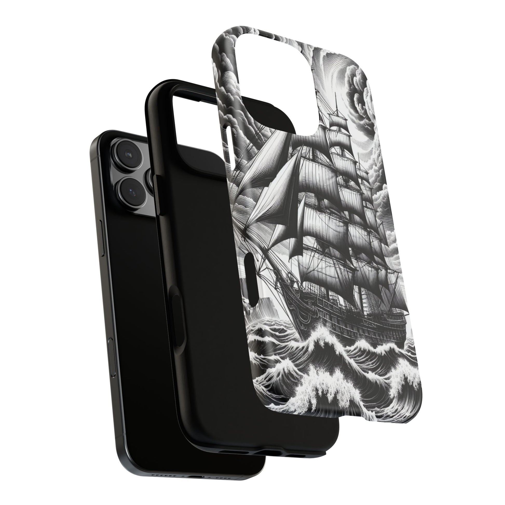 A monochromatic masterpiece, this artwork depicts a grand ship braving tumultuous seas. Dynamic linework creates dramatic waves and swirling clouds, exuding power and movement. The intricate details in the sails and ship's structure add depth and intensity, embodying the timeless struggle between man and nature. iPhone, Samsung Galaxy, and Google Pixel devices with premium-quality custom protective phone cases. Every case has double layers for extra durability and protection while the clear, open ports stay out of your way when it comes to charging. The outer polycarbonate shell will resist daily impacts. Choose between matte or glossy finish and enjoy adding a unique touch to your phone with our custom protective phone cases sourced from Korea.