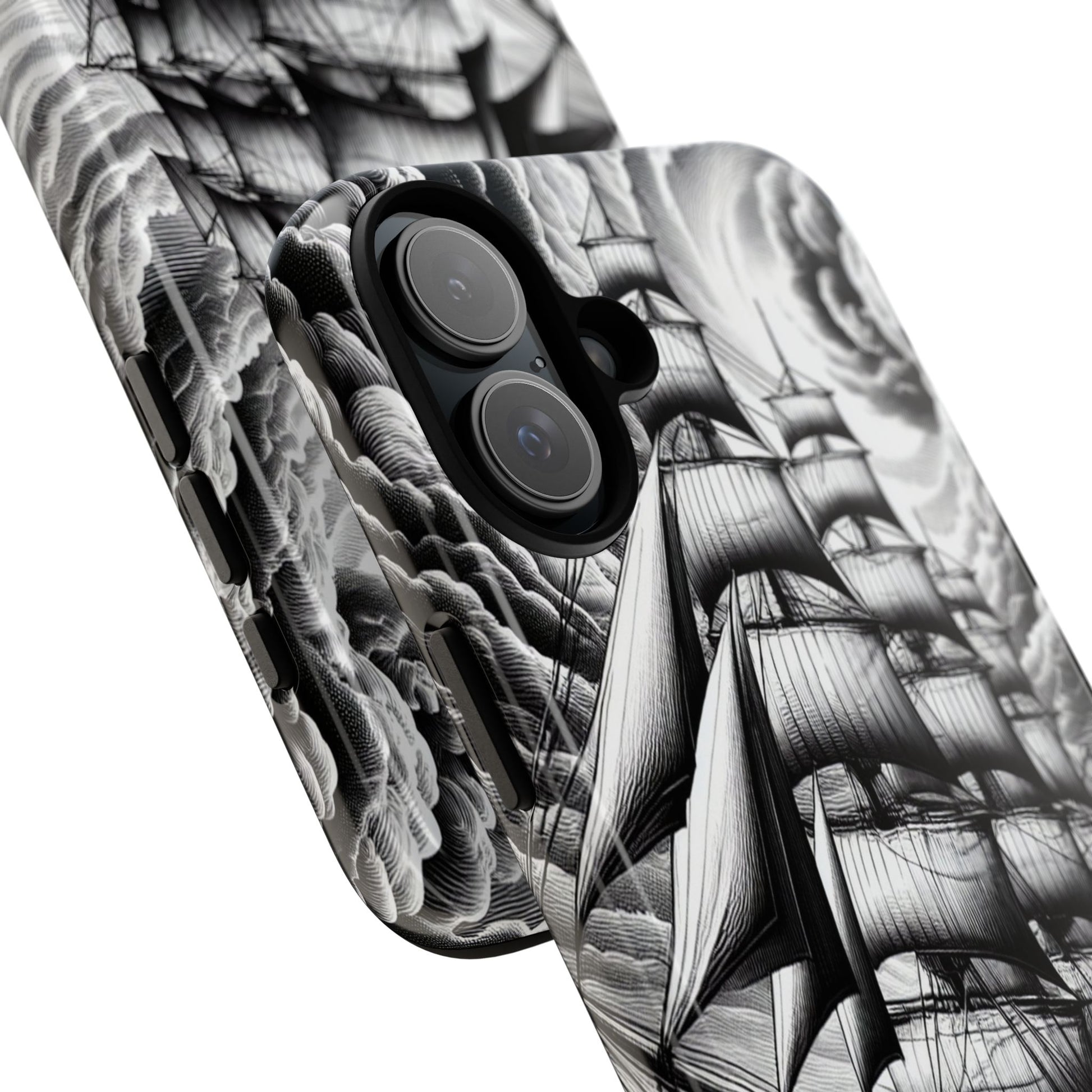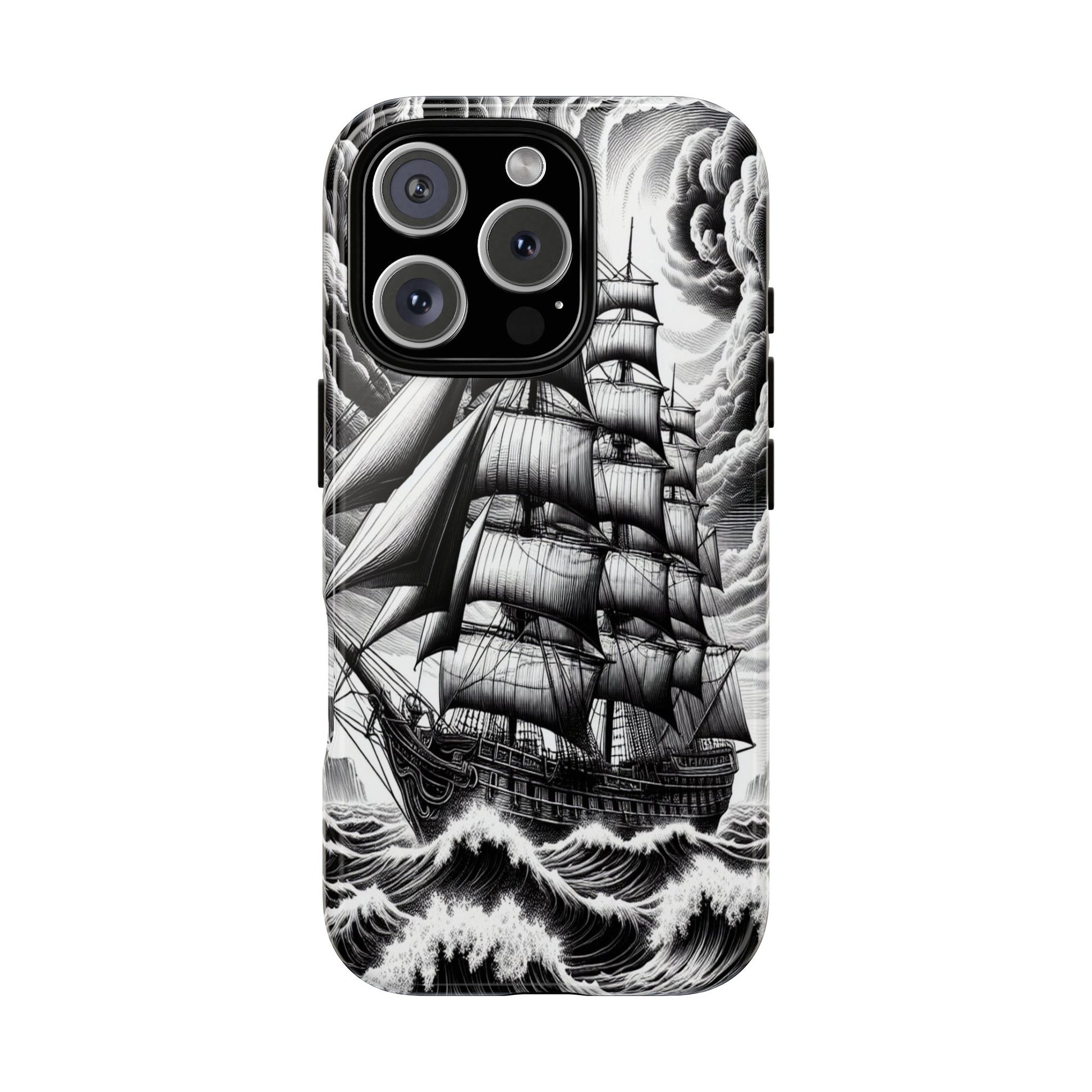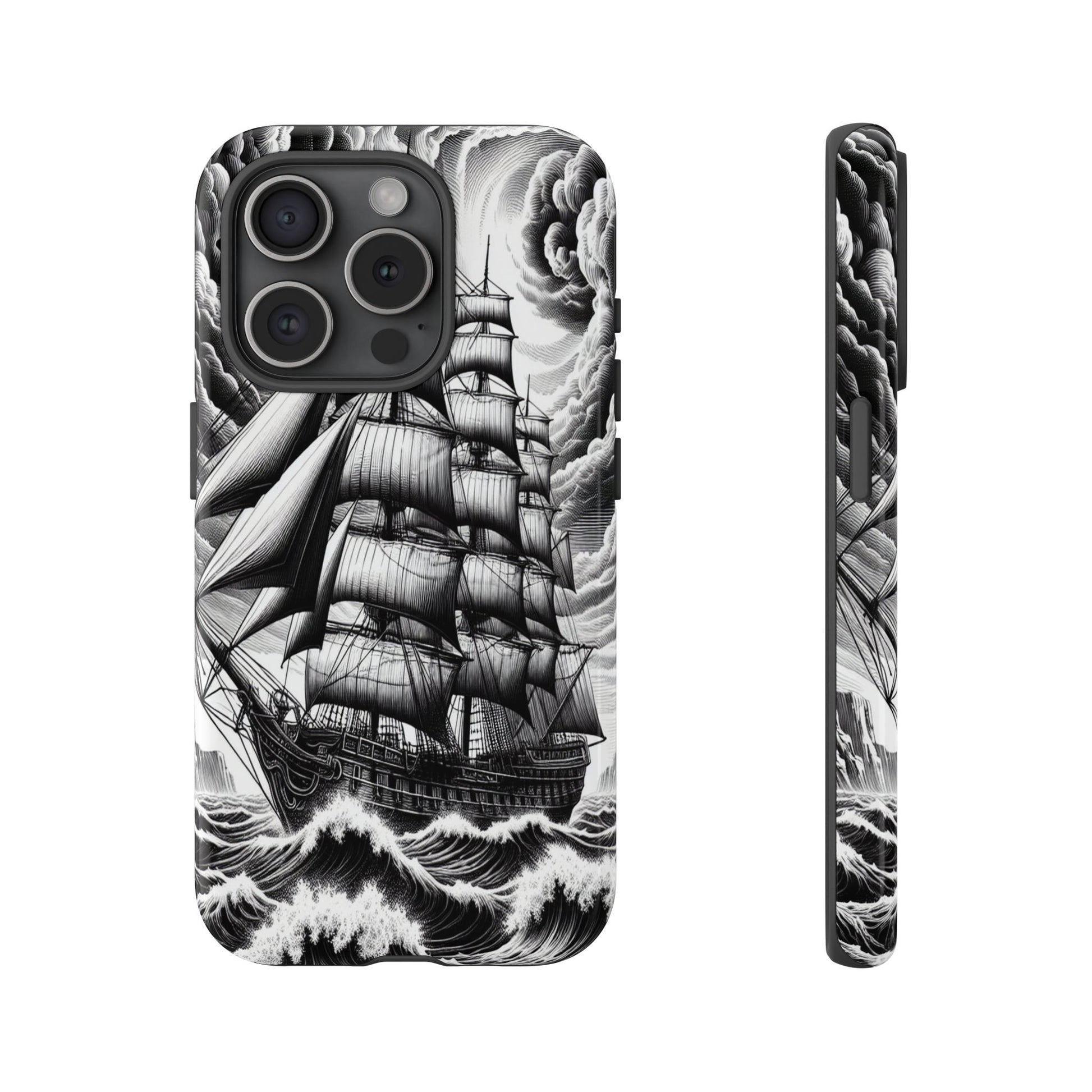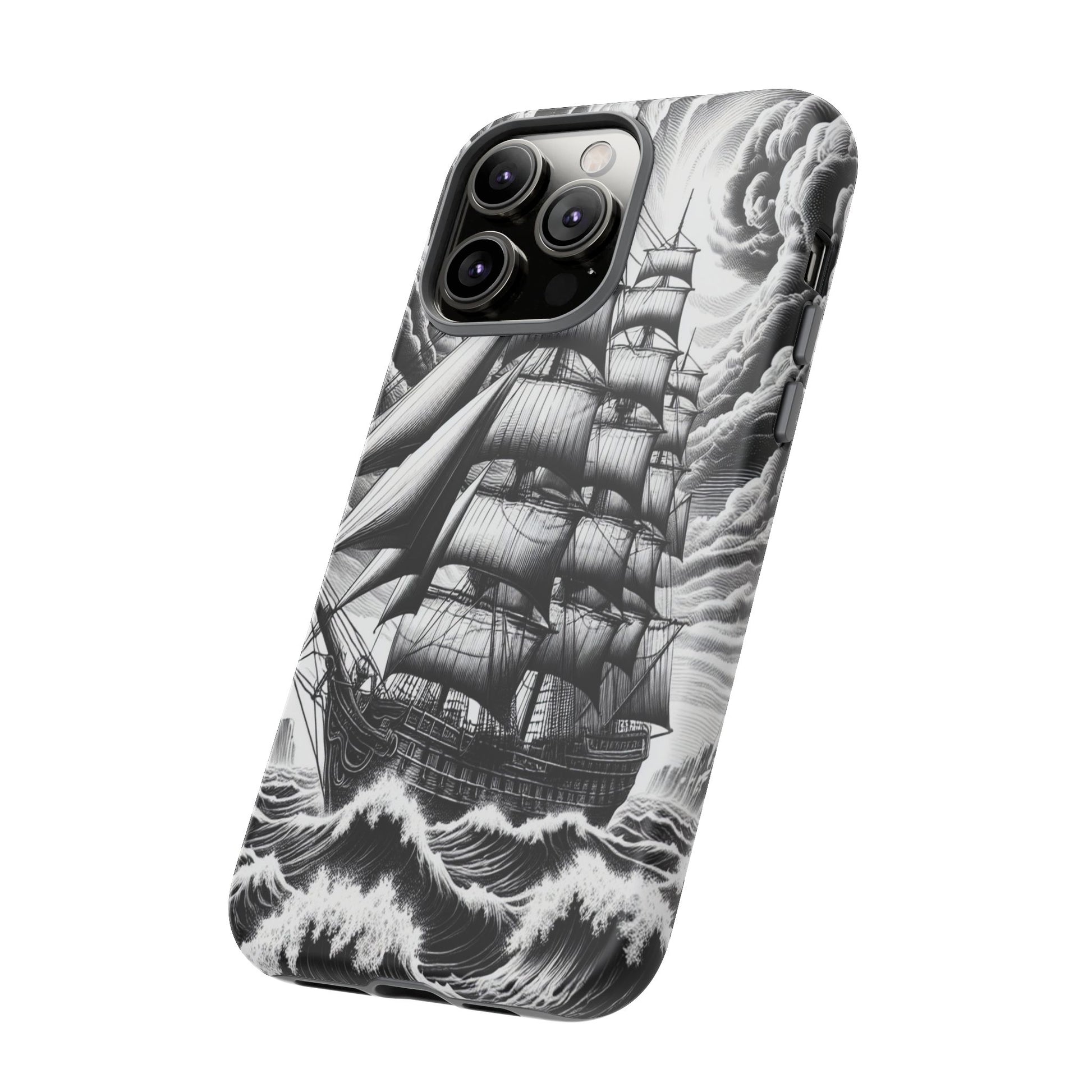 A monochromatic masterpiece, this artwork depicts a grand ship braving tumultuous seas. Dynamic linework creates dramatic waves and swirling clouds, exuding power and movement. The intricate details in the sails and ship's structure add depth and intensity, embodying the timeless struggle between man and nature. iPhone, Samsung Galaxy, and Google Pixel devices with premium-quality custom protective phone cases. Every case has double layers for extra durability and protection while the clear, open ports stay out of your way when it comes to charging. The outer polycarbonate shell will resist daily impacts. Choose between matte or glossy finish and enjoy adding a unique touch to your phone with our custom protective phone cases sourced from Korea.