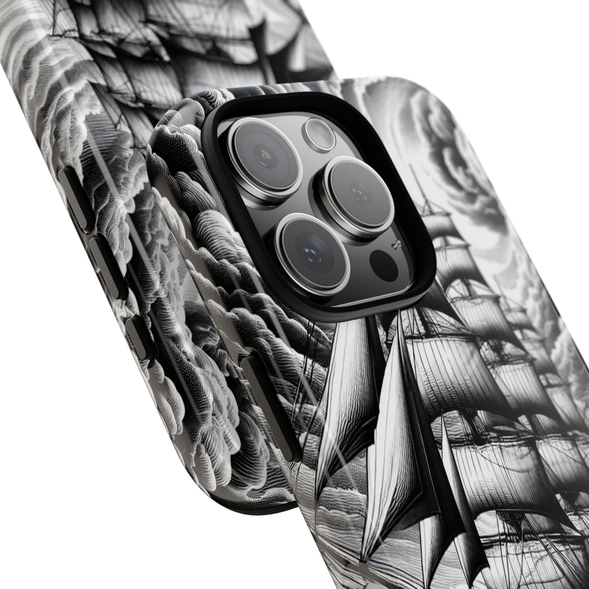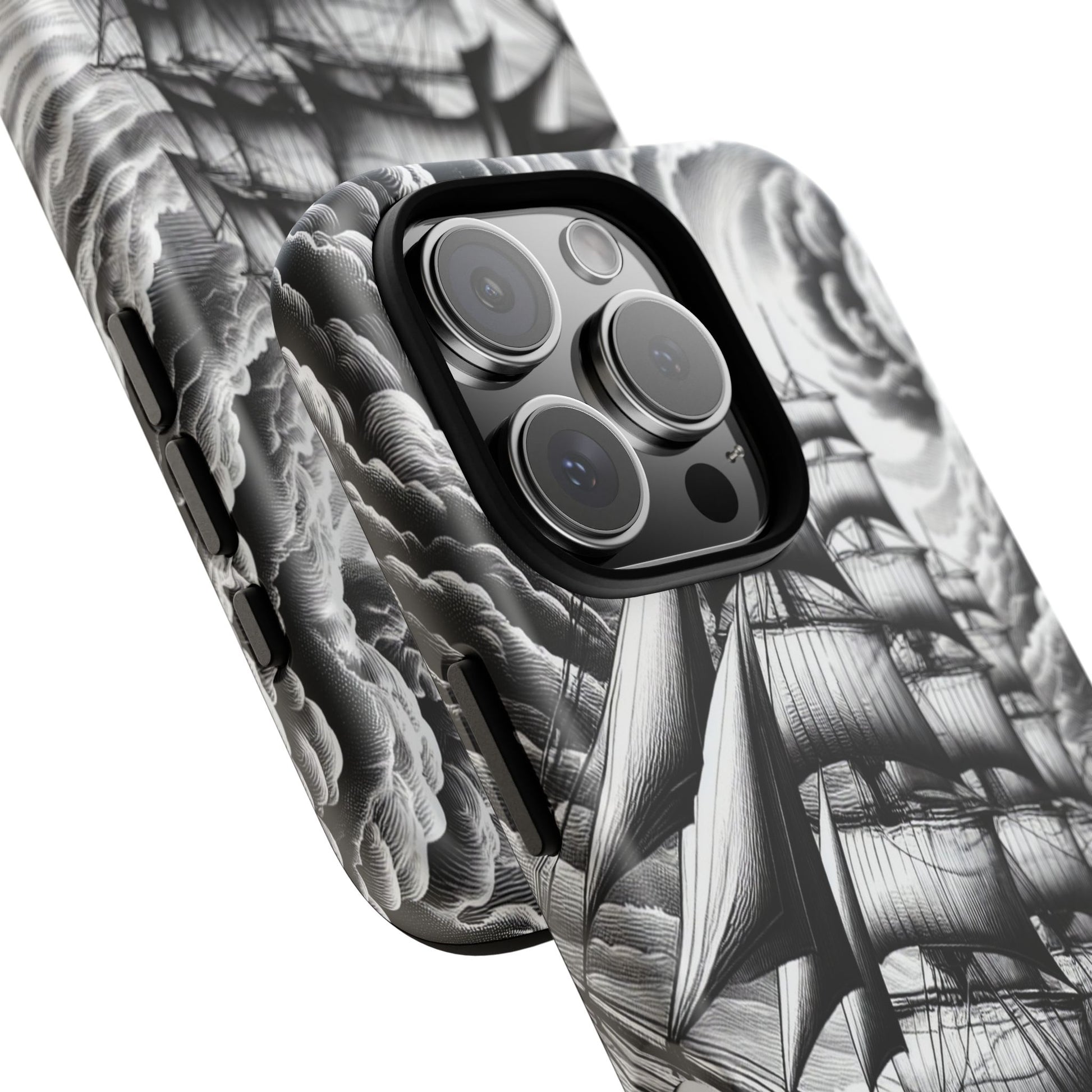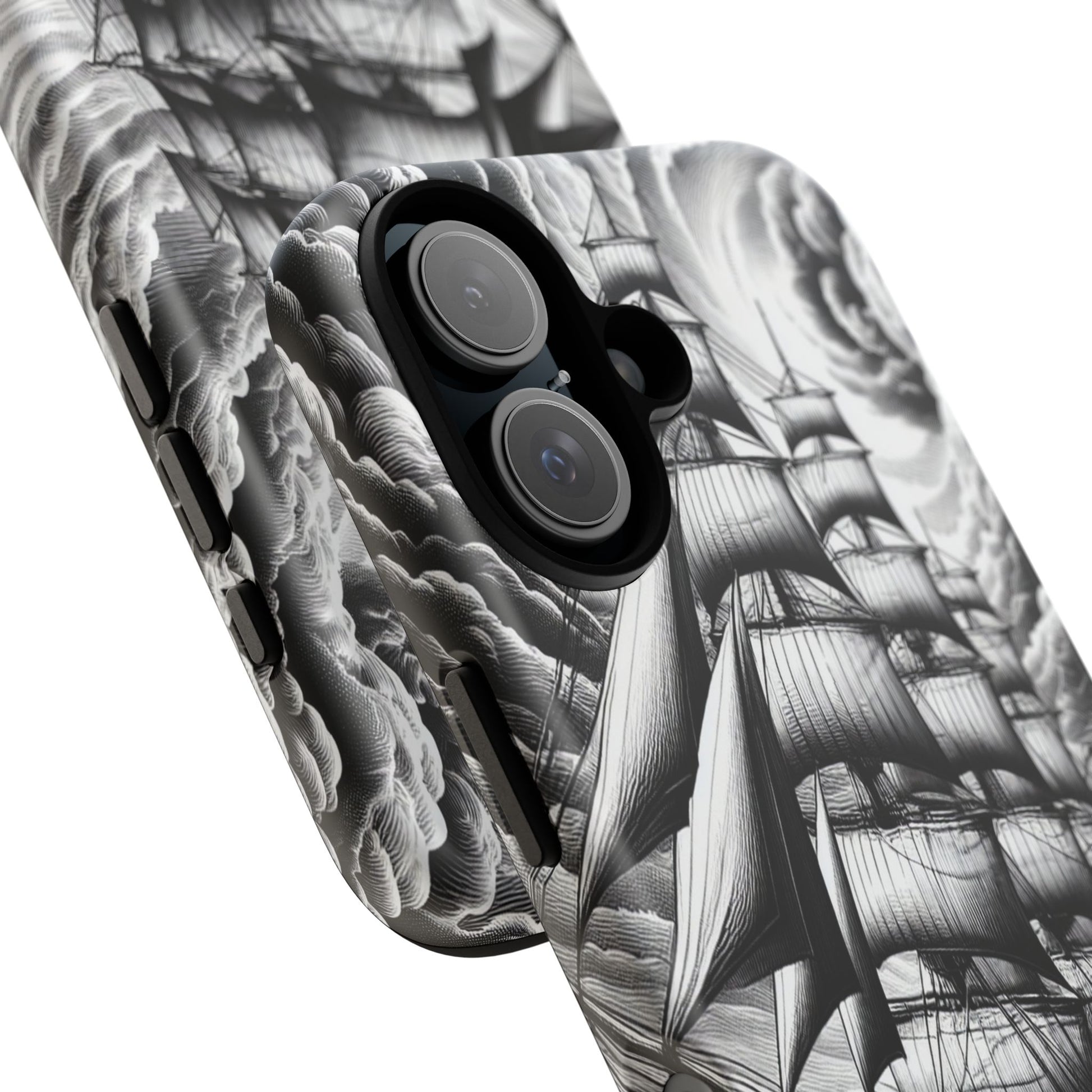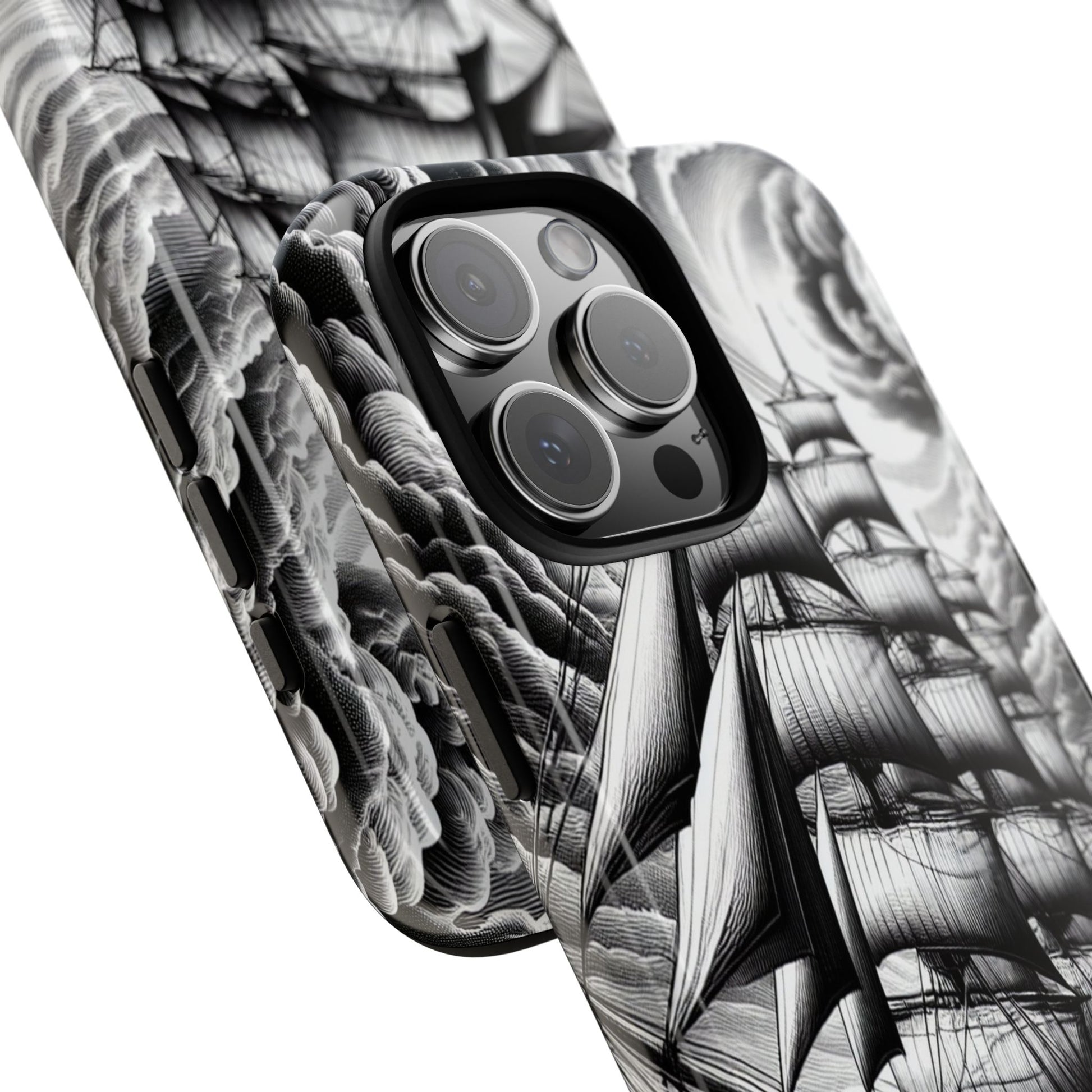 A monochromatic masterpiece, this artwork depicts a grand ship braving tumultuous seas. Dynamic linework creates dramatic waves and swirling clouds, exuding power and movement. The intricate details in the sails and ship's structure add depth and intensity, embodying the timeless struggle between man and nature. iPhone, Samsung Galaxy, and Google Pixel devices with premium-quality custom protective phone cases. Every case has double layers for extra durability and protection while the clear, open ports stay out of your way when it comes to charging. The outer polycarbonate shell will resist daily impacts. Choose between matte or glossy finish and enjoy adding a unique touch to your phone with our custom protective phone cases sourced from Korea.