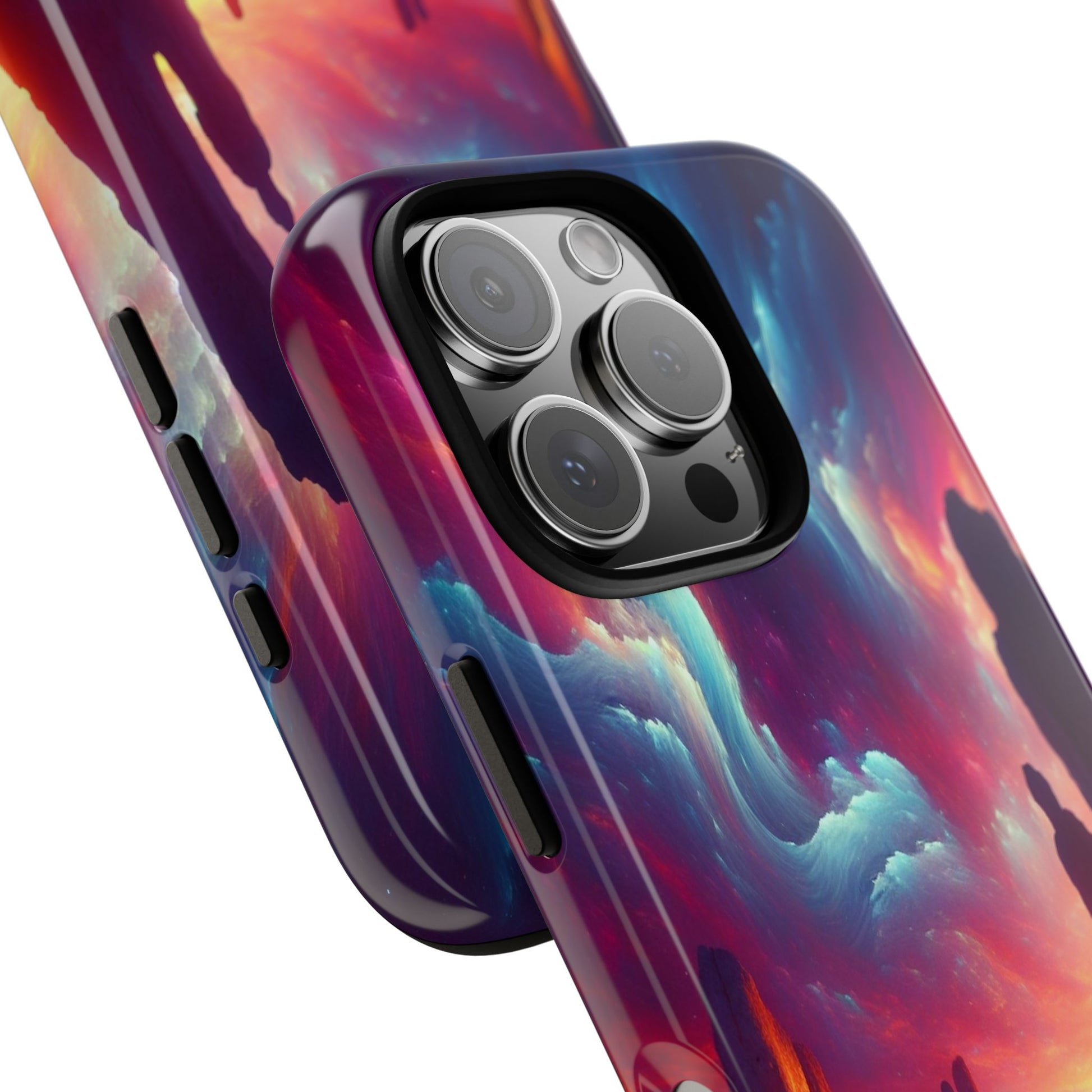 A surreal landscape with towering rock formations under a vibrant, swirling sky of blues, pinks, and oranges. A lone figure stands in awe, enhancing the sense of wonder and cosmic majesty. iPhone, Samsung Galaxy, and Google Pixel devices with premium-quality custom protective phone cases. Every case has double layers for extra durability and protection while the clear, open ports stay out of your way when it comes to charging. The outer polycarbonate shell will resist daily impacts. Choose between matte or glossy finish and enjoy adding a unique touch to your phone with our custom protective phone cases sourced from Korea. .: Custom protective phone cases made with 100% polycarbonate (shell), 100% TPU (lining) .: Dual layer case for extra durability and protection .: Supports wireless charging (not including MagSafe) .: All custom protective phone cases come in a glossy or matte finish .: Clear, open ports for connectivity .: Blank product sourced from South Korea