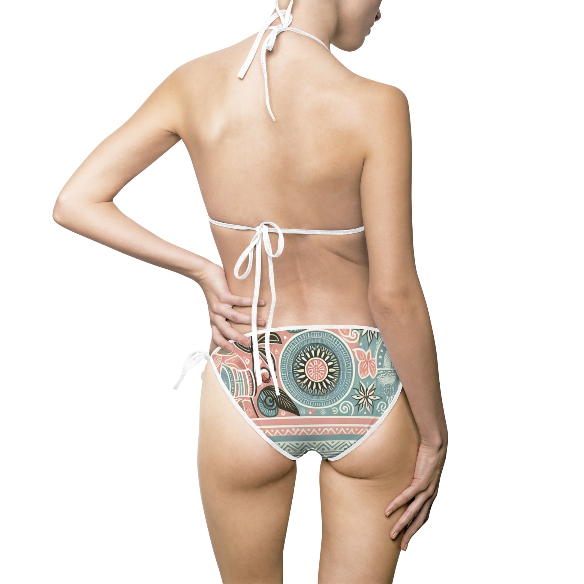 The image presents a colorful, folkloric pattern strip with a harmonious blend of floral motifs, geometric forms, and ethnic symbols, rendered in a soothing pastel color palette, creating a sense of warm, artisanal charm. This bikini swimsuit is designed for fashionable women, it is stylish with a personalized touch. Because of an advanced heat sublimation technique, it will not fade in water.