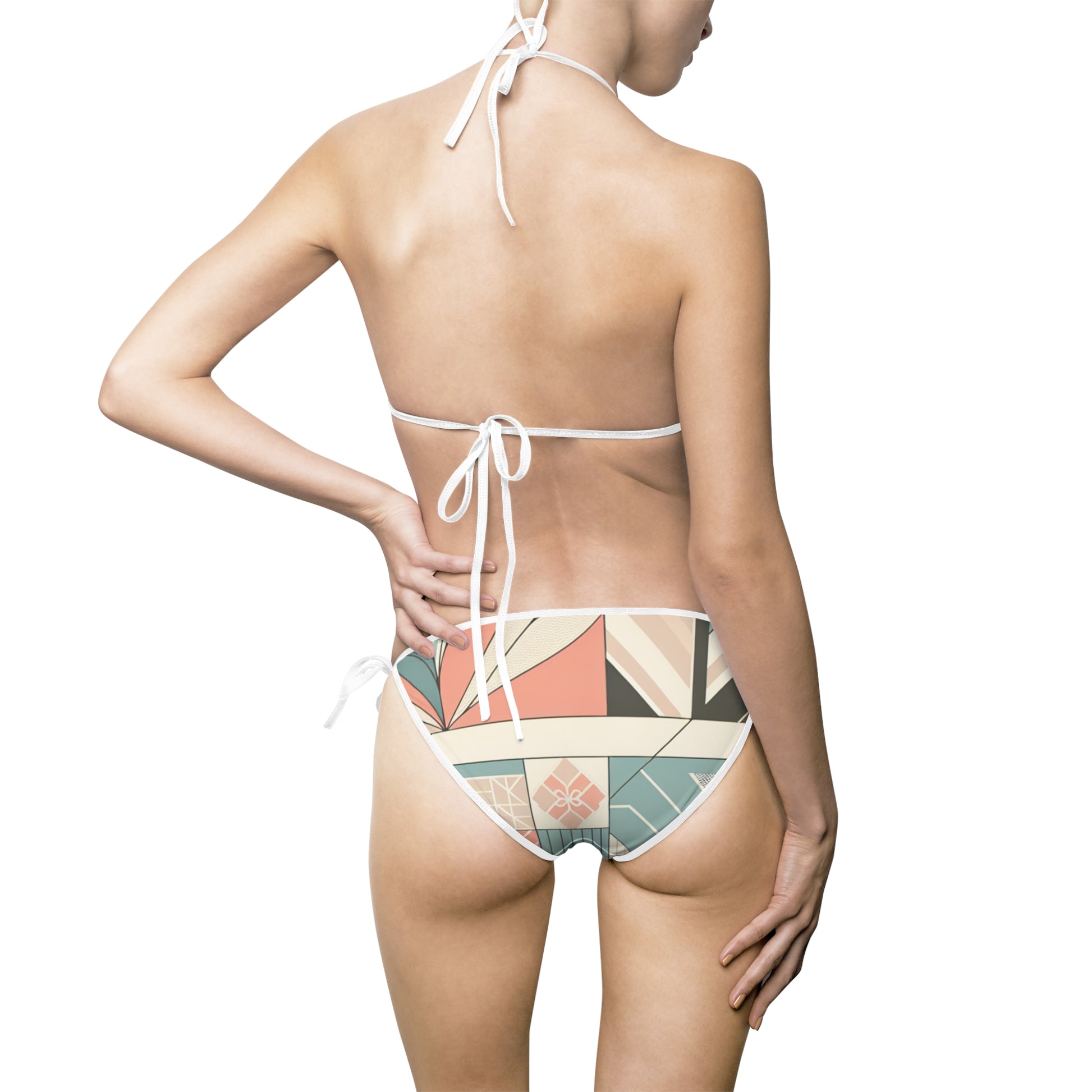A harmonious geometric and organic shapes design boasting a pastel color palette, evoking a modern art deco aesthetic with stylized botanical touches. This bikini swimsuit is designed for fashionable women, it is stylish with a personalized touch. Because of an advanced heat sublimation technique, it will not fade in water.