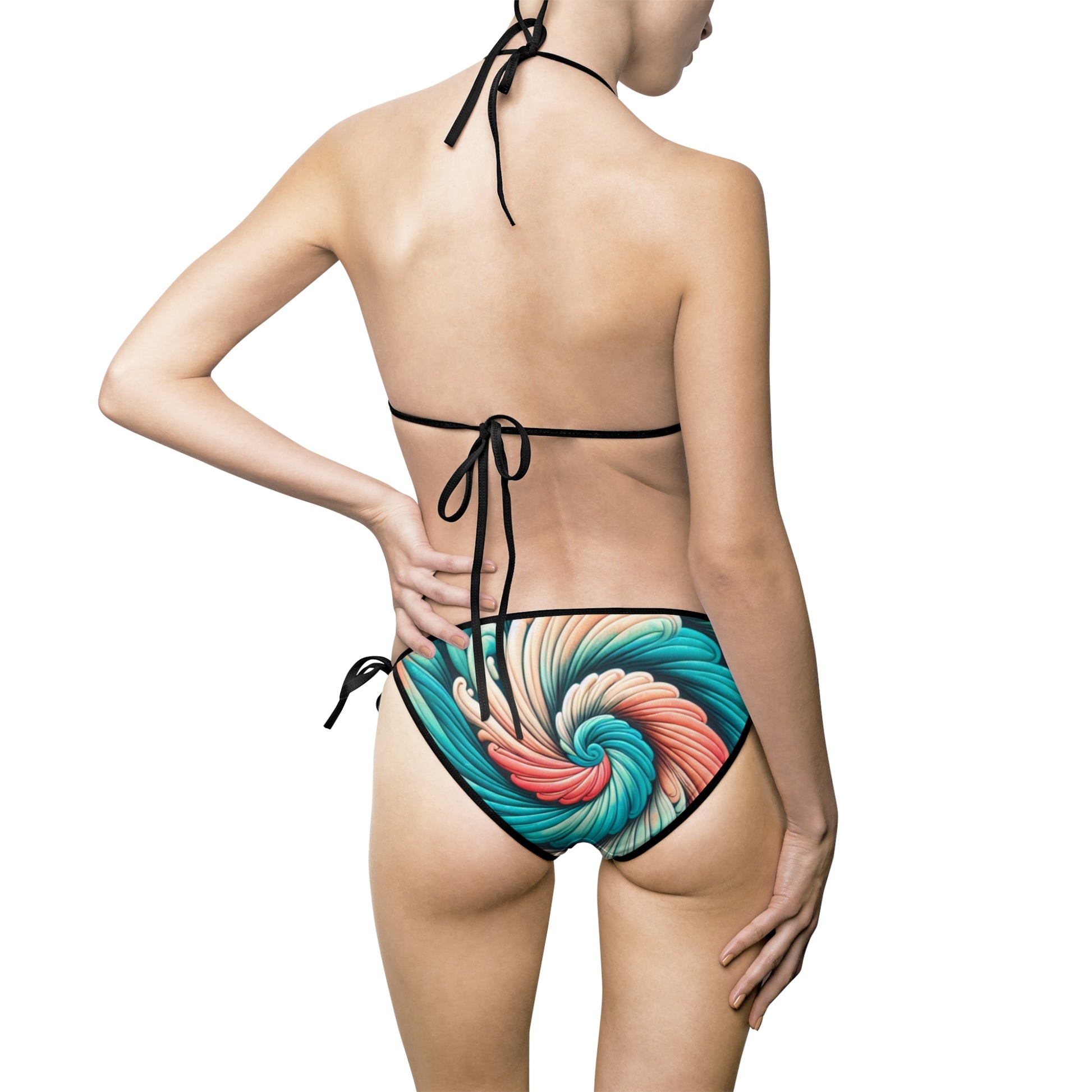 This image features a mesmerizing swirl of pastel-hued ribbons, artfully intertwined with an organic, almost floral-like symmetry. The smooth gradient of peach and turquoise creates a soothing visual flow, evoking a sense of graceful motion. This bikini swimsuit is designed for fashionable women, it is stylish with a personalized touch. Because of an advanced heat sublimation technique, it will not fade in water.