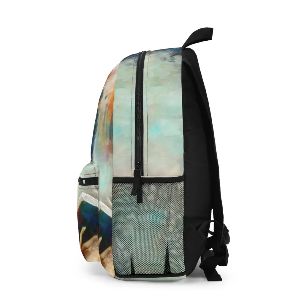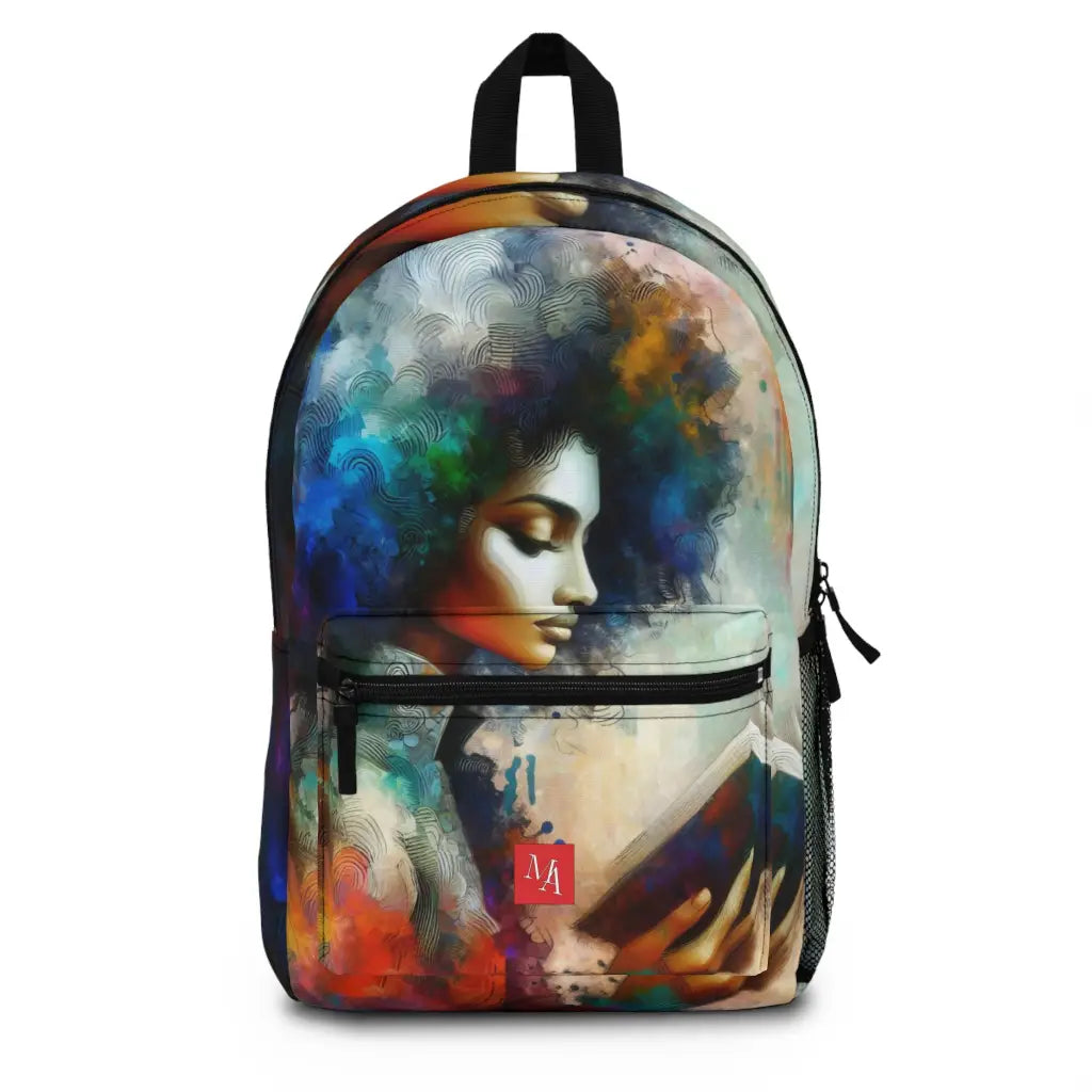 A vibrant, expressive portrait of a woman reading, blending rich, abstract colors and textures. Her hair and dress burst with hues of blue, purple, and orange, capturing a serene moment of introspection and creativity. Introducing the ultimate backpack for fashion-forward adventurers! Our backpack boasts a striking textile design that will make a statement wherever you go. With its durable construction and spacious compartments, it is perfect for carrying all your essentials. Get ready to turn heads and stay organized with our backpack. #textiledesign #backpack #fashionforward #adventure #durable #spacious #statementpiece #organized #essentials #travel #explore