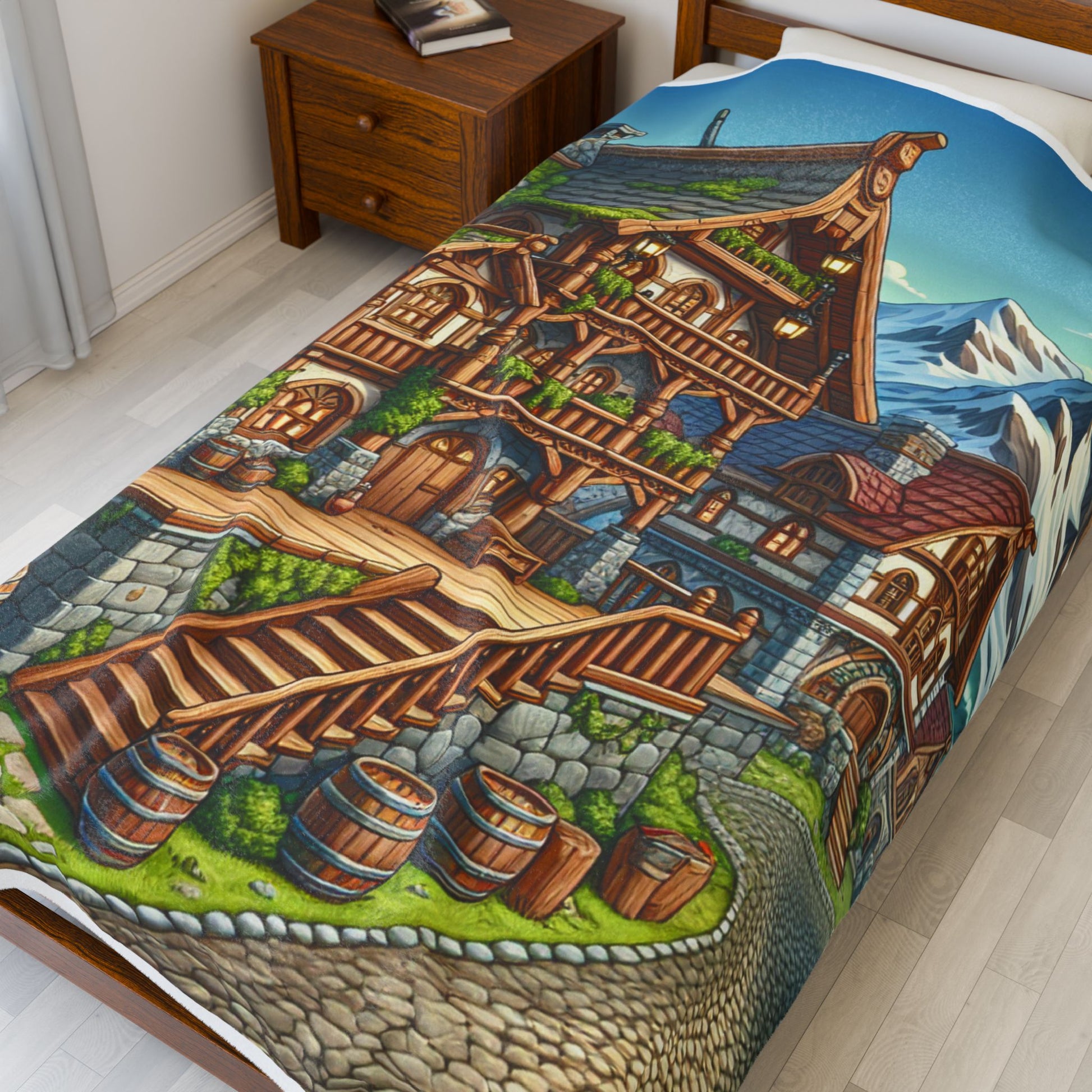 Vividly illustrated, the scene depicts a charming fantasy village with intricately designed wooden buildings nestled against a backdrop of majestic mountains, evoking an enchanting atmosphere of fairy-tale adventures. Create a cozy and warm atmosphere at home with this plush velveteen blanket. It is soft to touch and perfect for any home. Customize with a one-sided print to add your personal touch or create a gift for your friends and family. Available in three sizes: 30x40", 50x60", 60x80".