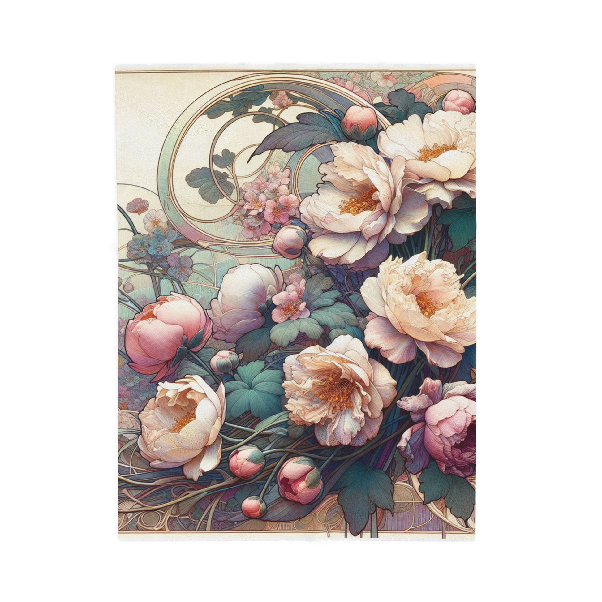 The image showcases a lush, intricate display of peonies with a harmonious blend of Art Nouveau influences, characterized by elegant, swirling lines and a soft, pastel color palette, creating a sense of romantic, vintage beauty. Create a cozy and warm atmosphere at home with this plush velveteen blanket. It is soft to touch and perfect for any home. Customize with a one-sided print to add your personal touch or create a gift for your friends and family. Available in three sizes: 30x40", 50x60", 60x80".