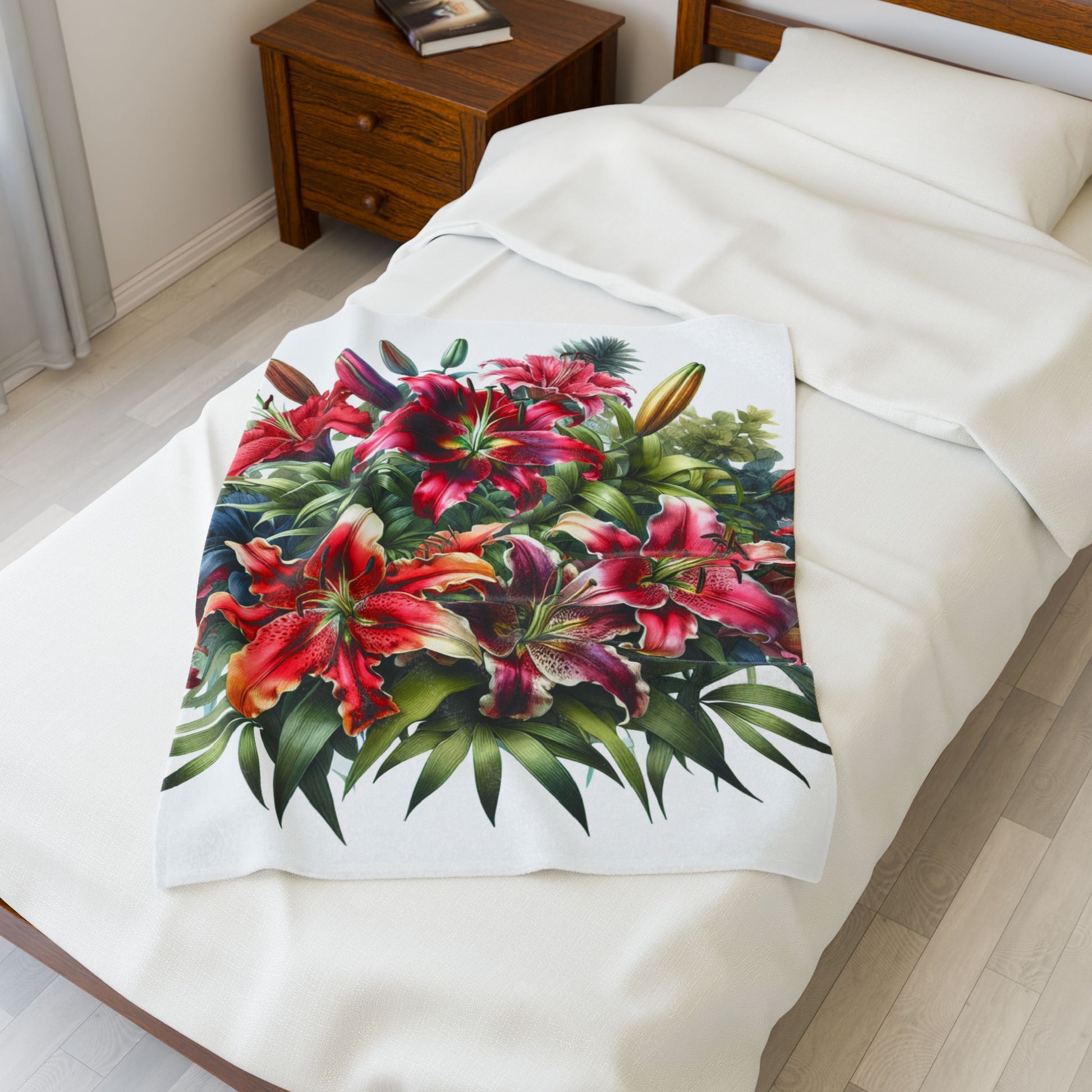 A vibrant bouquet of red and pink lilies, with delicate green foliage, bursts with dynamic energy and intricate detail. The harmonious blend of colors and textures creates an enchanting tapestry of floral beauty. Create a cozy and warm atmosphere at home with this plush velveteen blanket. It is soft to touch and perfect for any home. Customize with a one-sided print to add your personal touch or create a gift for your friends and family. Available in three sizes: 30x40", 50x60", 60x80".
