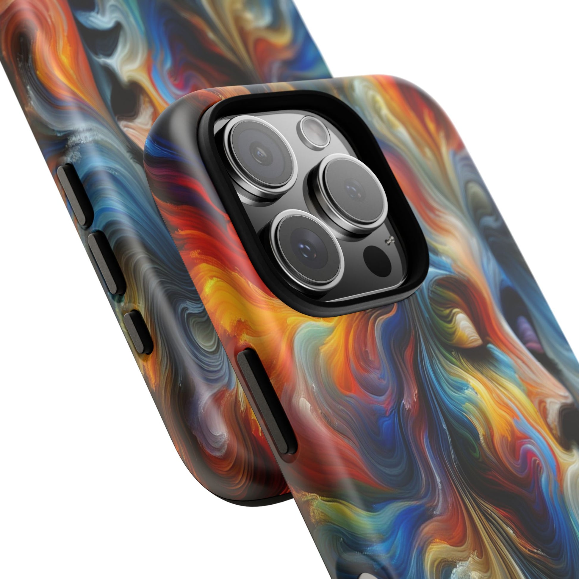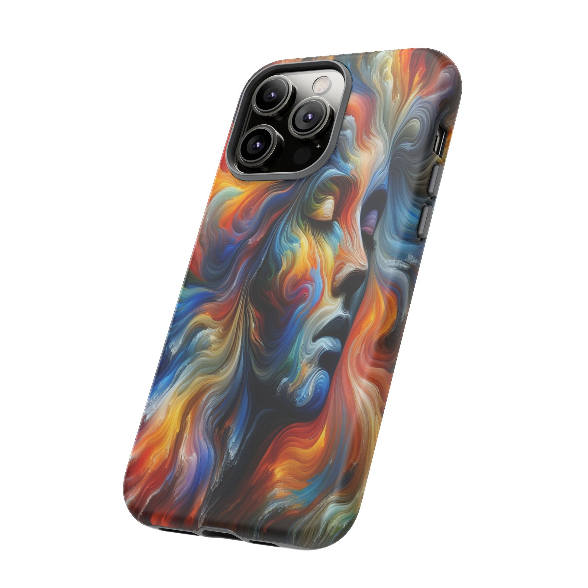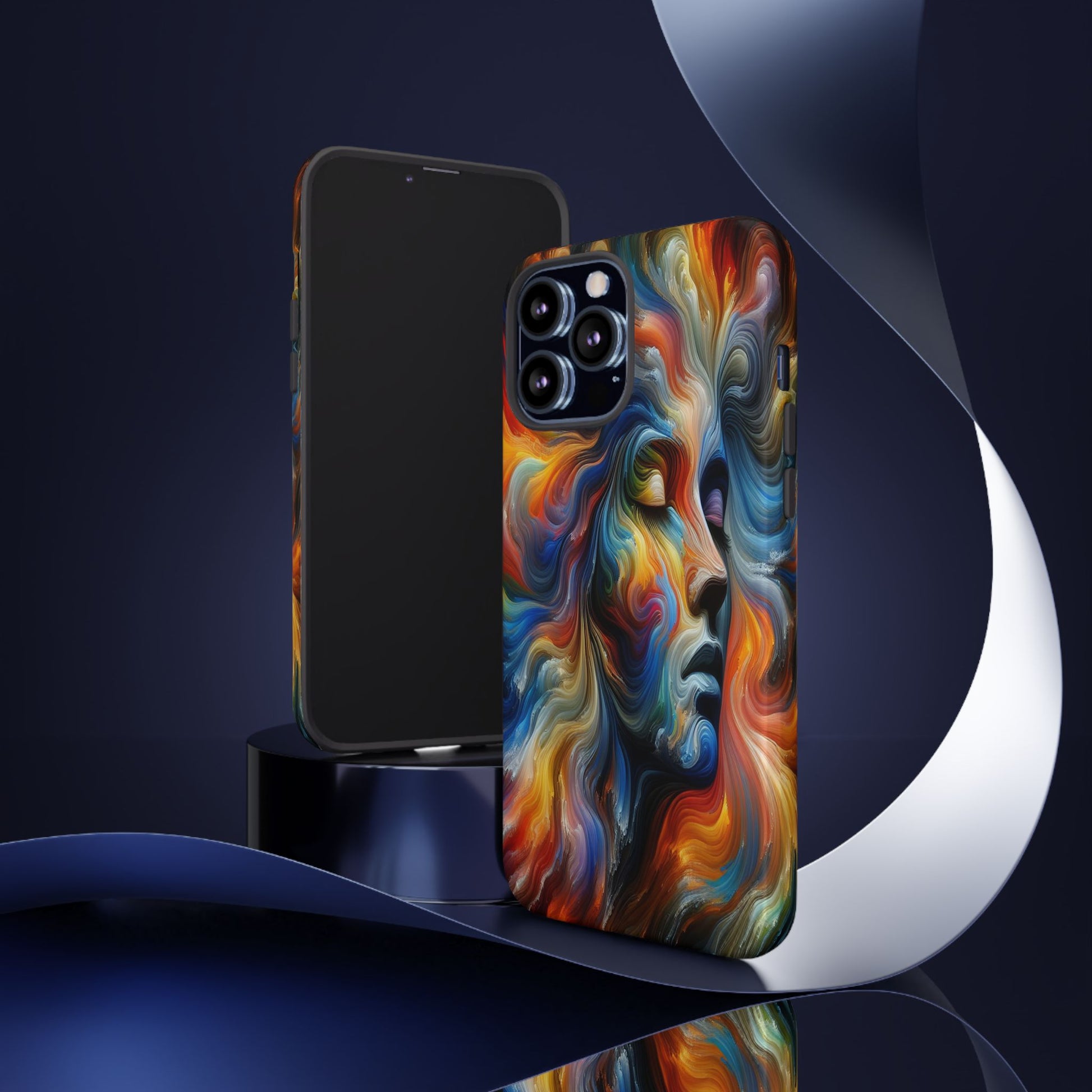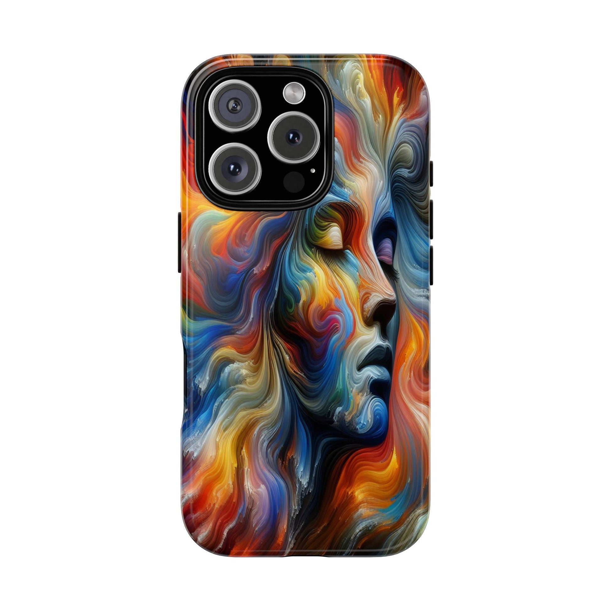 A vibrant fusion of swirling colors forms an ethereal face, seamlessly blending into a tapestry of waves. The dynamic interplay of hues creates a mesmerizing, dreamlike quality, embodying fluidity and emotion. Protect your phone in style with our premium-quality custom protective phone cases, designed to fit iPhones from the latest iPhone 16 to older models like iPhone 7 and 8. Each case features double-layer protection with a durable polycarbonate outer shell and a soft TPU lining for extra impact resistance, making it ideal for daily use.