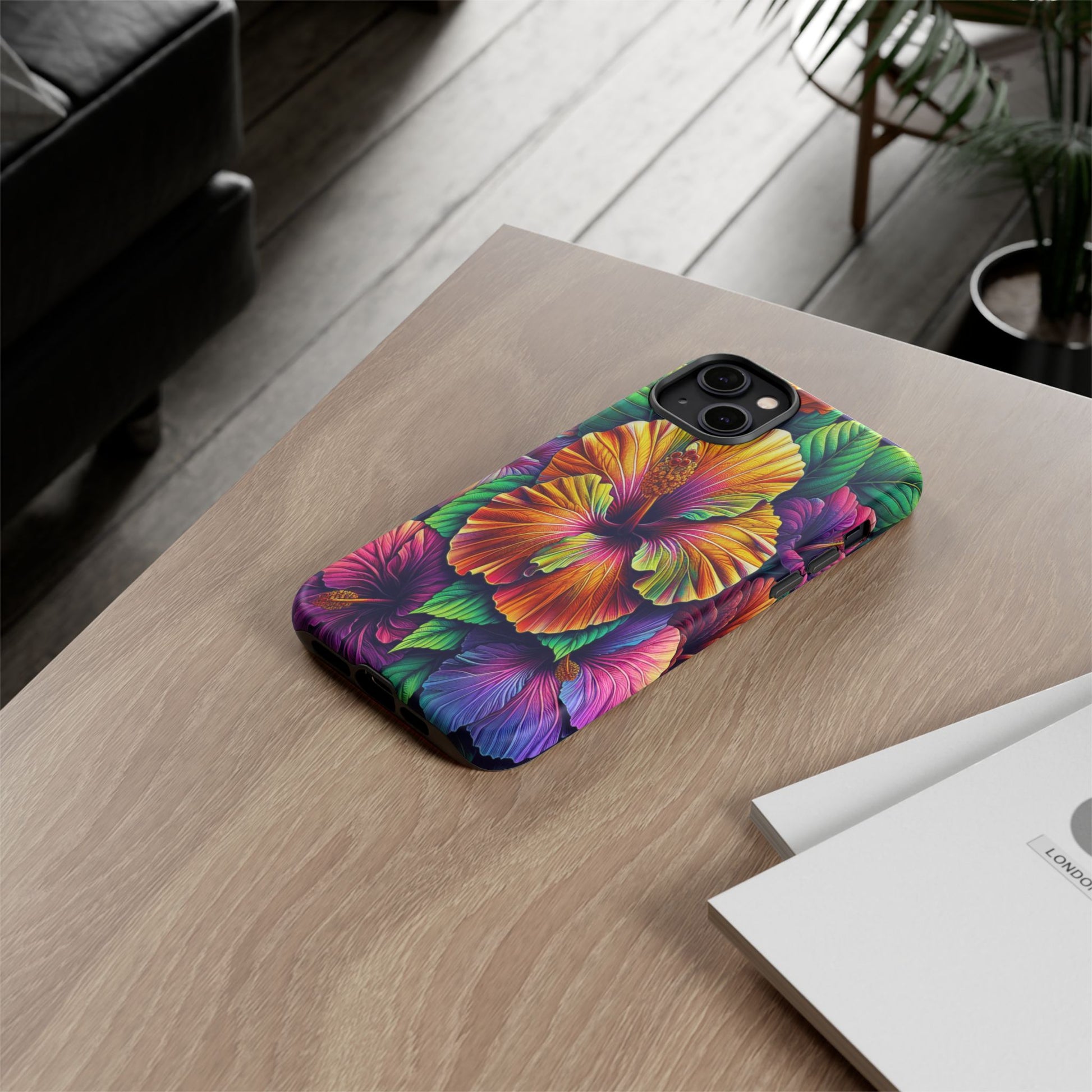 Vibrant hibiscus blooms explode with psychedelic colors, intricately detailed petals weaving a mesmerizing tapestry. Lush green leaves contrast beautifully, enhancing the surreal allure of this imaginative, colorful floral composition. Protect your phone in style with our premium-quality custom protective phone cases, designed to fit iPhones from the latest iPhone 16 to older models like iPhone 7 and 8. Each case features double-layer protection with a durable polycarbonate outer shell and a soft TPU lining for extra impact resistance, making it ideal for daily use.