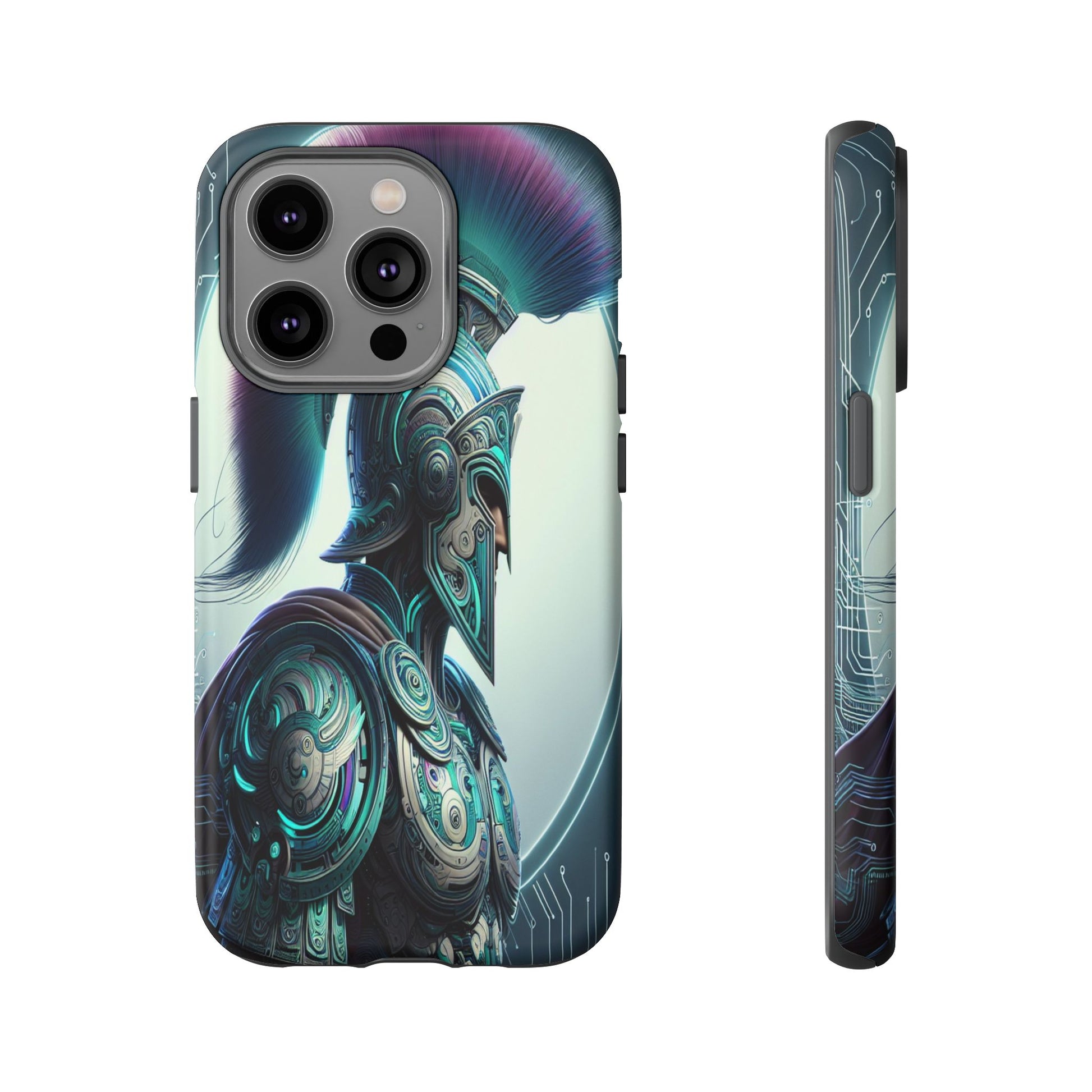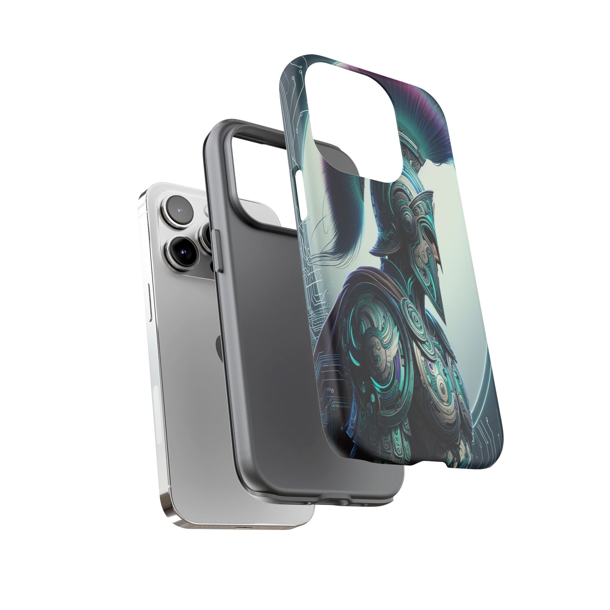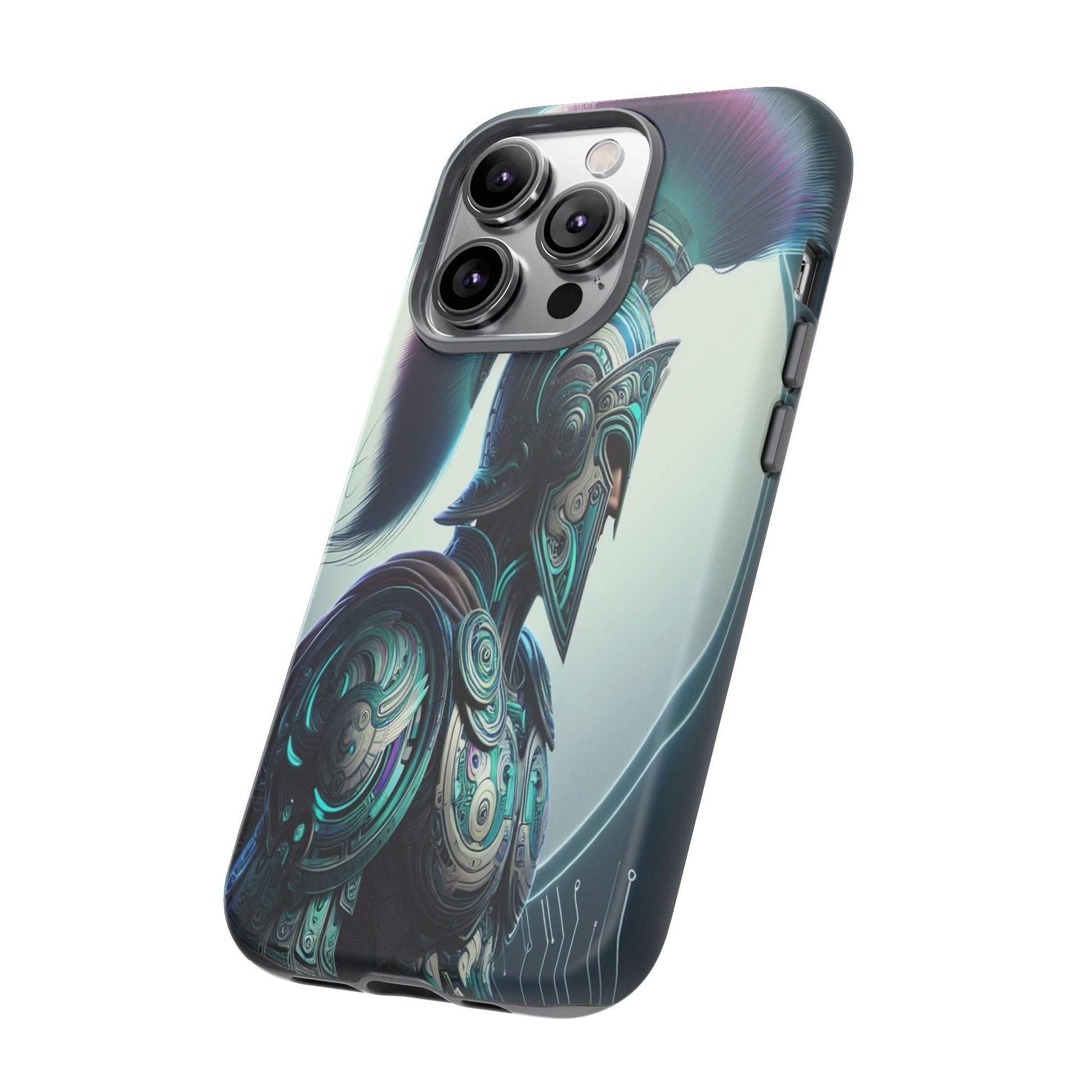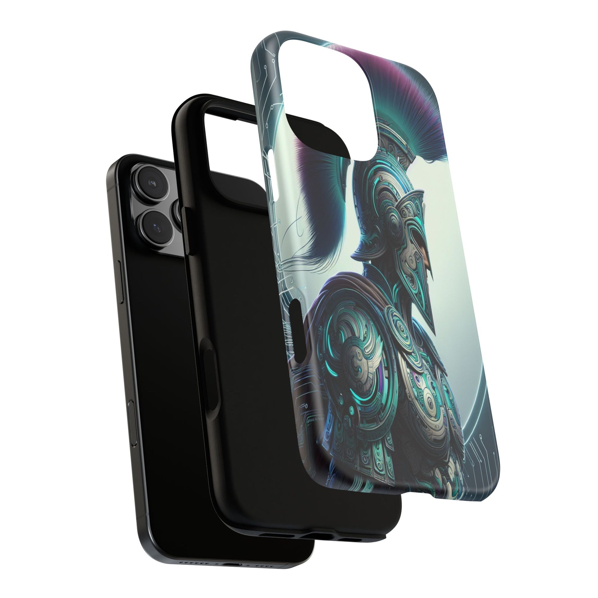 This image showcases a futuristic warrior in intricately detailed armor blending ancient Greek design with cybernetic elements. The vibrant plume and circuitry patterns create a striking fusion of tradition and technology, highlighted by a luminous backdrop. Protect your phone in style with our premium-quality custom protective phone cases, designed to fit iPhones from the latest iPhone 16 to older models like iPhone 7 and 8. Each case features double-layer protection with a durable polycarbonate outer shell and a soft TPU lining for extra impact resistance, making it ideal for daily use.