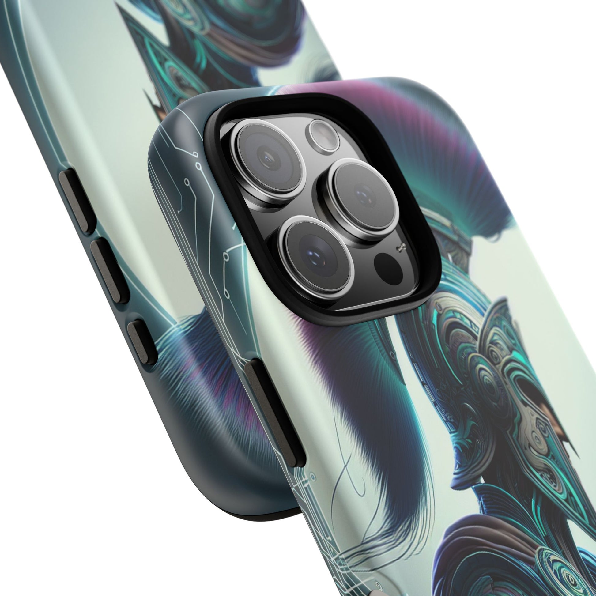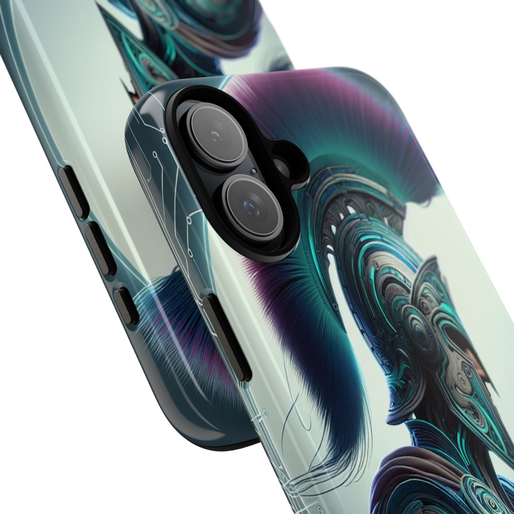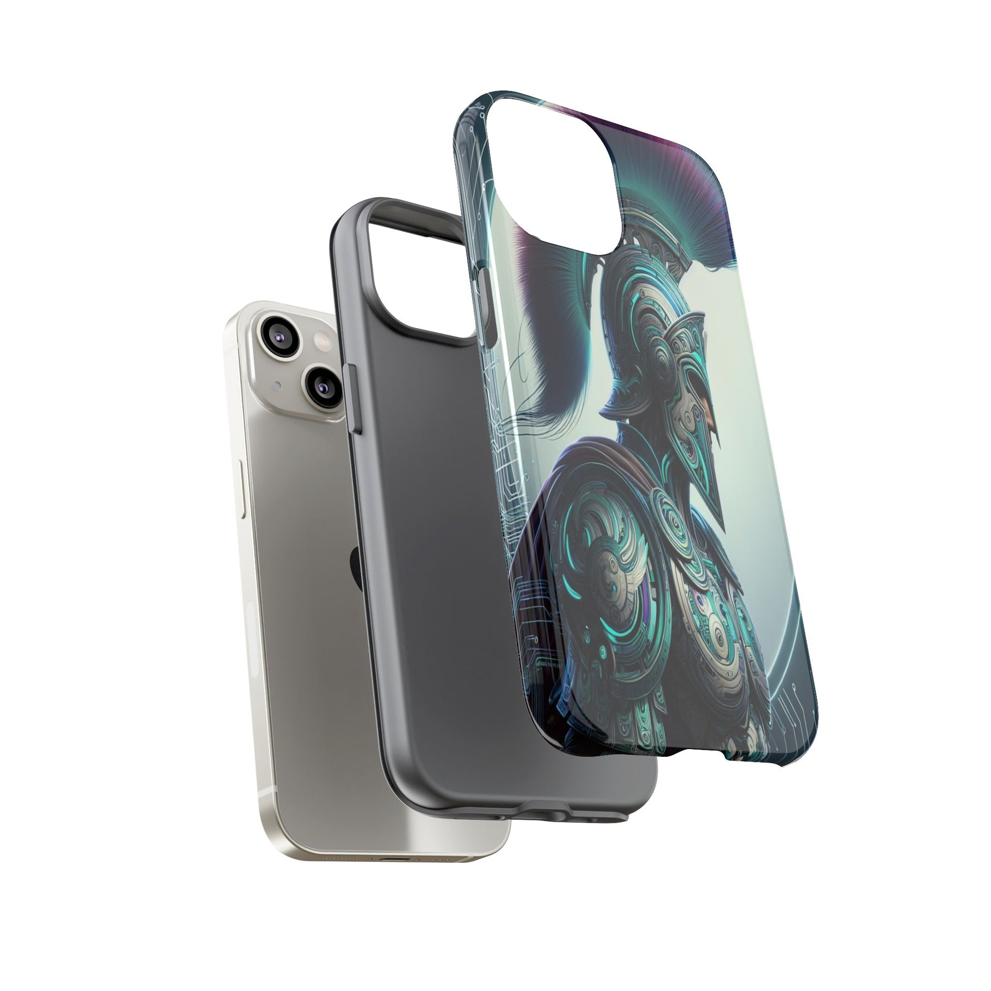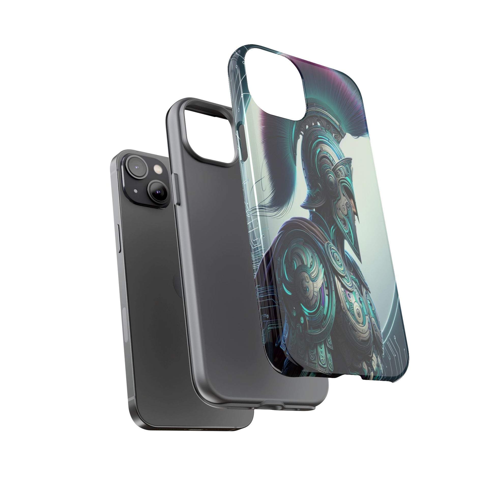 This image showcases a futuristic warrior in intricately detailed armor blending ancient Greek design with cybernetic elements. The vibrant plume and circuitry patterns create a striking fusion of tradition and technology, highlighted by a luminous backdrop. Protect your phone in style with our premium-quality custom protective phone cases, designed to fit iPhones from the latest iPhone 16 to older models like iPhone 7 and 8. Each case features double-layer protection with a durable polycarbonate outer shell and a soft TPU lining for extra impact resistance, making it ideal for daily use.