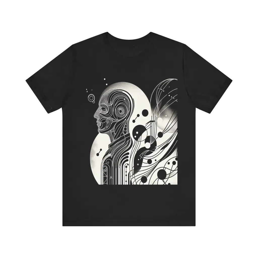 This striking monochromatic illustration portrays a futuristic figure intertwined with abstract, flowing circuitry and planetary patterns, blending human and cosmic elements in a dance of technology and imagination.. This classic unisex jersey short sleeve tee fits like a well-loved favorite. Soft cotton and quality print make users fall in love with it over and over again. These t-shirts have-ribbed knit collars to bolster shaping. The shoulders are tapered for a better fit over time. Dual side seams hold the garment's shape for longer.