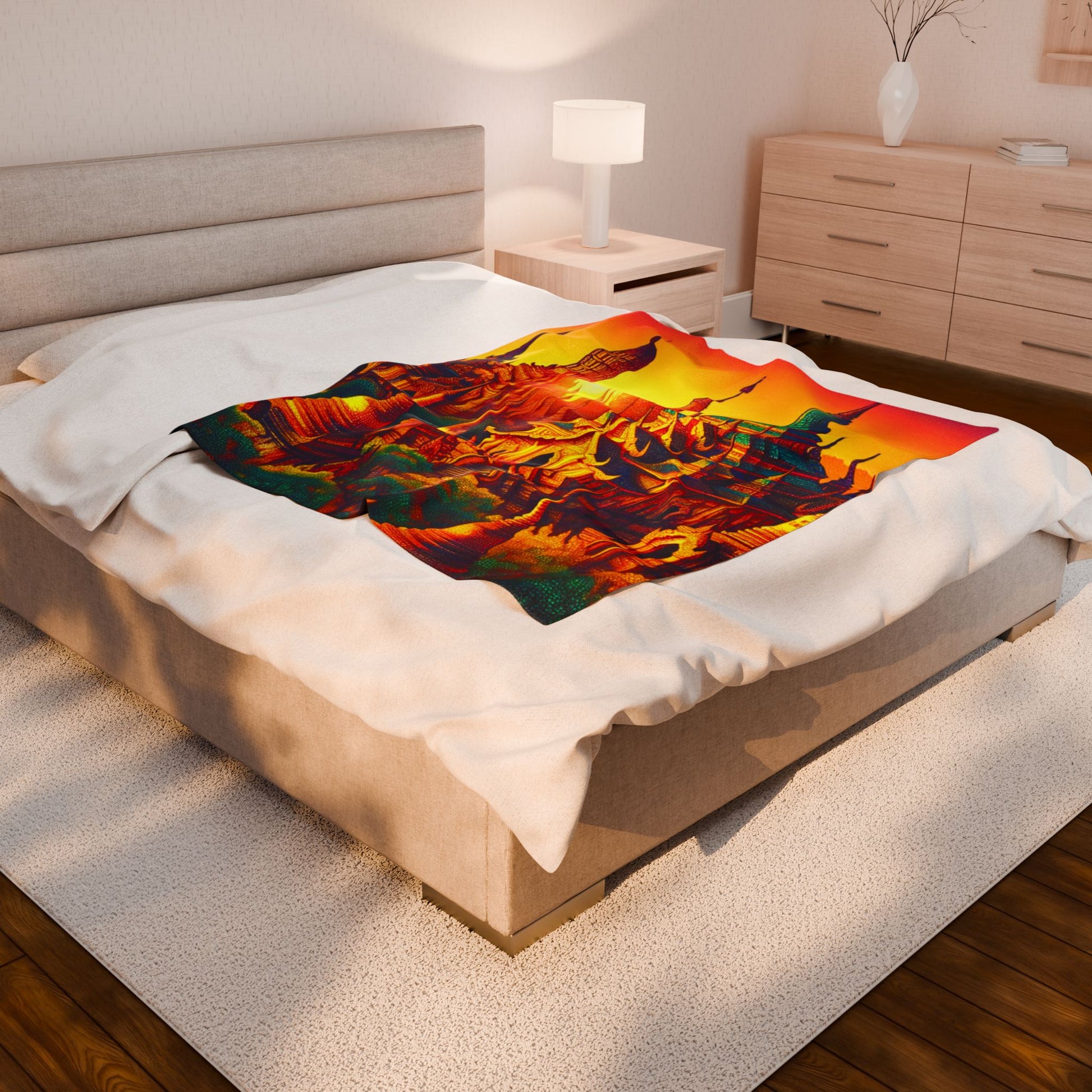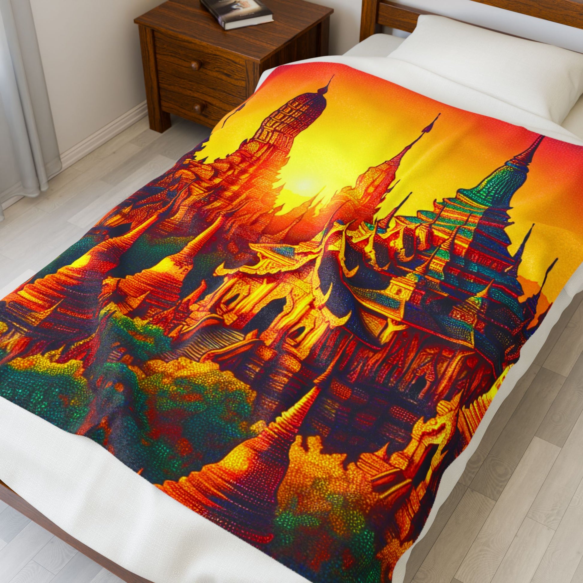 A vibrant sunset casts golden hues over an intricately detailed temple landscape. The fusion of warm tones and intricate patterns evokes a mythical aura, blending traditional architecture with a dreamlike quality, creating an enchanting visual tapestry. Create a cozy and warm atmosphere at home with this plush velveteen blanket. It is soft to touch and perfect for any home. Customize with a one-sided print to add your personal touch or create a gift for your friends and family. Available in three sizes: 30x40", 50x60", 60x80".