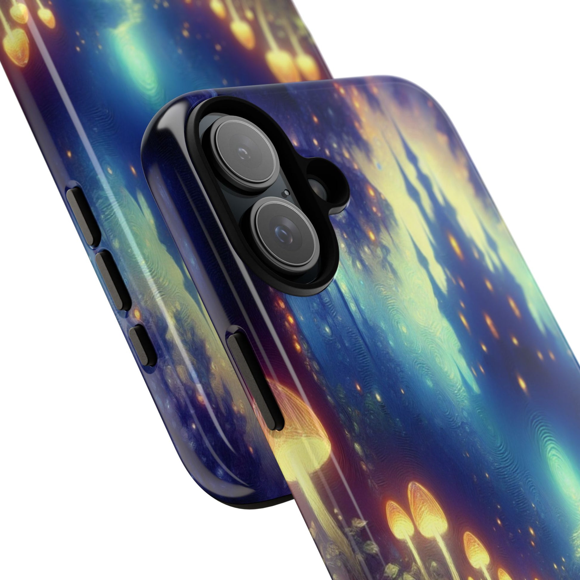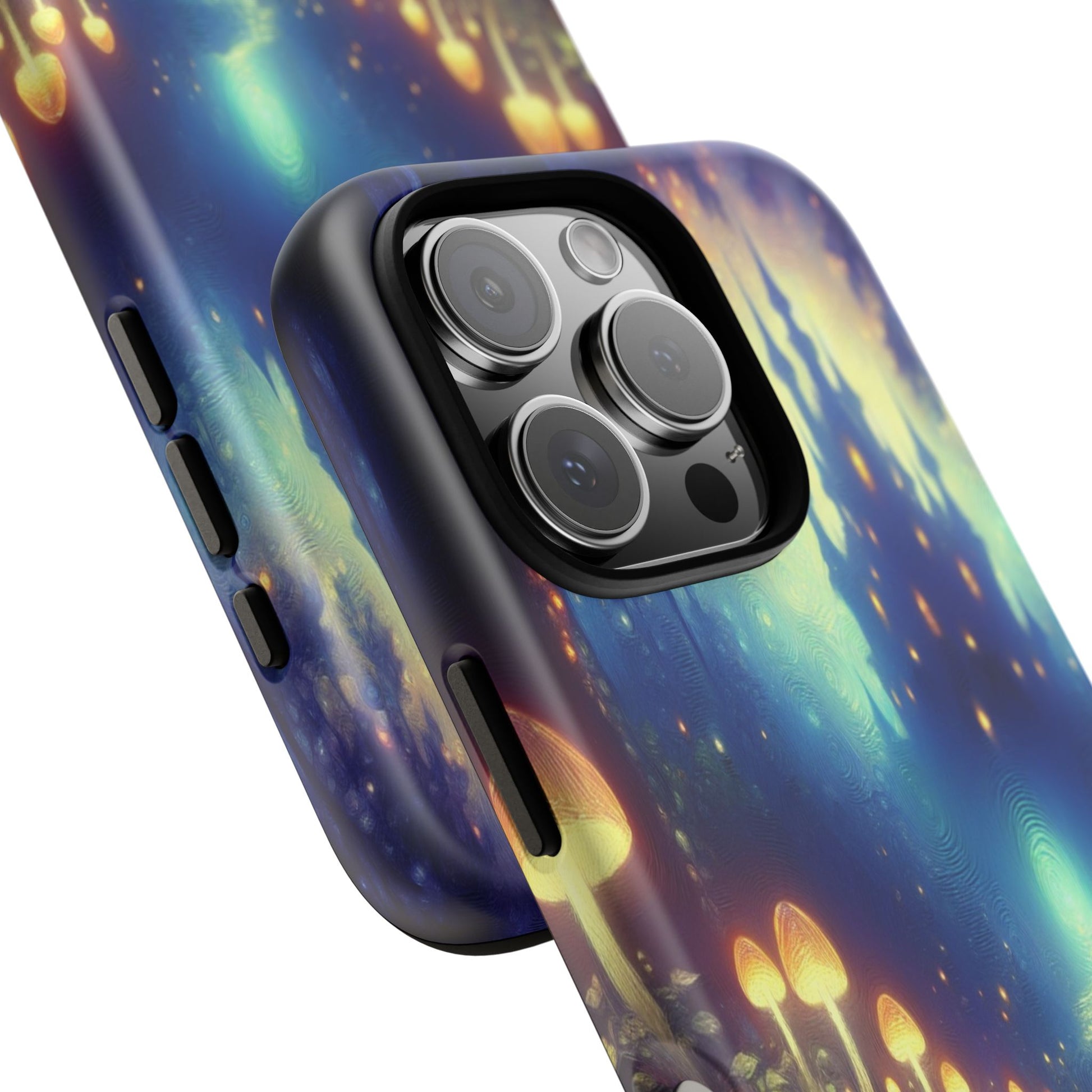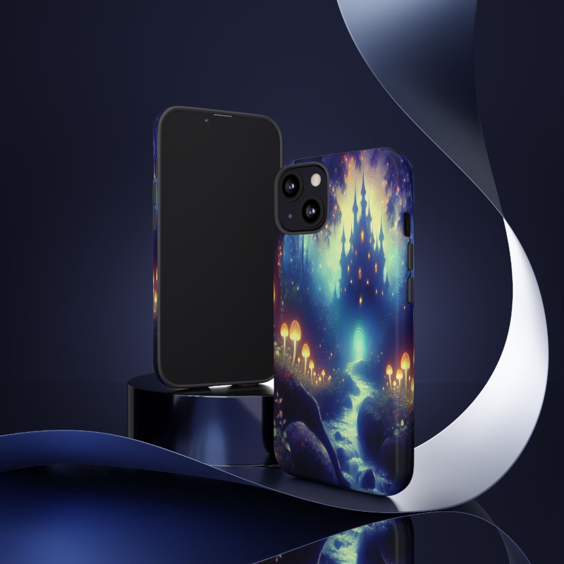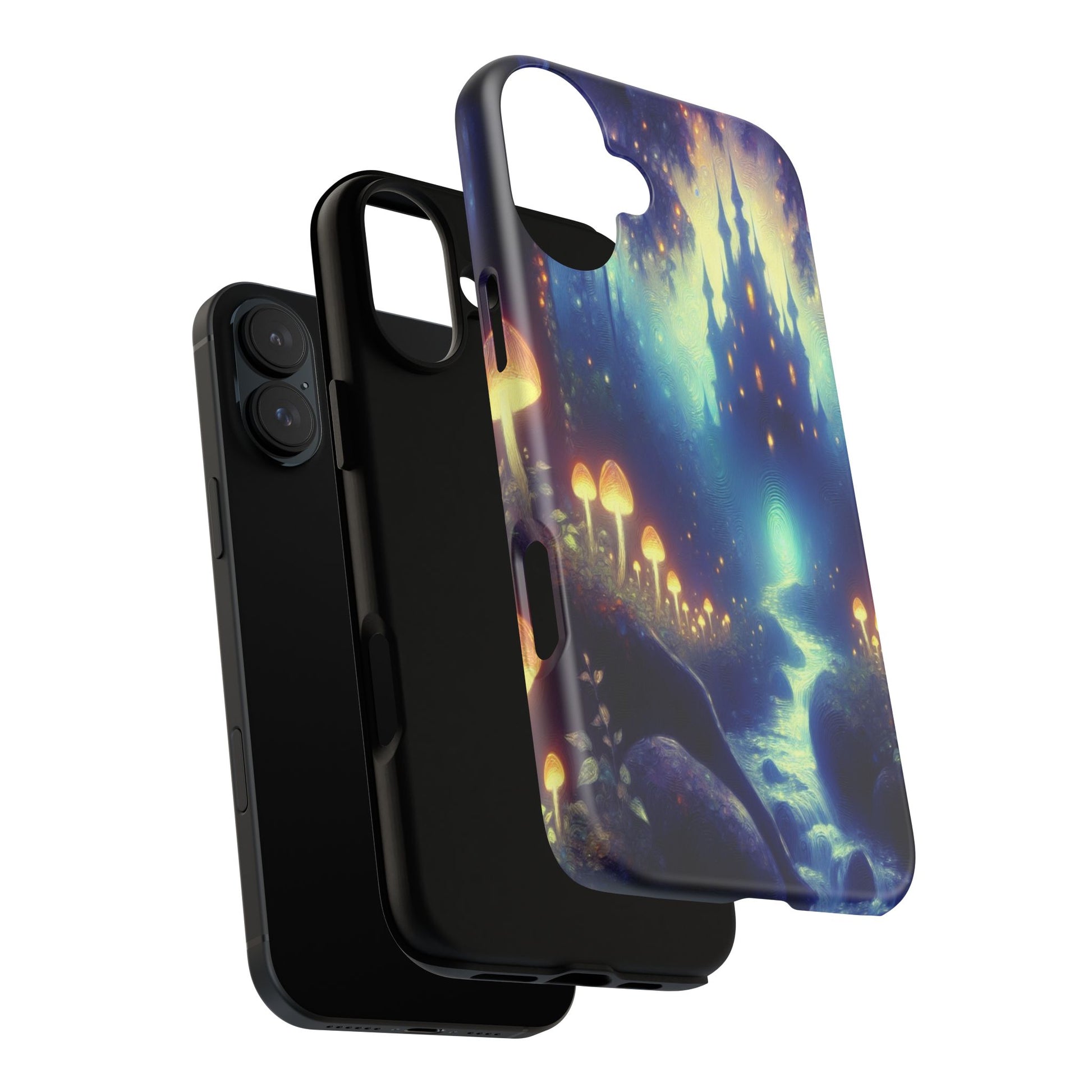 A whimsical, enchanting forest scene with luminescent mushrooms leading to a mystical castle. The vibrant, swirling colors create a dreamy, ethereal atmosphere, blending fantasy elements with a serene, otherworldly glow. iPhone, Samsung Galaxy, and Google Pixel devices with premium-quality custom protective phone cases. Every case has double layers for extra durability and protection while the clear, open ports stay out of your way when it comes to charging. The outer polycarbonate shell will resist daily impacts. Choose between matte or glossy finish and enjoy adding a unique touch to your phone with our custom protective phone cases sourced from Korea.