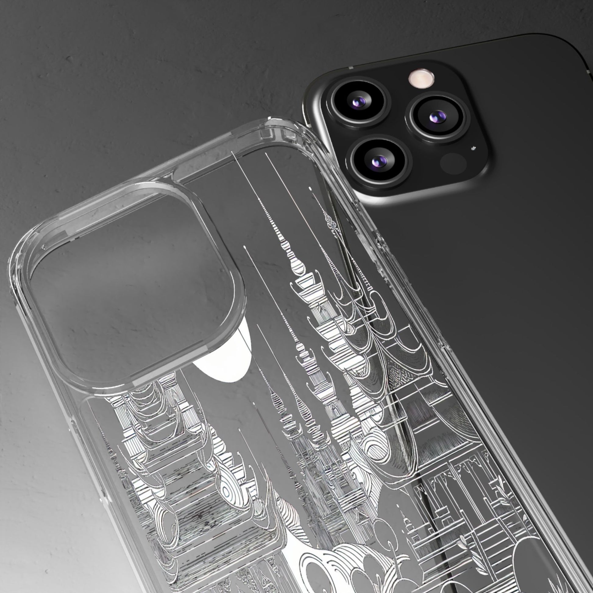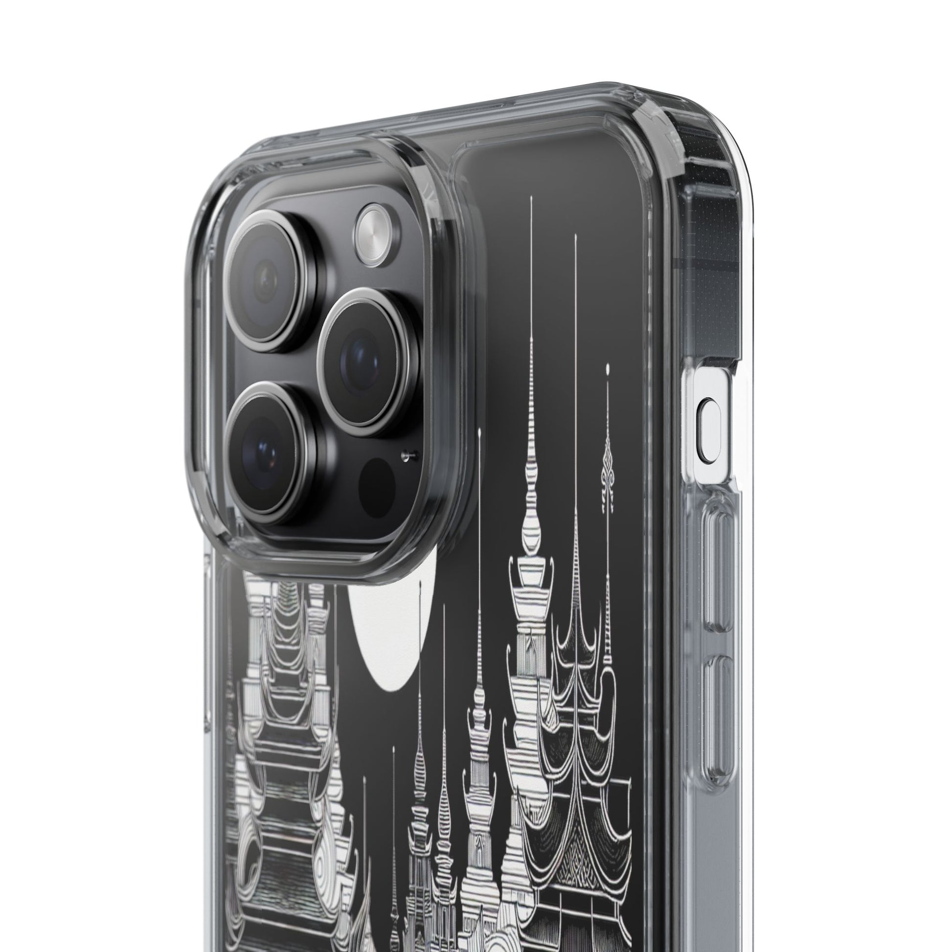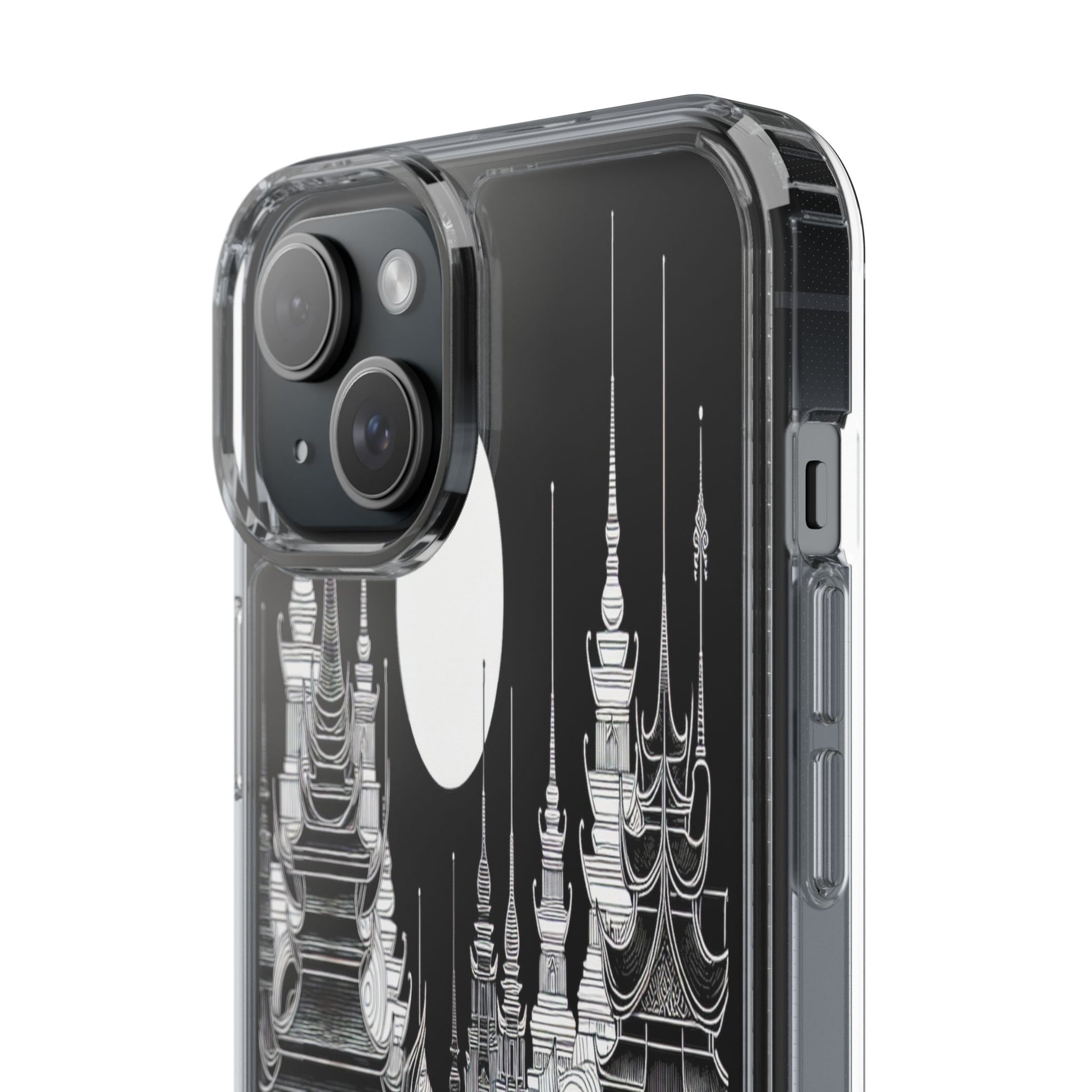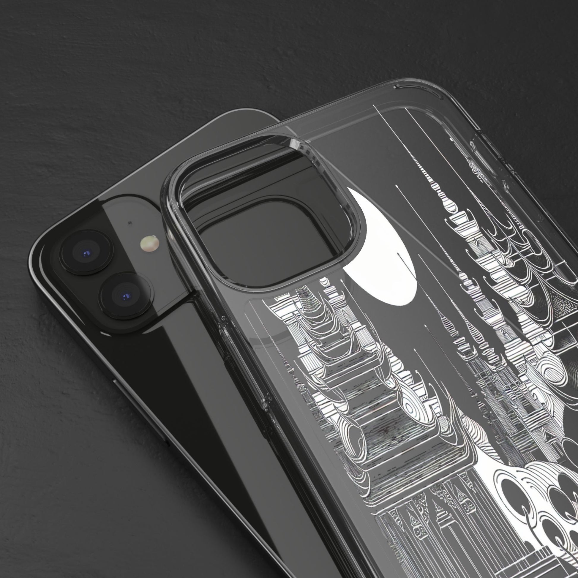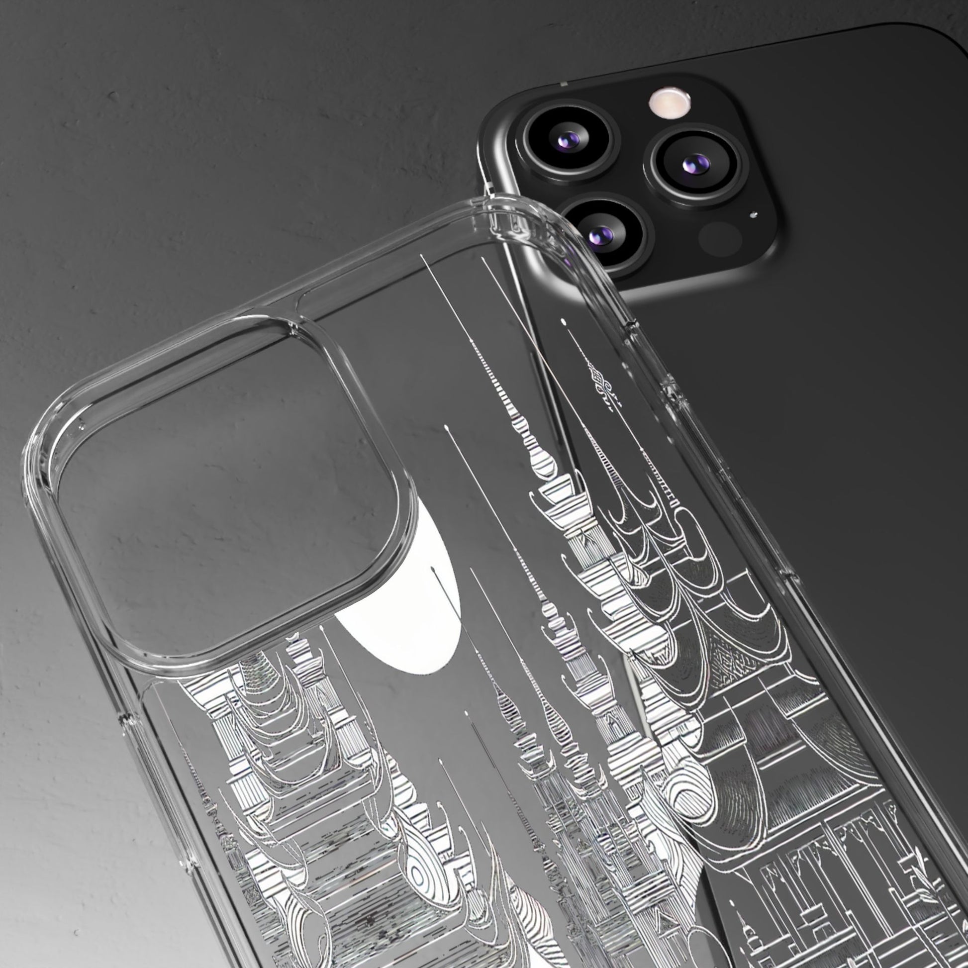 A mesmerizing, intricate line art piece featuring ornate temple architecture under a luminous moon, with flowing, wave-like patterns and bold contrasts creating a dreamlike skyline. Protect your phone while showcasing its sleek design with our customizable clear phone case, designed to fit iPhones from the latest iPhone 16 to earlier models like iPhone XR, XS, and X. This slim and lightweight case is perfect for guarding against daily wear and tear, offering shock-absorbing and scratch-resistant protection.