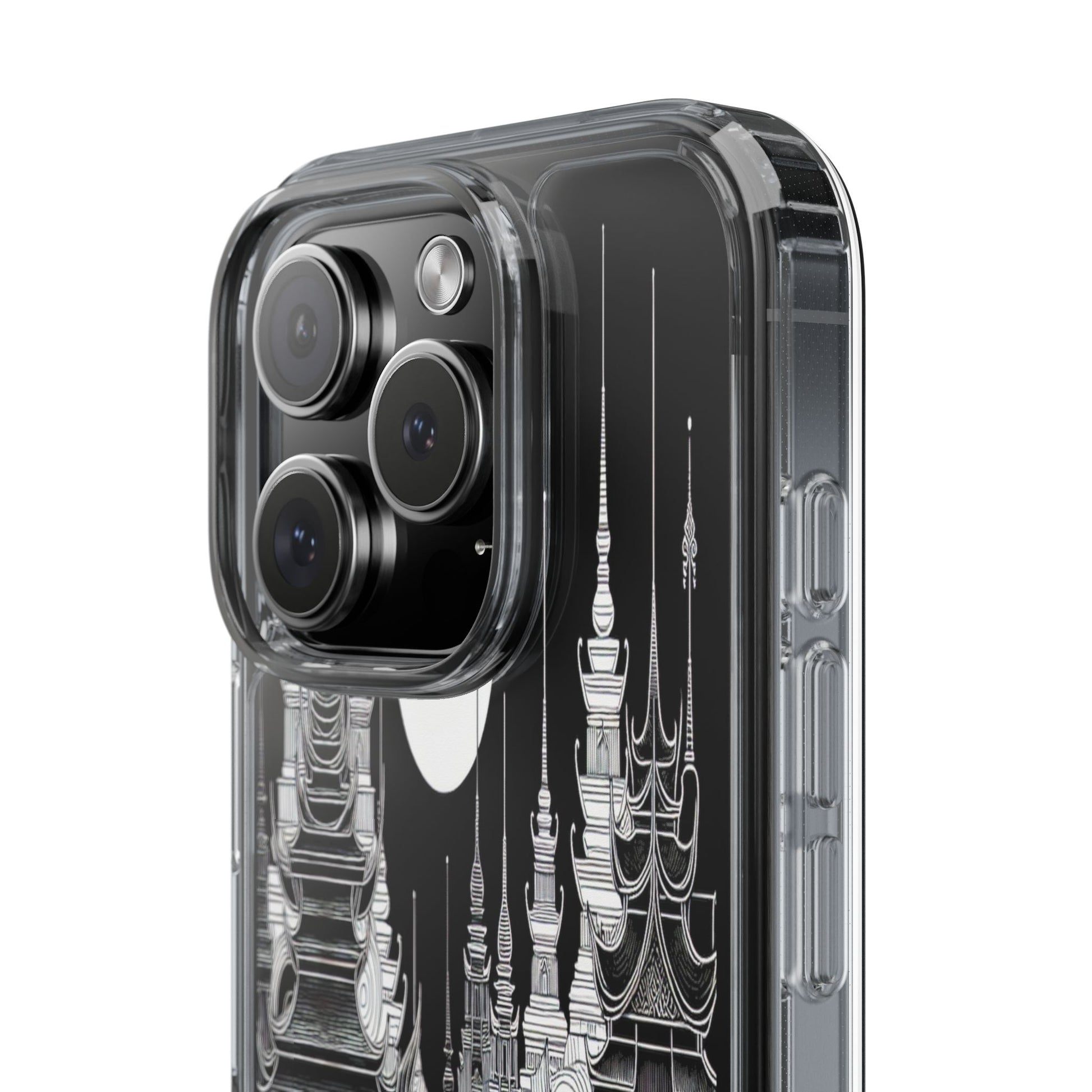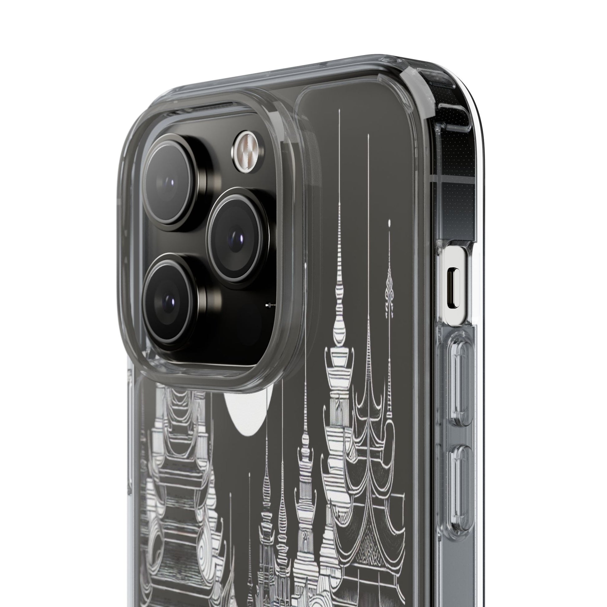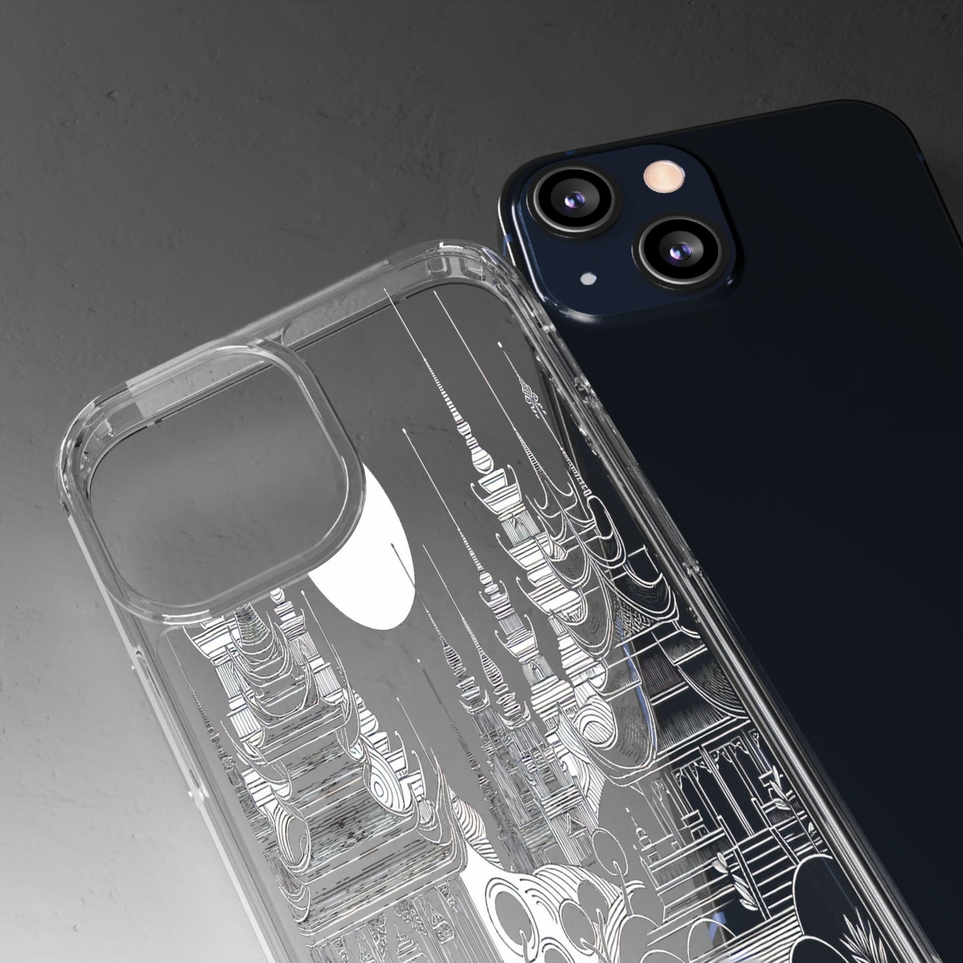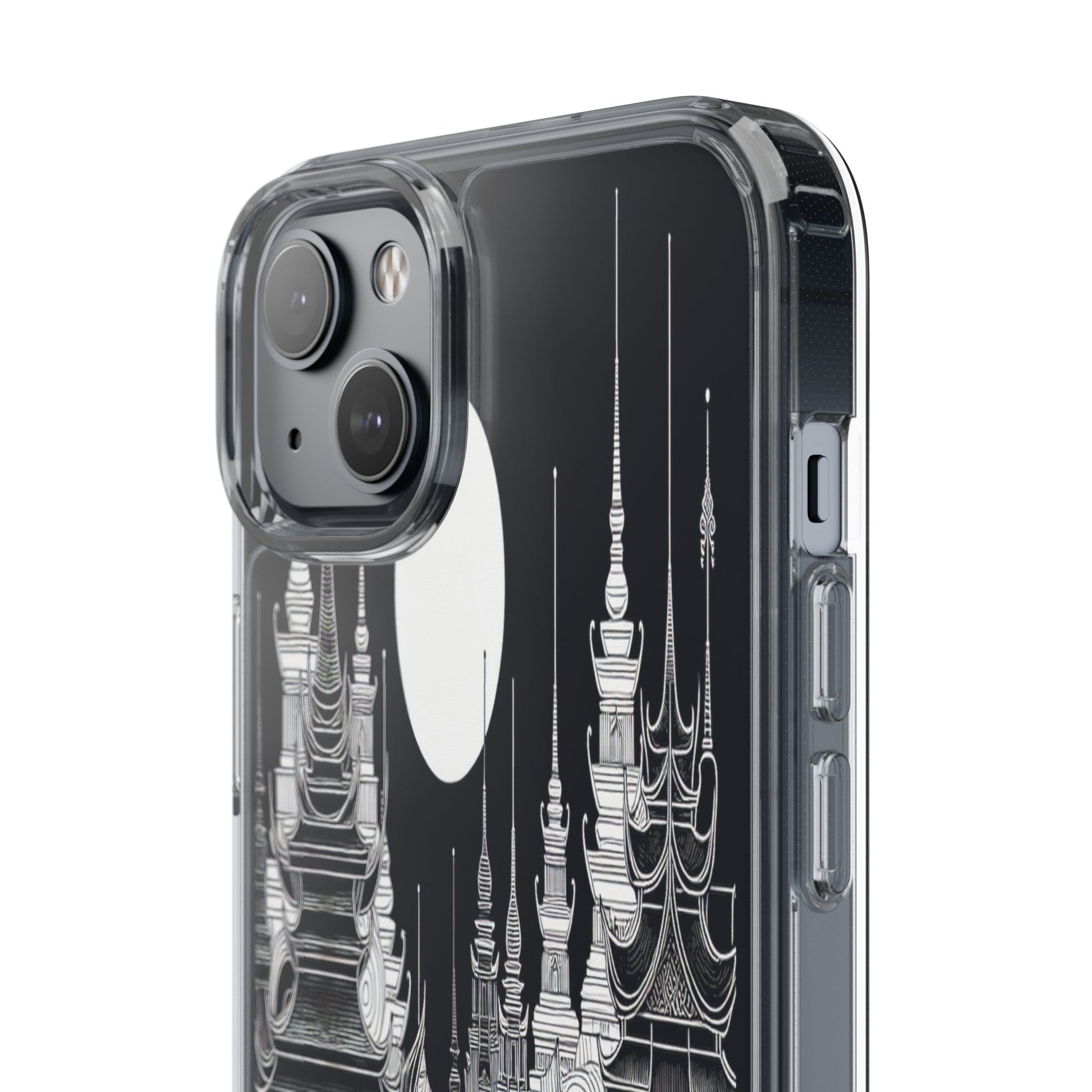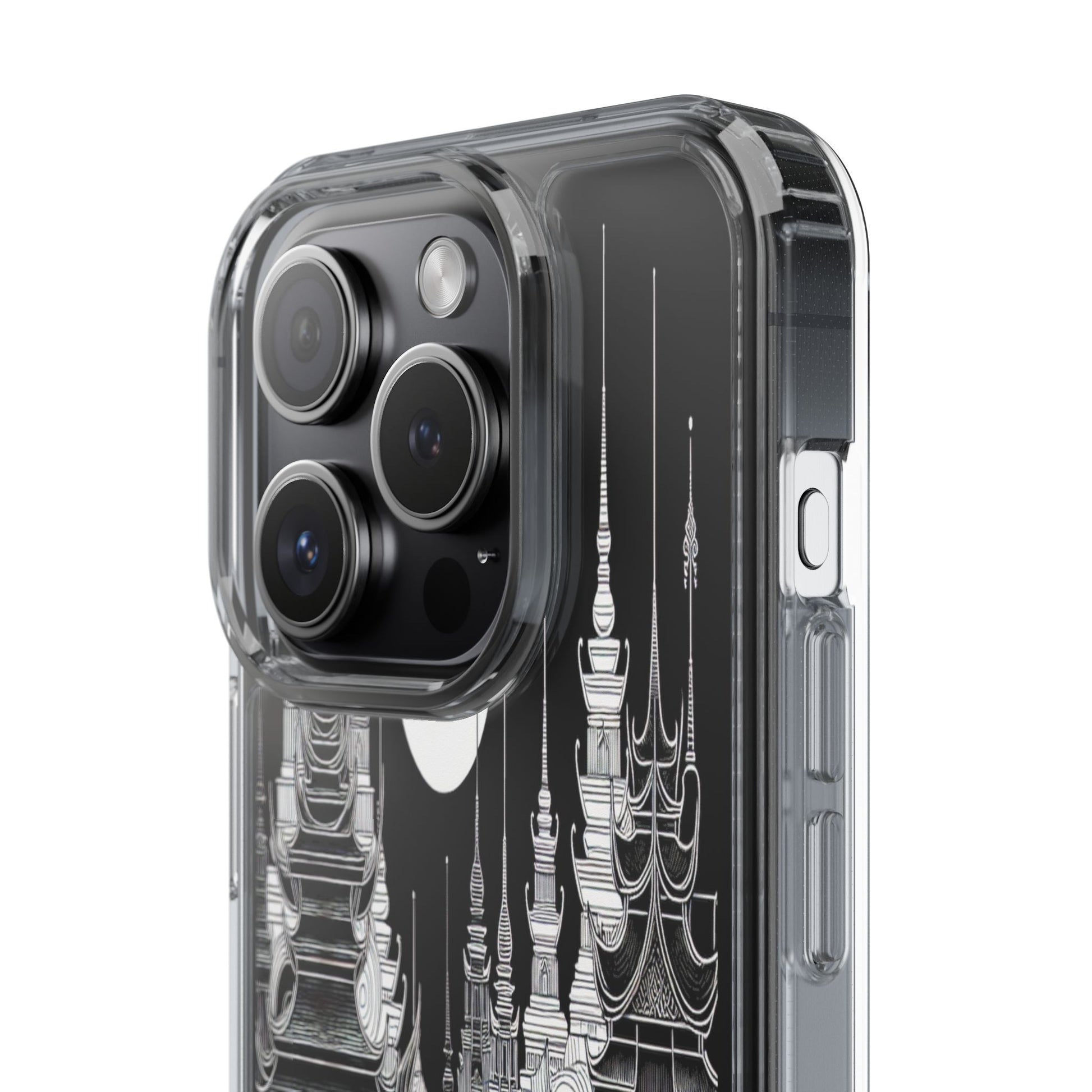 A mesmerizing, intricate line art piece featuring ornate temple architecture under a luminous moon, with flowing, wave-like patterns and bold contrasts creating a dreamlike skyline. Protect your phone while showcasing its sleek design with our customizable clear phone case, designed to fit iPhones from the latest iPhone 16 to earlier models like iPhone XR, XS, and X. This slim and lightweight case is perfect for guarding against daily wear and tear, offering shock-absorbing and scratch-resistant protection.