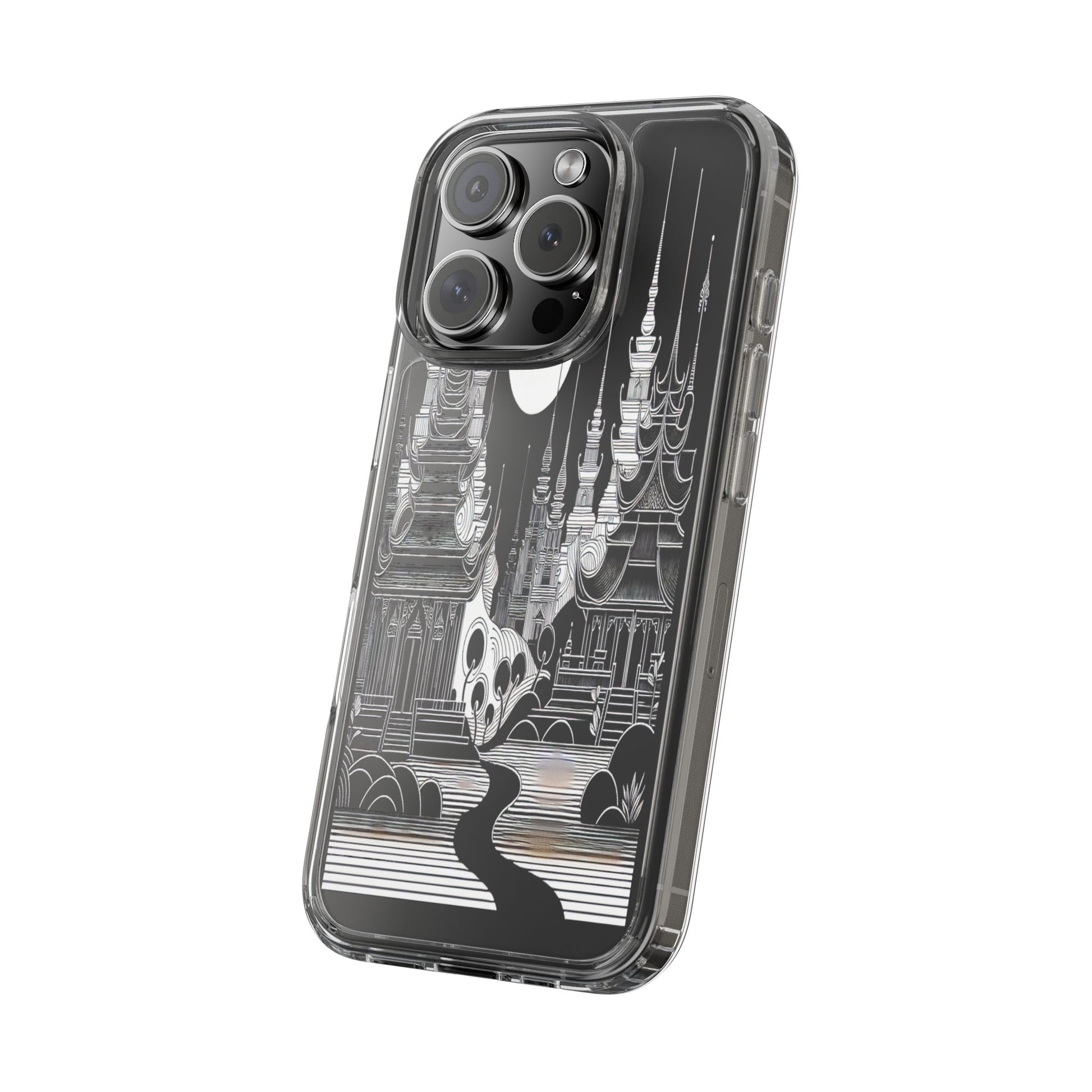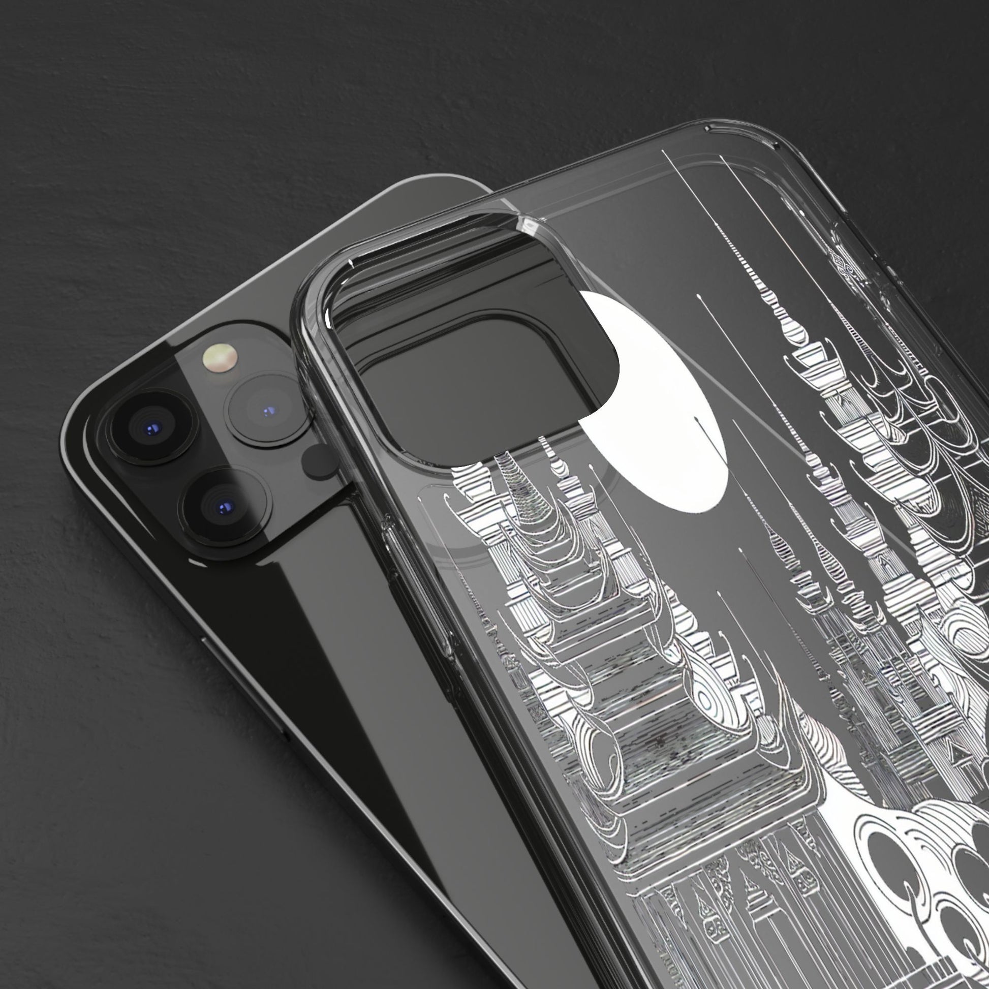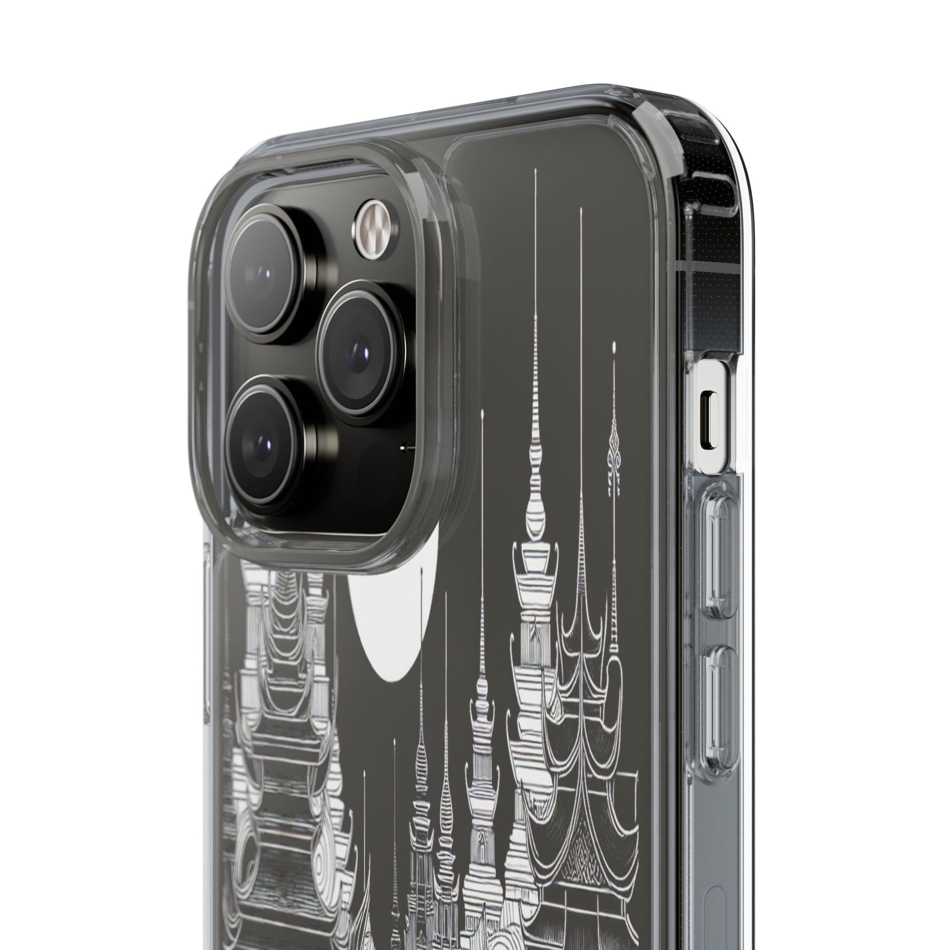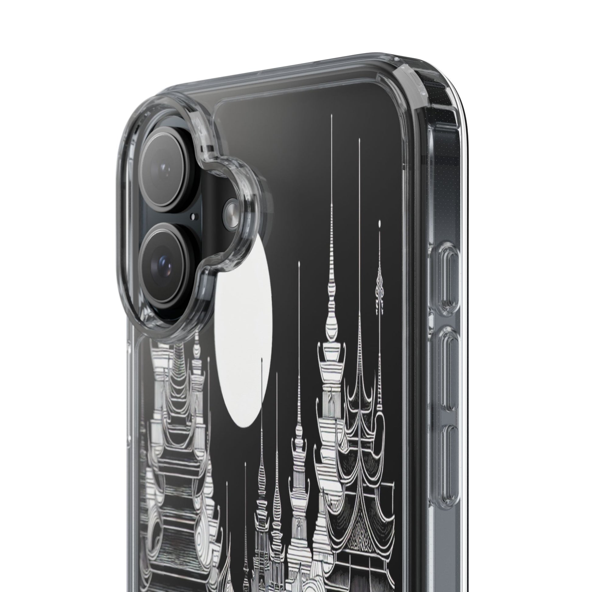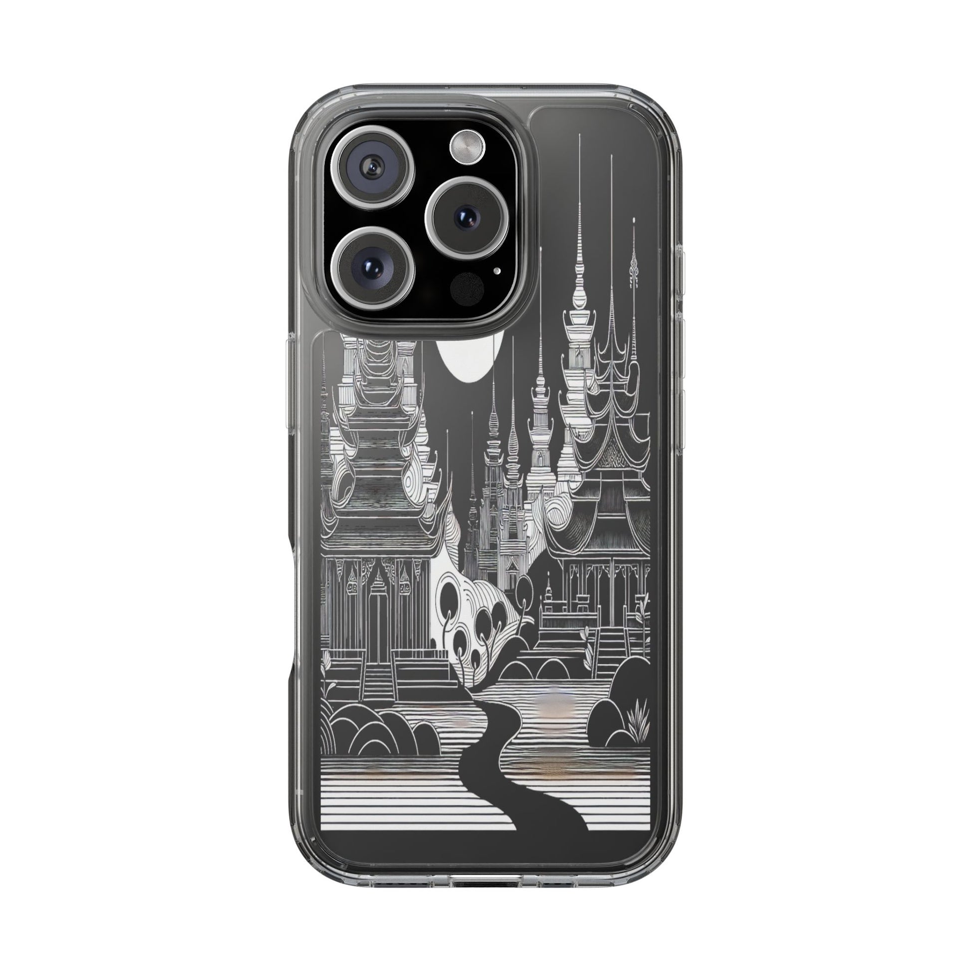 A mesmerizing, intricate line art piece featuring ornate temple architecture under a luminous moon, with flowing, wave-like patterns and bold contrasts creating a dreamlike skyline. Protect your phone while showcasing its sleek design with our customizable clear phone case, designed to fit iPhones from the latest iPhone 16 to earlier models like iPhone XR, XS, and X. This slim and lightweight case is perfect for guarding against daily wear and tear, offering shock-absorbing and scratch-resistant protection.