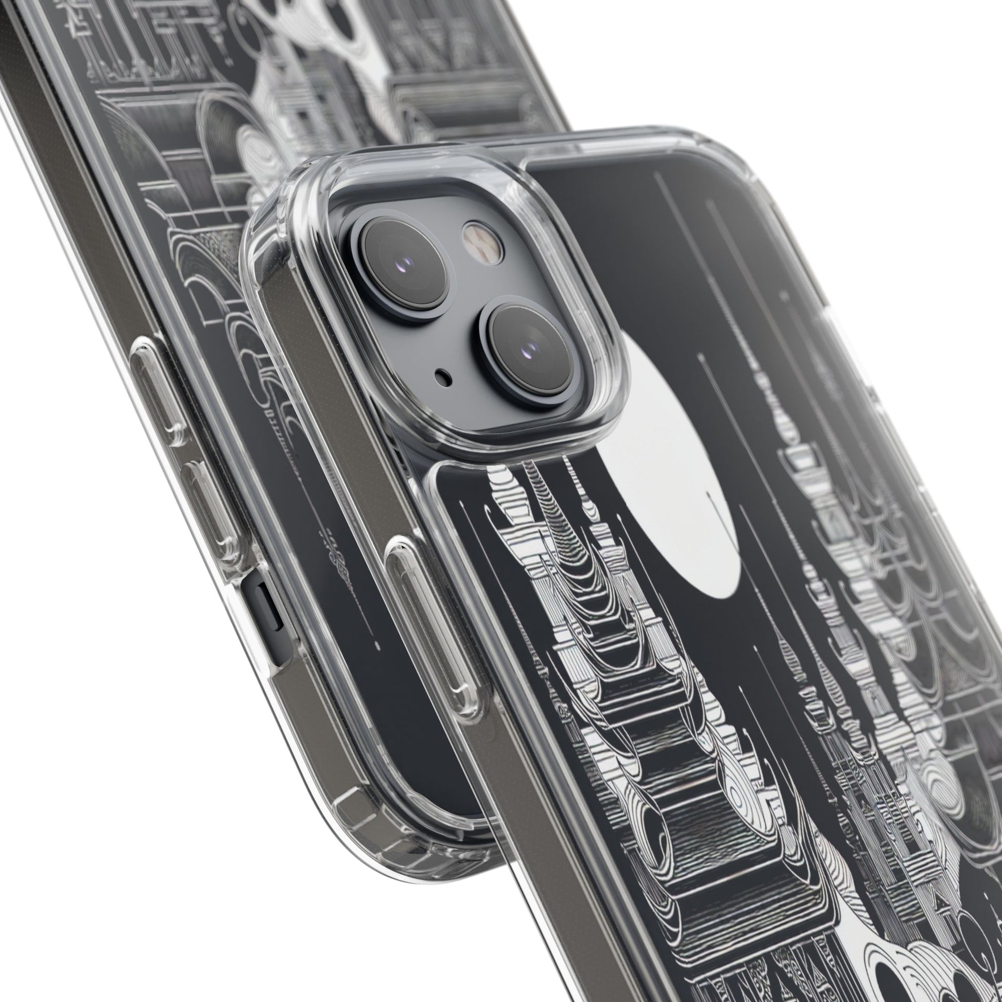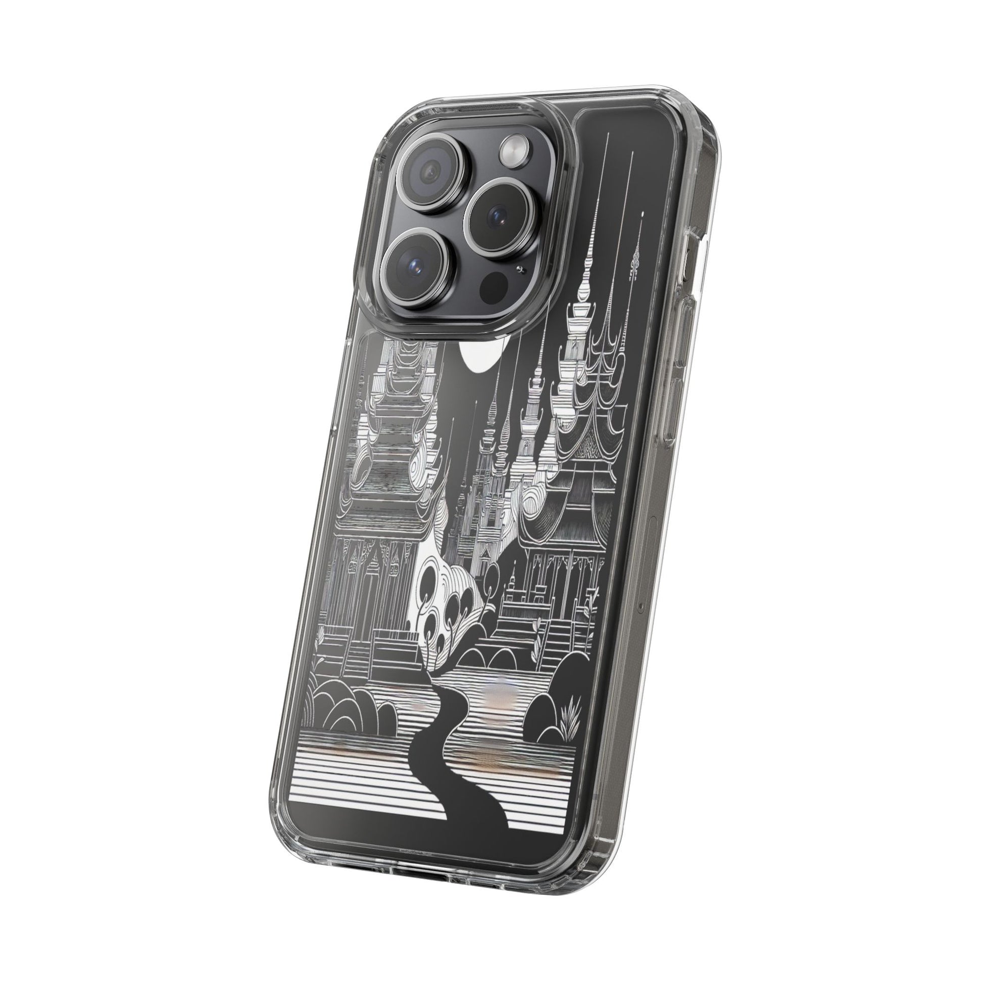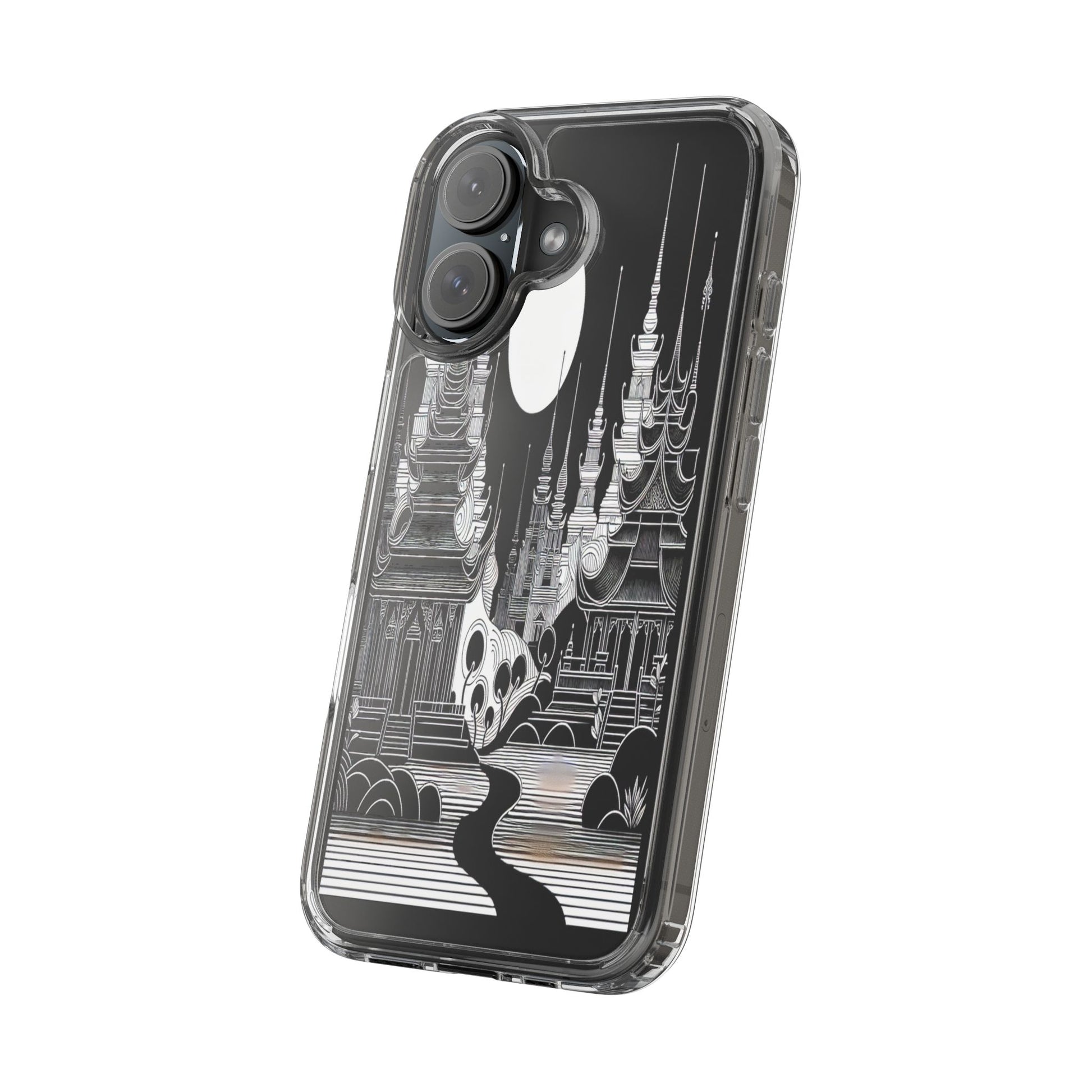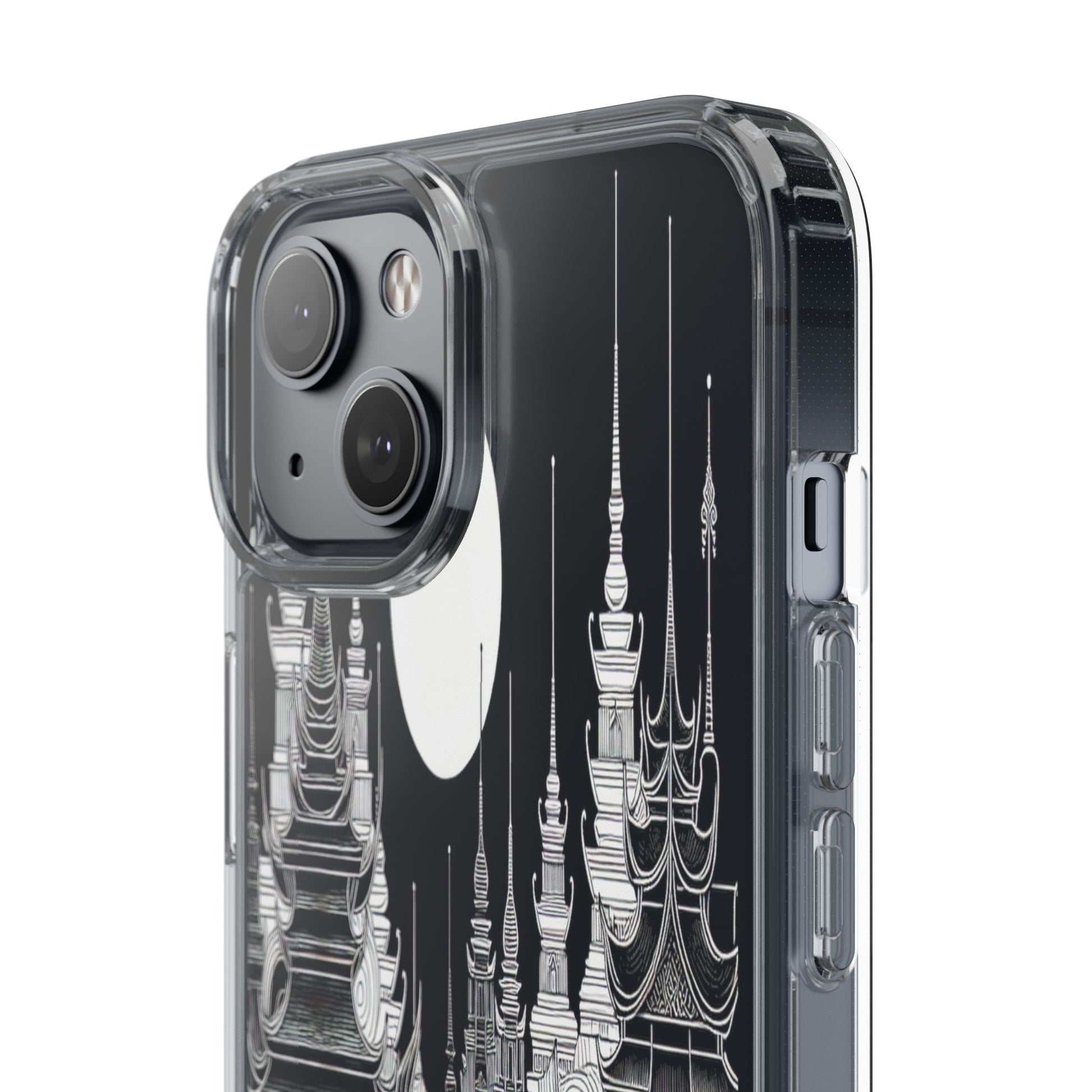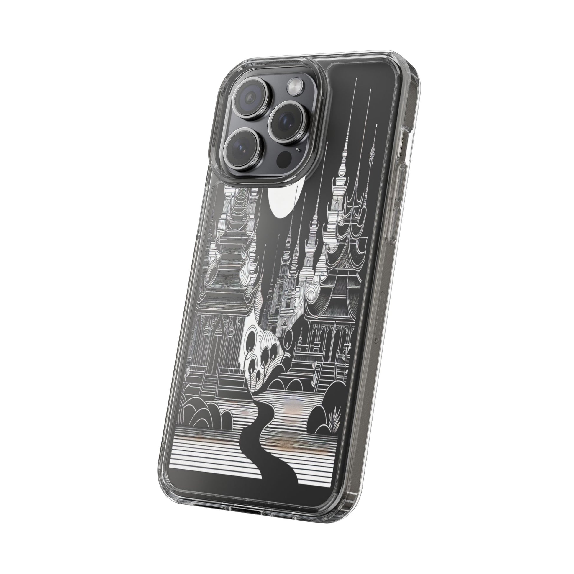 A mesmerizing, intricate line art piece featuring ornate temple architecture under a luminous moon, with flowing, wave-like patterns and bold contrasts creating a dreamlike skyline. Protect your phone while showcasing its sleek design with our customizable clear phone case, designed to fit iPhones from the latest iPhone 16 to earlier models like iPhone XR, XS, and X. This slim and lightweight case is perfect for guarding against daily wear and tear, offering shock-absorbing and scratch-resistant protection.