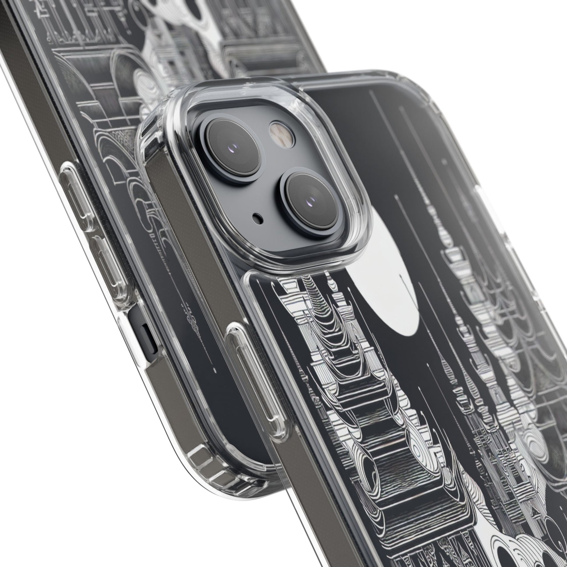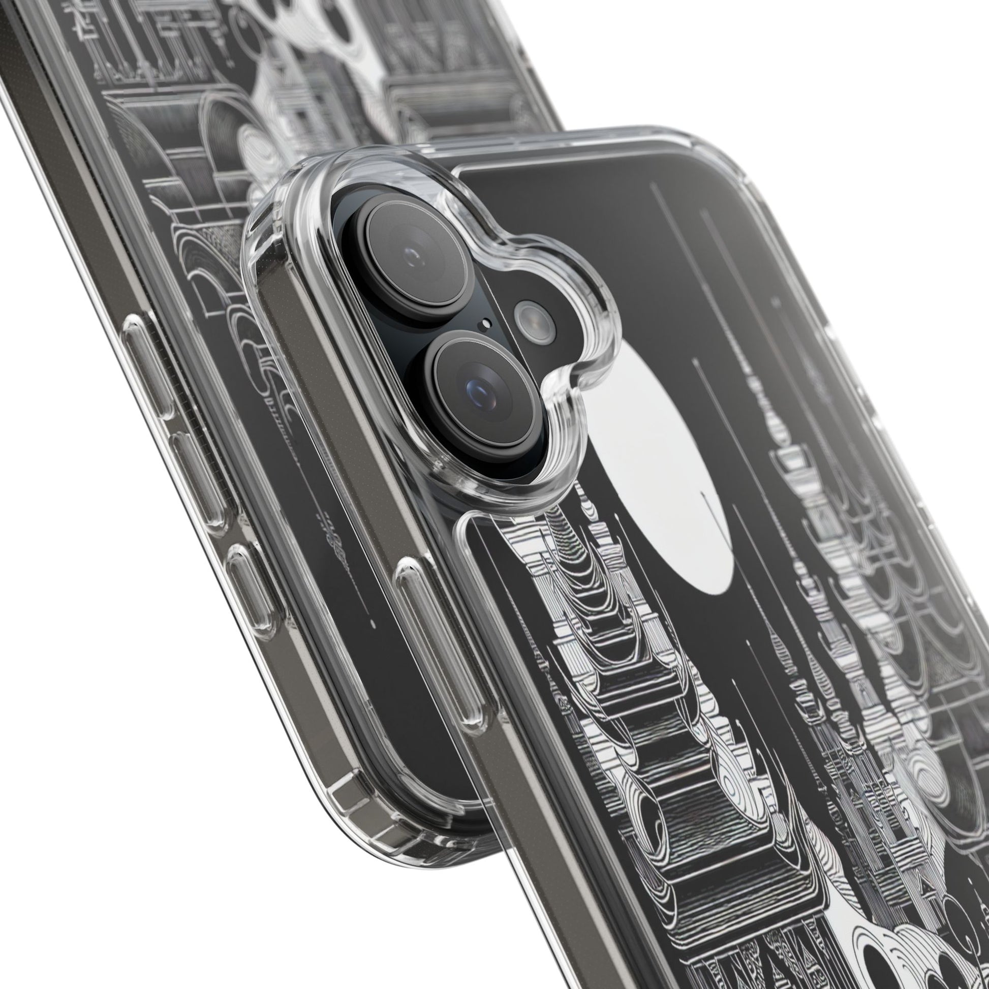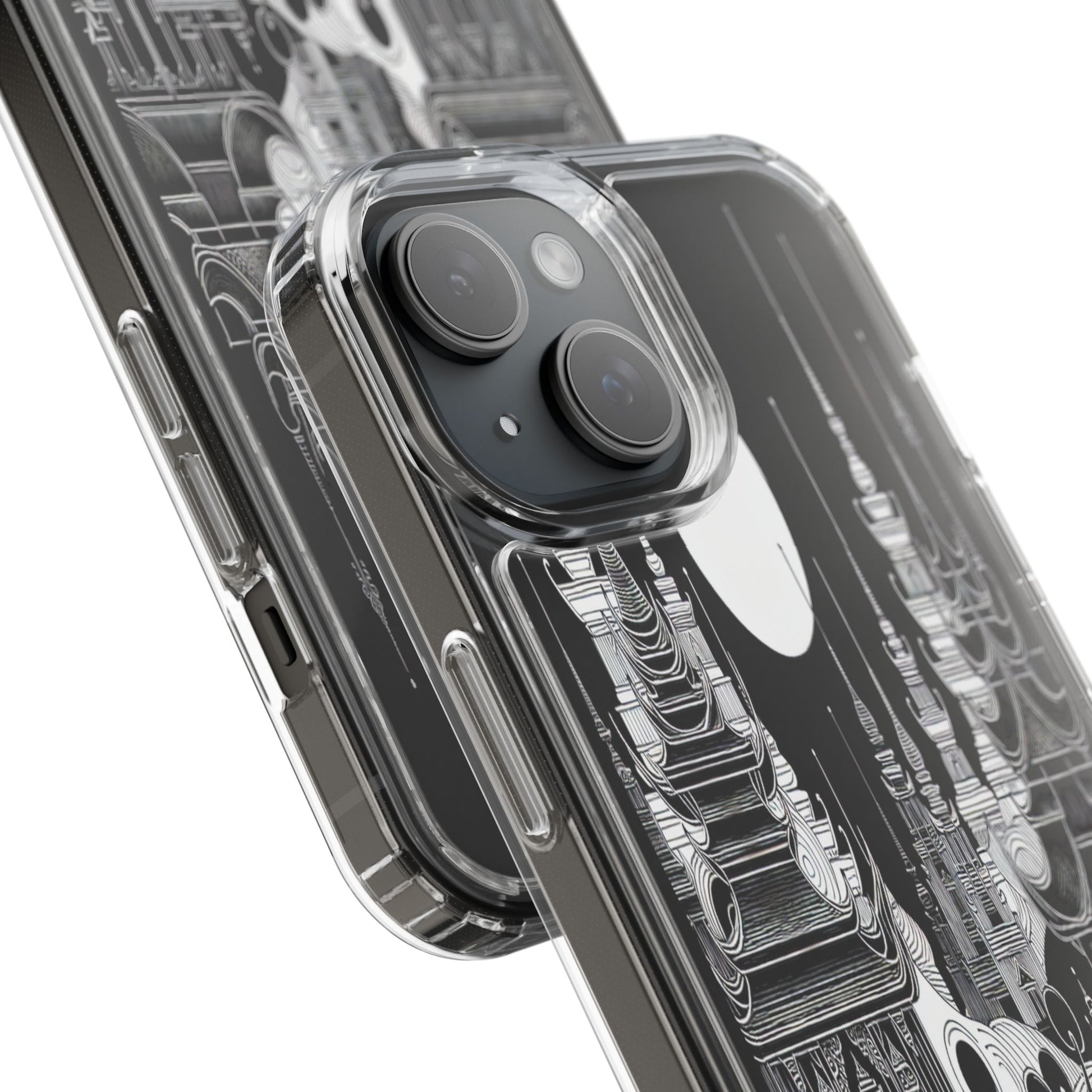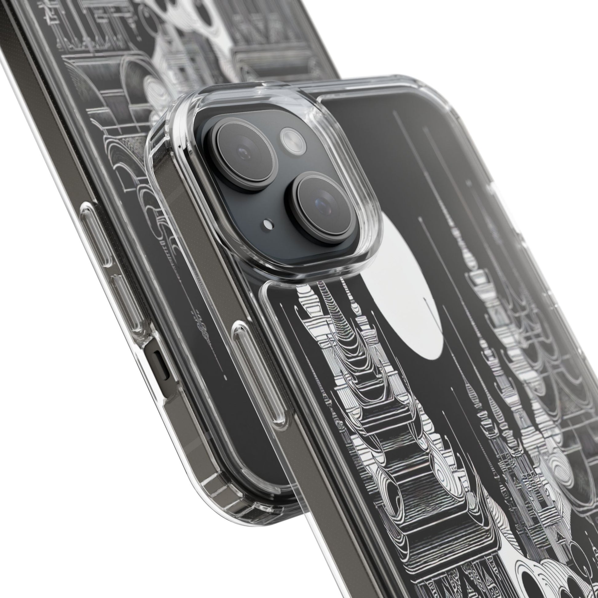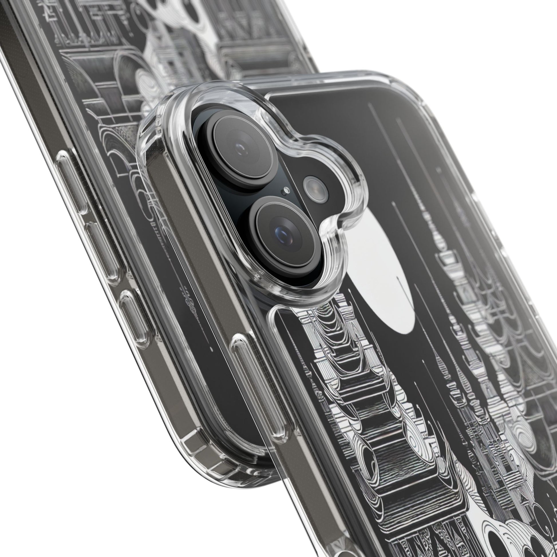 A mesmerizing, intricate line art piece featuring ornate temple architecture under a luminous moon, with flowing, wave-like patterns and bold contrasts creating a dreamlike skyline. Protect your phone while showcasing its sleek design with our customizable clear phone case, designed to fit iPhones from the latest iPhone 16 to earlier models like iPhone XR, XS, and X. This slim and lightweight case is perfect for guarding against daily wear and tear, offering shock-absorbing and scratch-resistant protection.