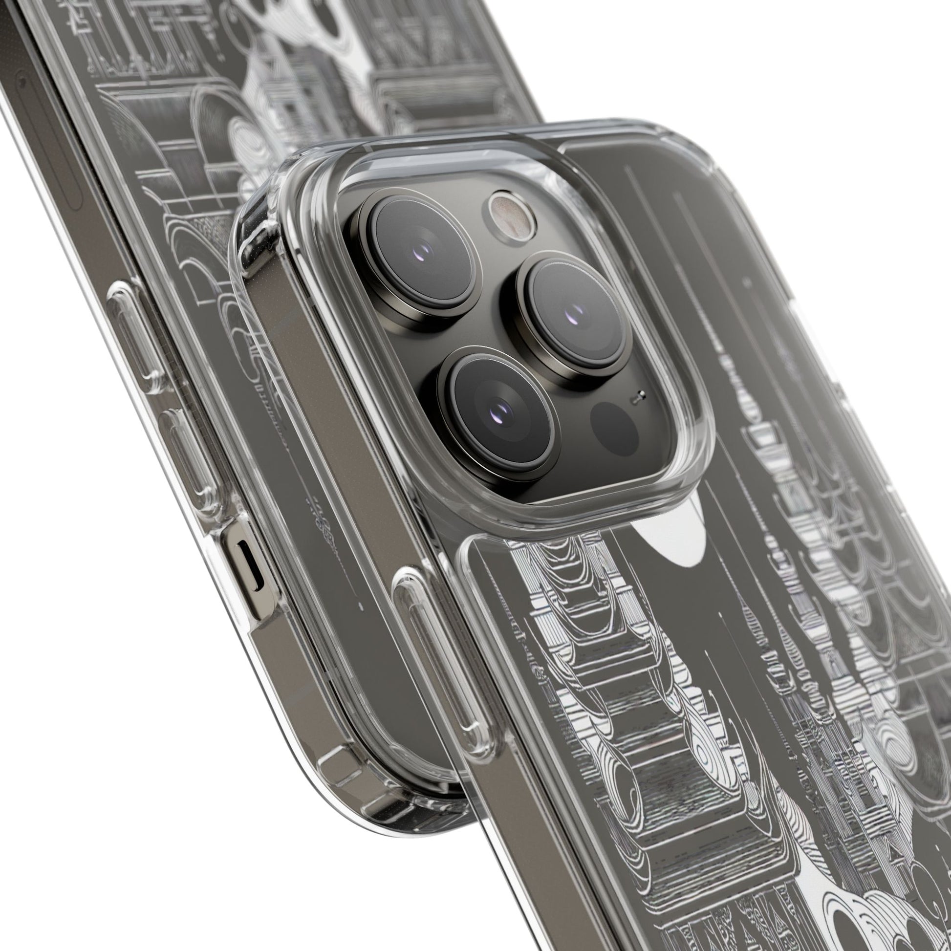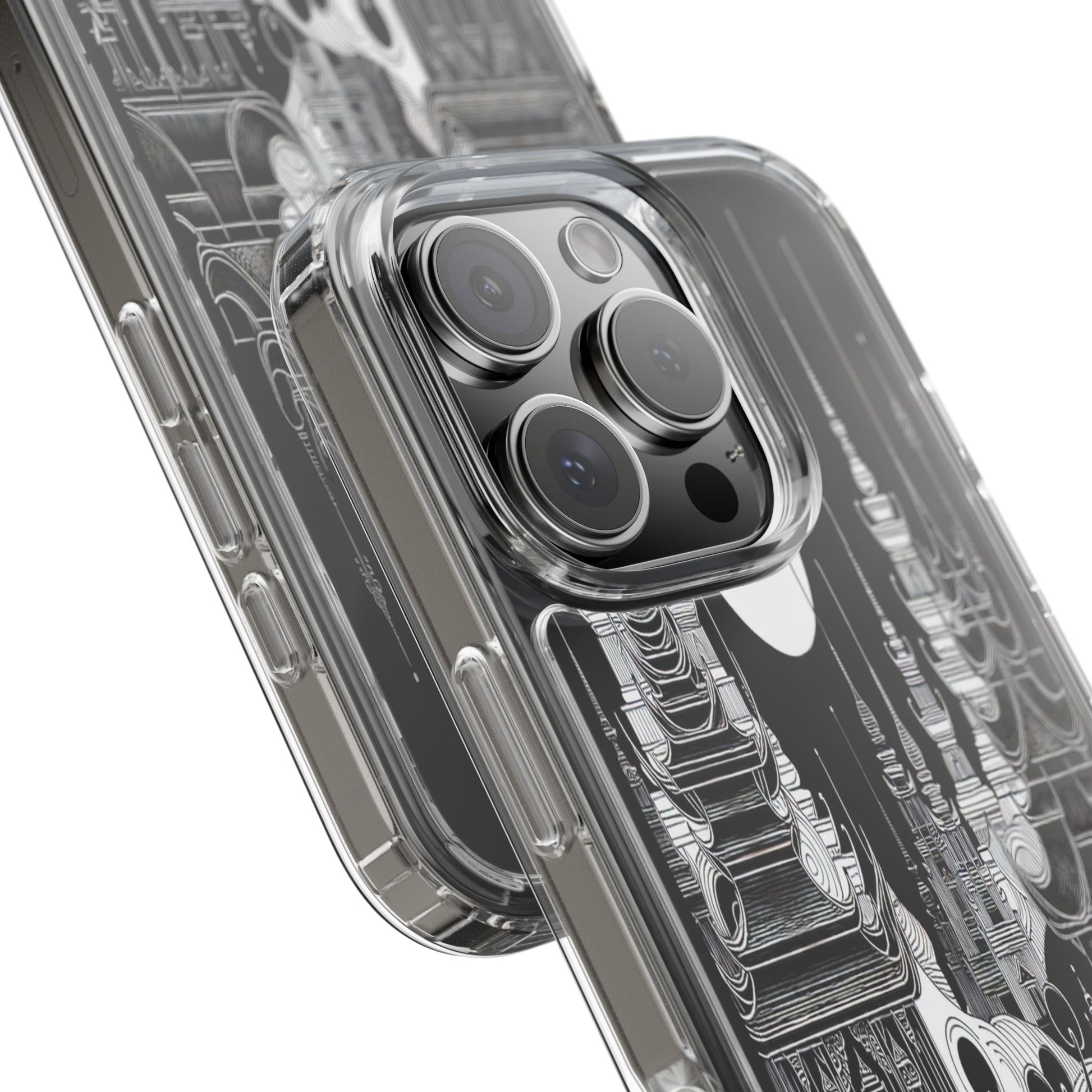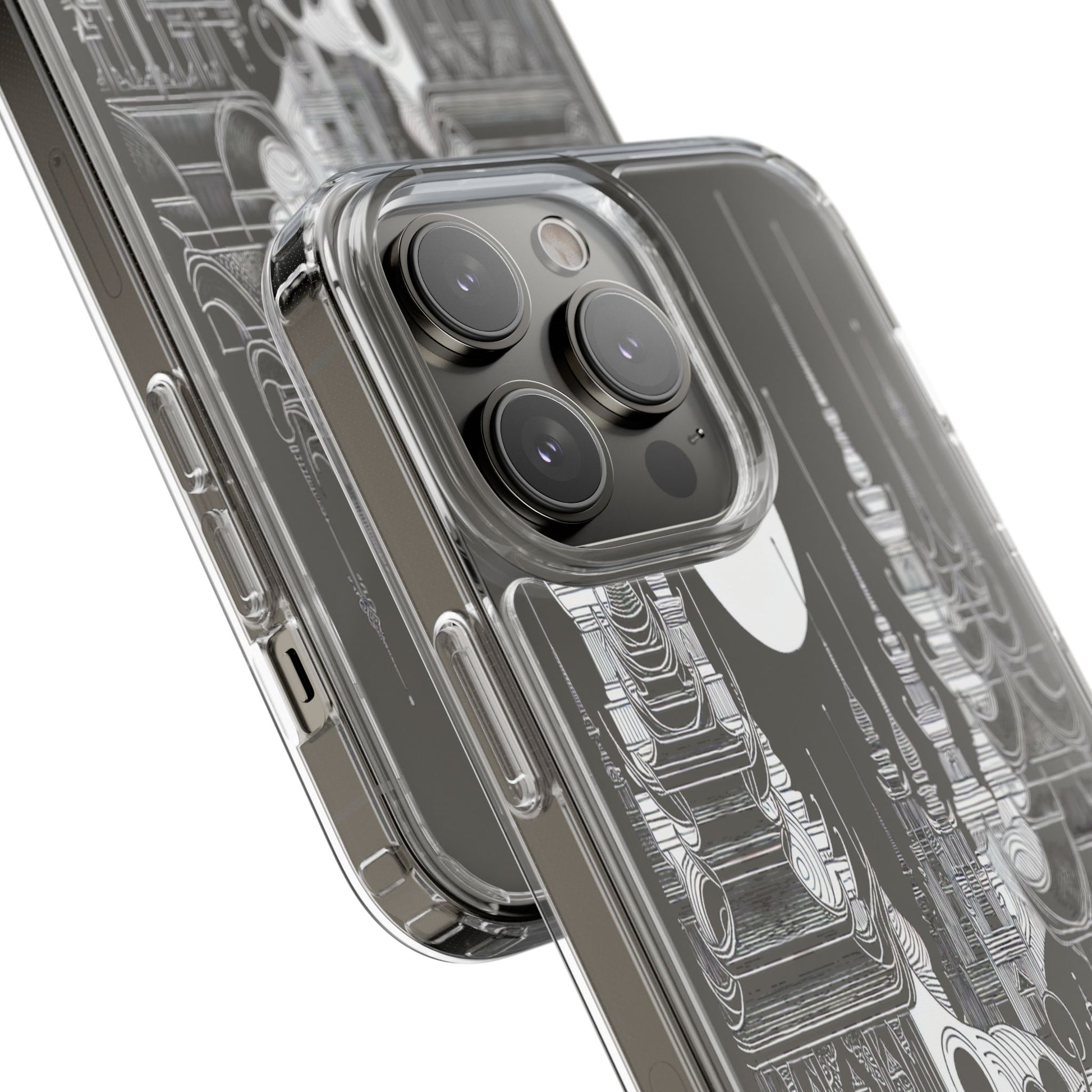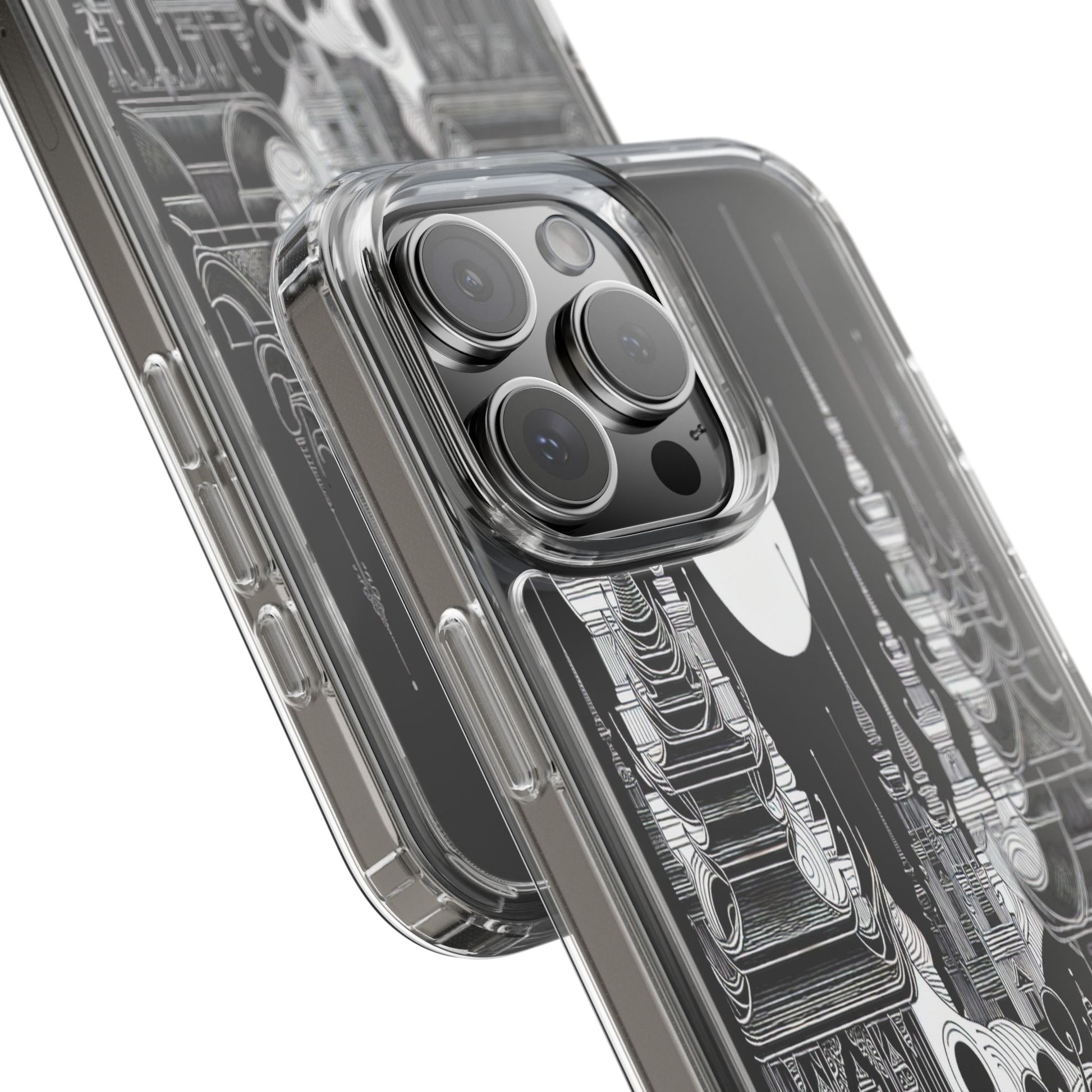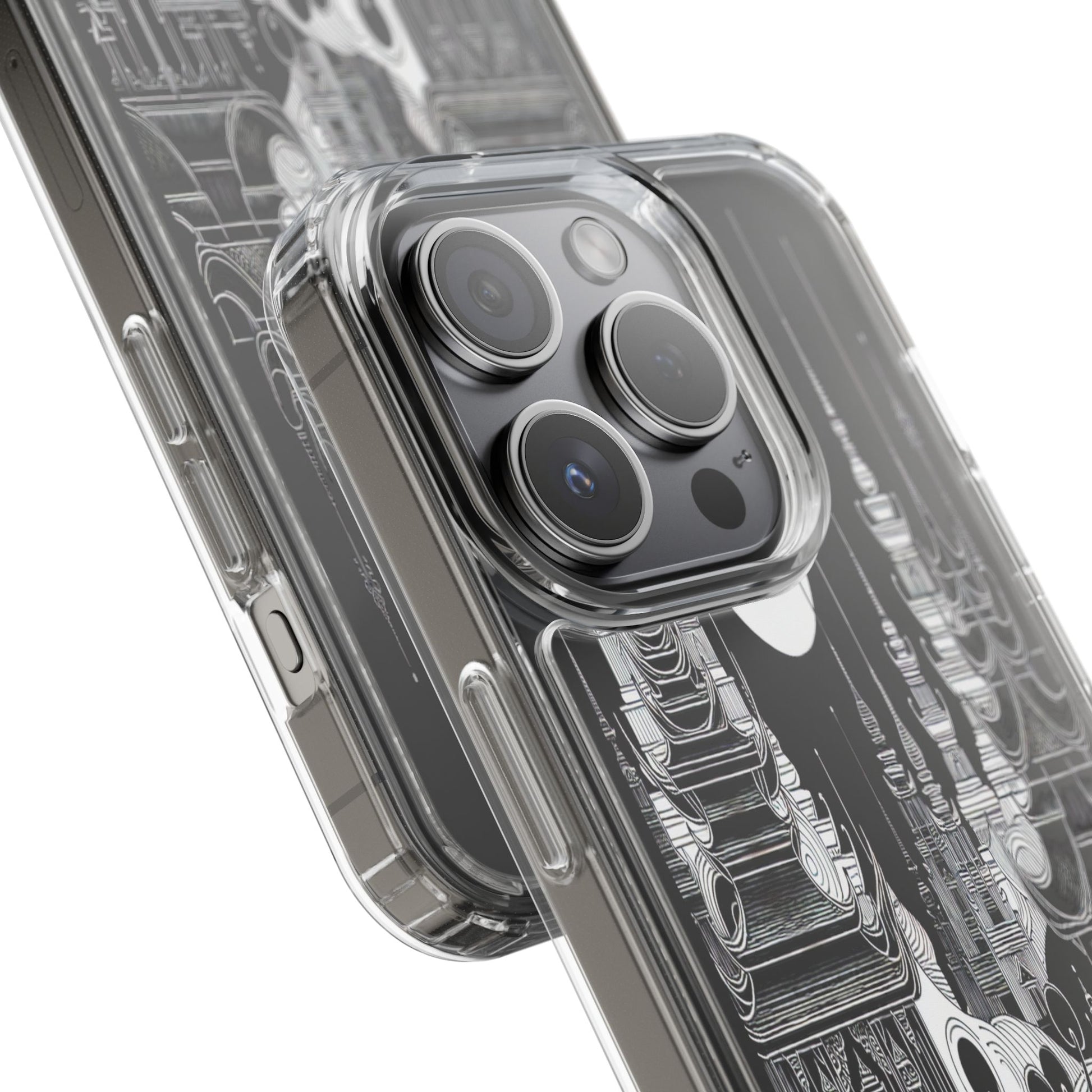 A mesmerizing, intricate line art piece featuring ornate temple architecture under a luminous moon, with flowing, wave-like patterns and bold contrasts creating a dreamlike skyline. Protect your phone while showcasing its sleek design with our customizable clear phone case, designed to fit iPhones from the latest iPhone 16 to earlier models like iPhone XR, XS, and X. This slim and lightweight case is perfect for guarding against daily wear and tear, offering shock-absorbing and scratch-resistant protection.