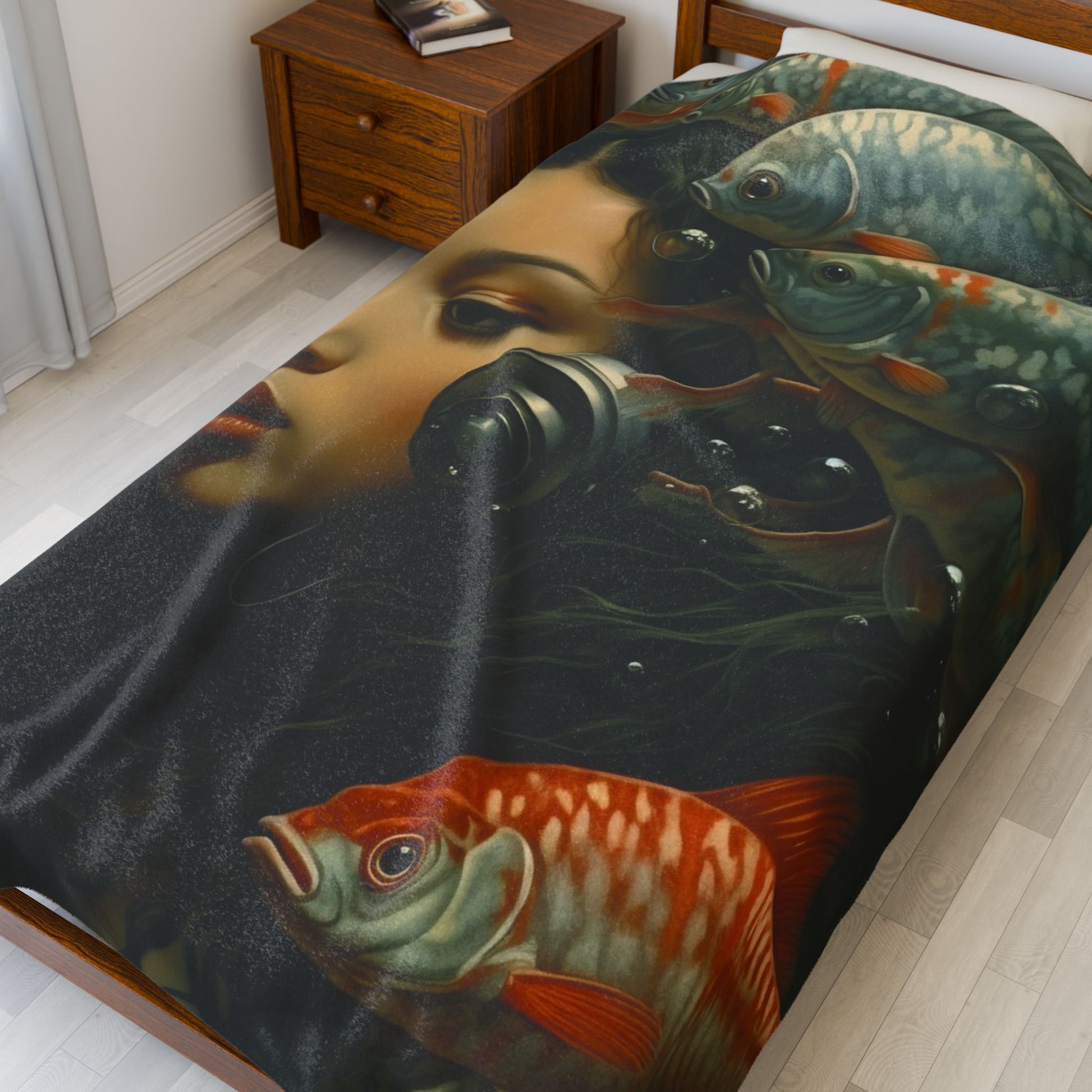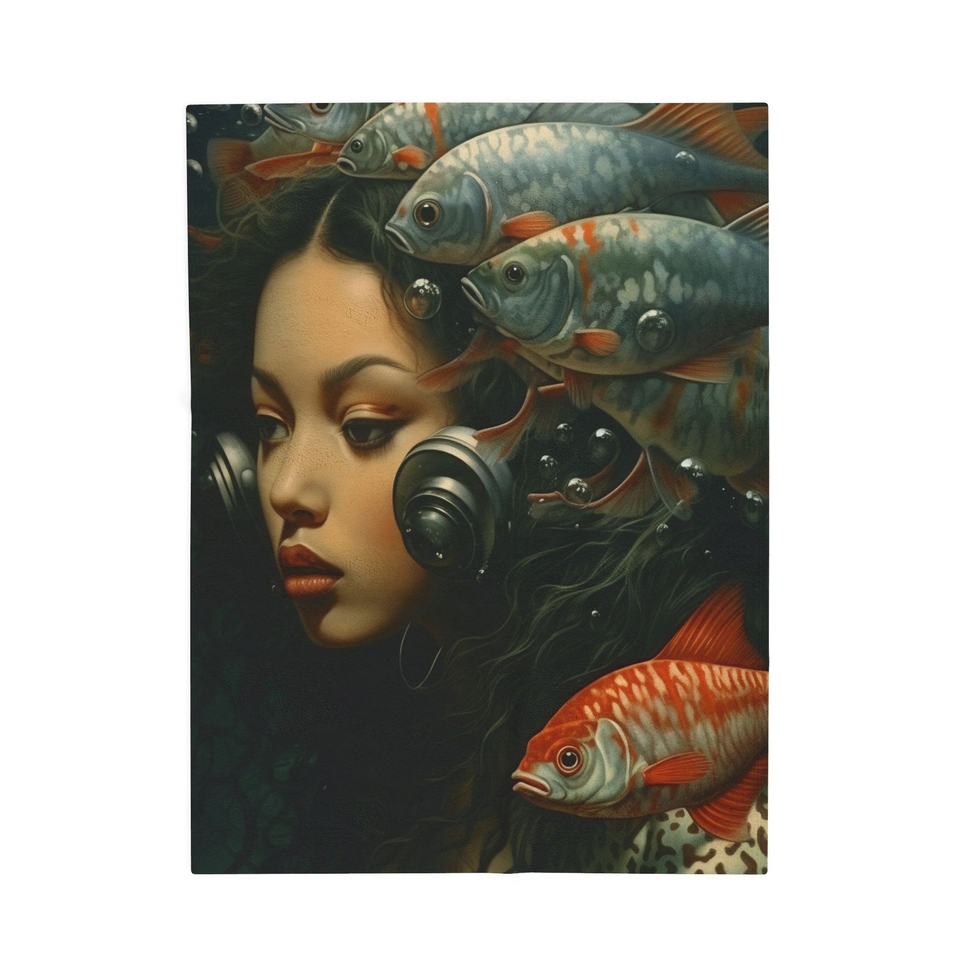 An underwater portrait fuses reality with fantasy, as koi fish swim serenely around a woman's face, adorned with sleek headphones, juxtaposing natural aquatic life with modern human connectivity. Create a cozy and warm atmosphere at home with this plush velveteen blanket. It is soft to touch and perfect for any home. Customize with a one-sided print to add your personal touch or create a gift for your friends and family. Available in three sizes: 30x40", 50x60", 60x80".
