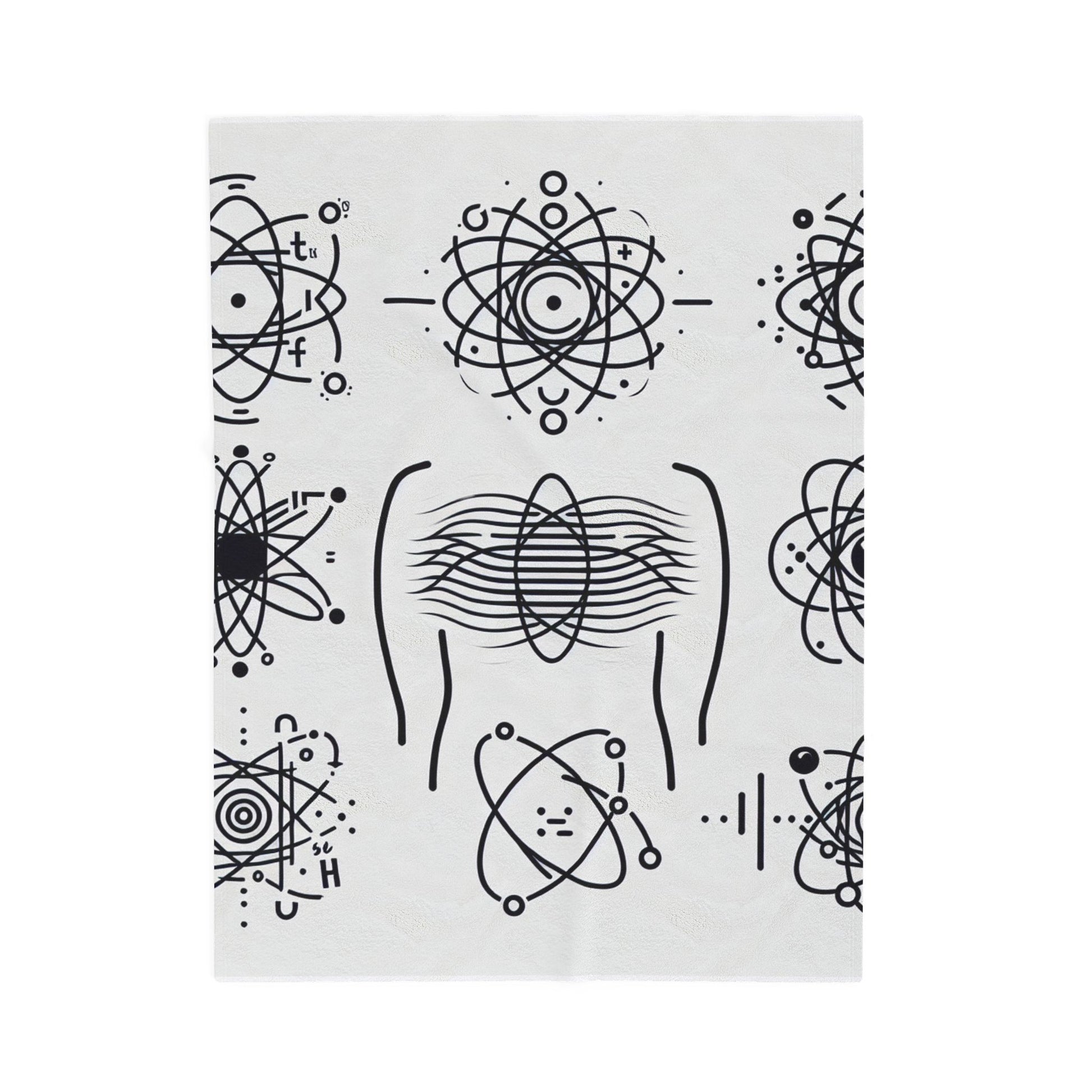 The image presents a collection of stylized atomic and quantum symbols, merging scientific imagery with creative design to form a series of visually engaging icons. Create a cozy and warm atmosphere at home with this plush velveteen blanket. It is soft to touch and perfect for any home. Customize with a one-sided print to add your personal touch or create a gift for your friends and family. Available in three sizes: 30x40", 50x60", 60x80".