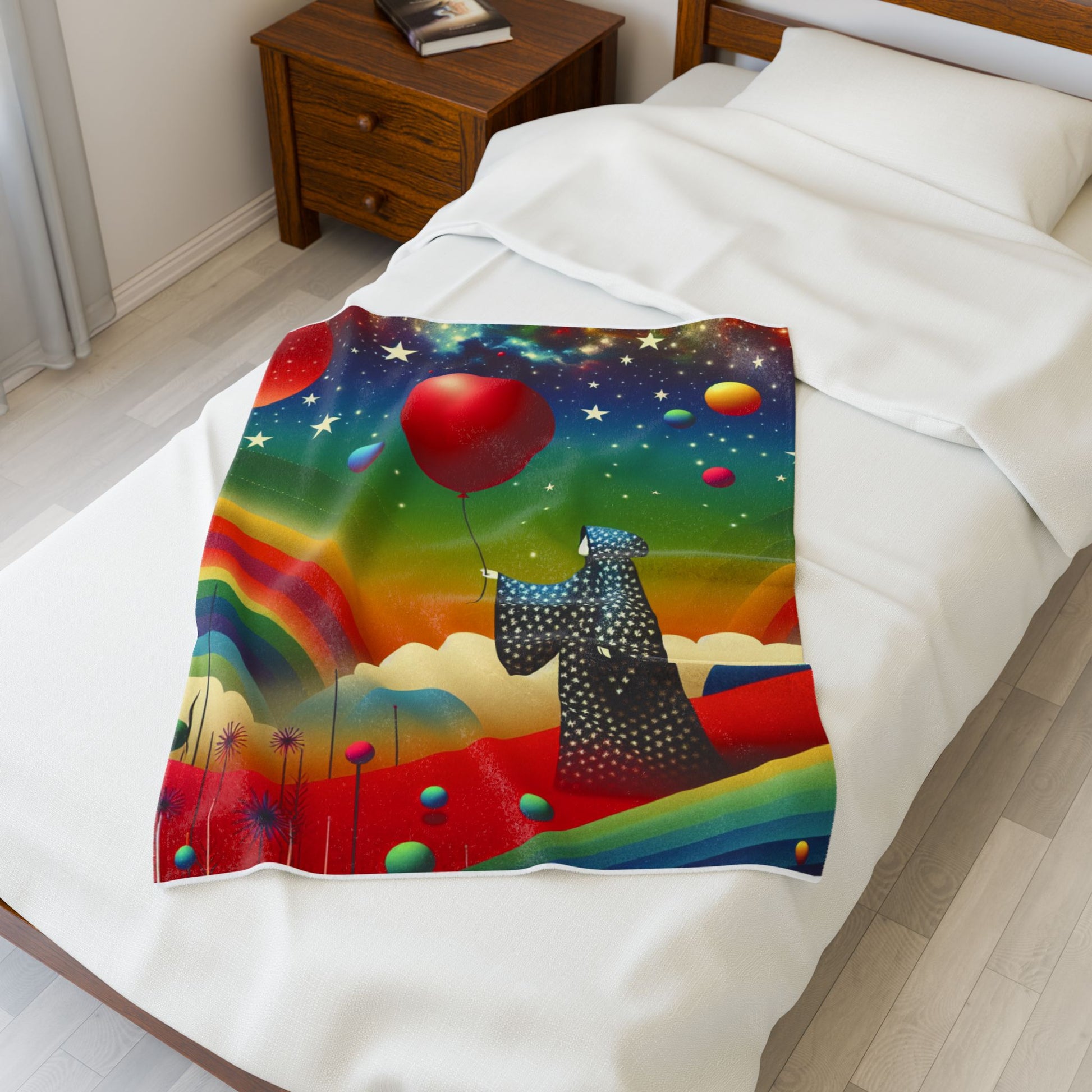 Whimsical and vibrant, this image features a starry-cloaked figure holding a red balloon amidst a psychedelic landscape of rainbows, colorful planets, and sparkling stars, blending cosmic and surreal elements into a dreamlike scene. Create a cozy and warm atmosphere at home with this plush velveteen blanket. It is soft to touch and perfect for any home. Customize with a one-sided print to add your personal touch or create a gift for your friends and family. Available in three sizes: 30x40", 50x60", 60x80".