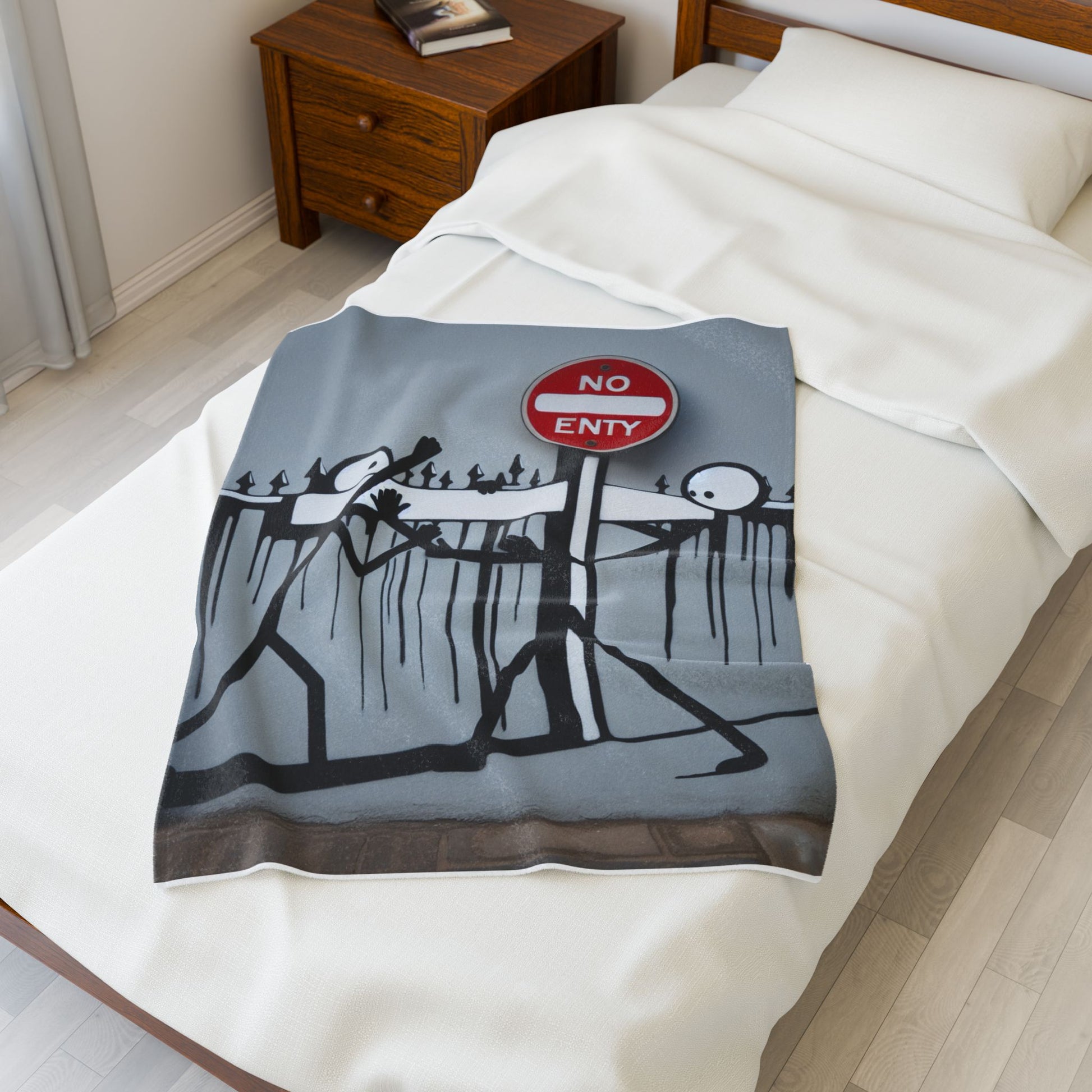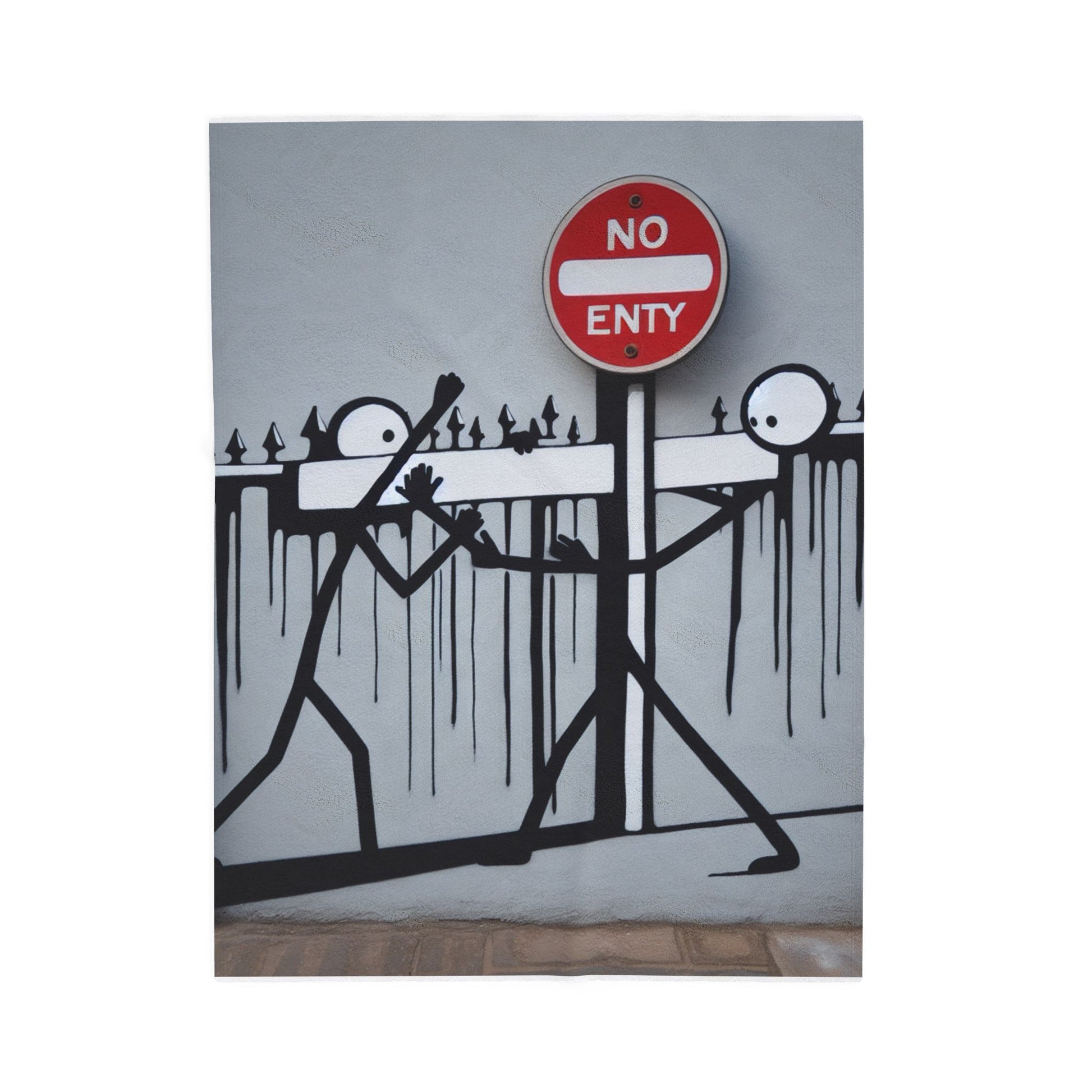 Street art cleverly integrates a "No Entry" sign with minimalist, dripping stick figures, creating a dynamic scene of two figures struggling against a barrier, merging functional street elements with imaginative expression. Create a cozy and warm atmosphere at home with this plush velveteen blanket. It is soft to touch and perfect for any home. Customize with a one-sided print to add your personal touch or create a gift for your friends and family. Available in three sizes: 30x40", 50x60", 60x80".