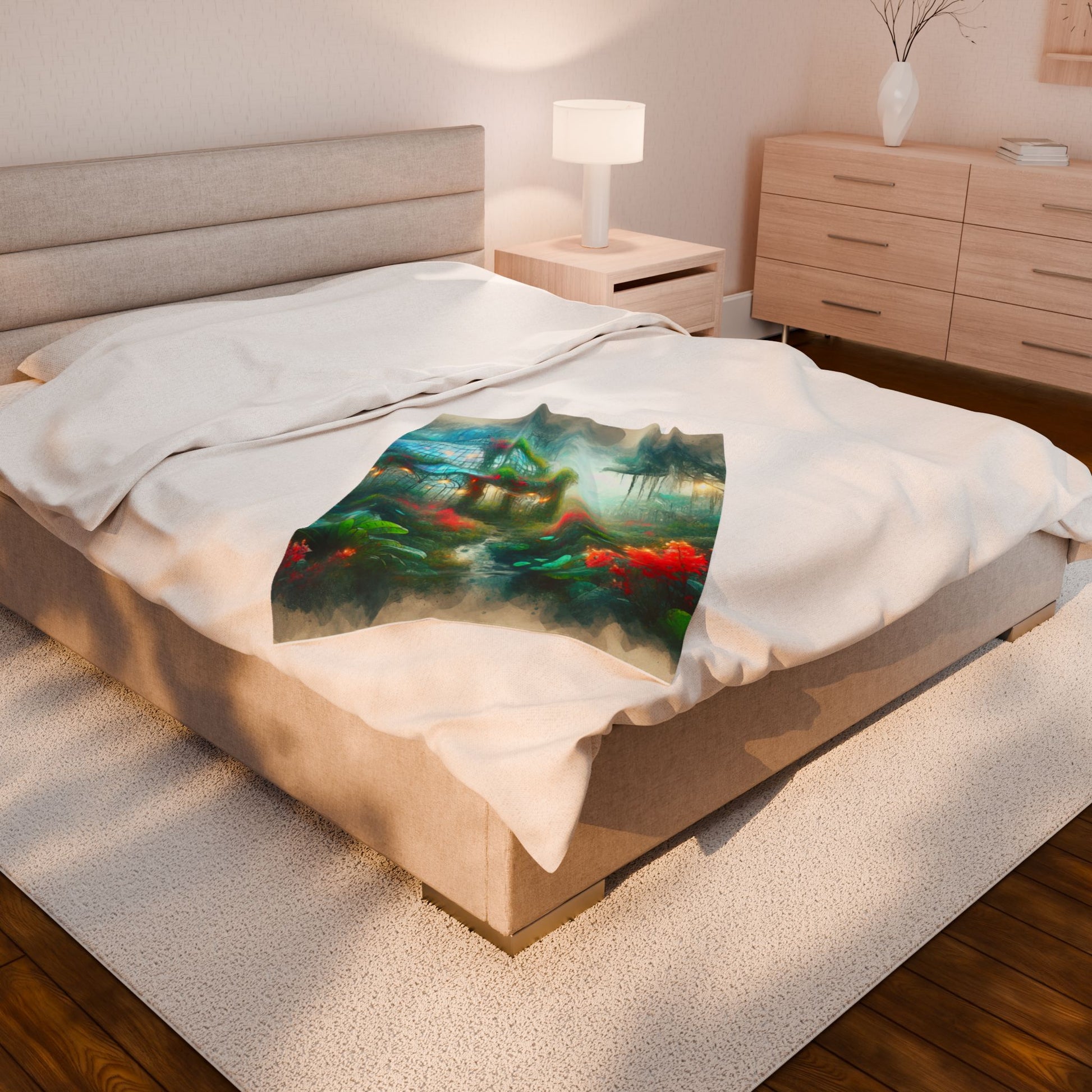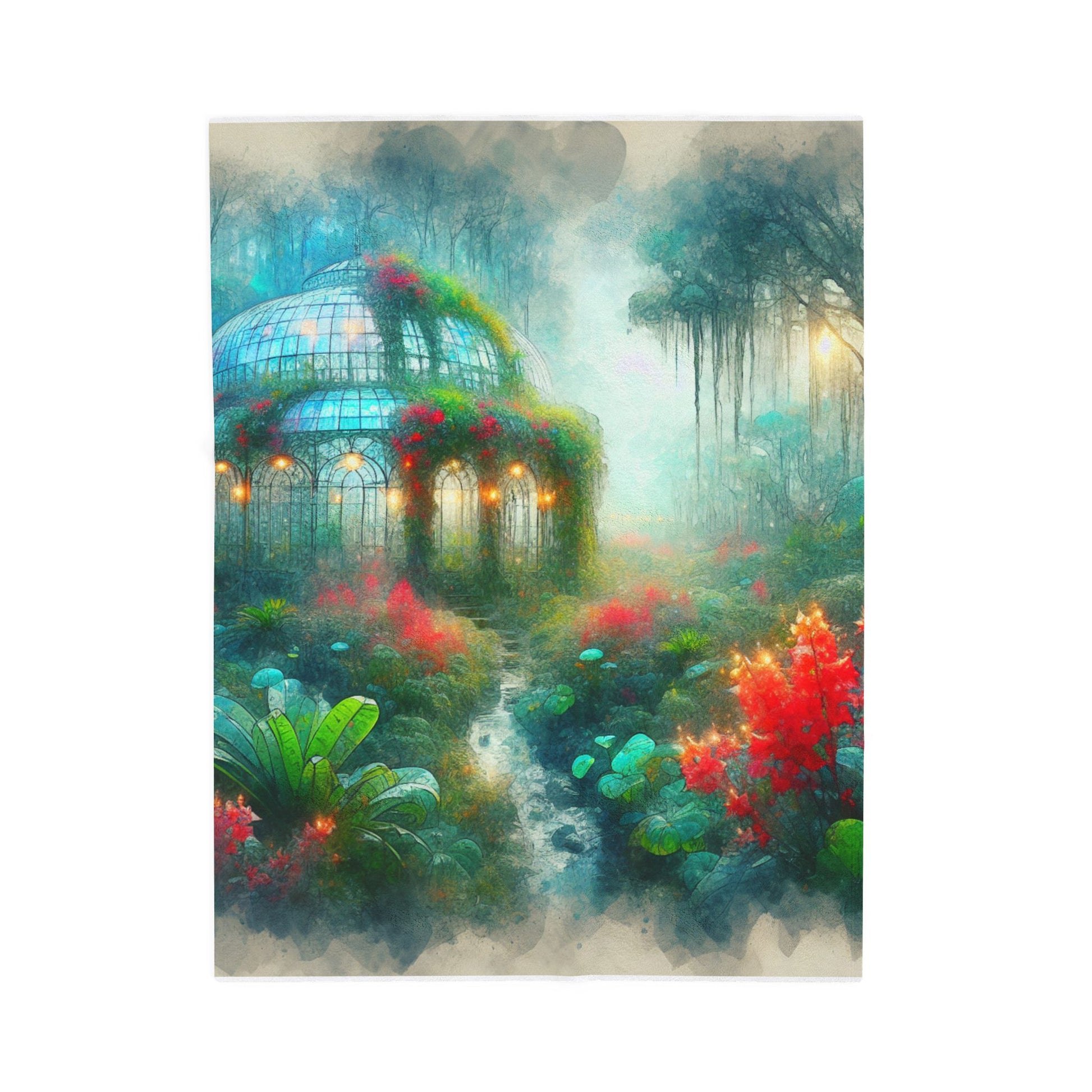 An ethereal glasshouse nestles within a mystical forest, glowing with soft lights amidst vibrant, flowering flora and a misty haze, evoking a dreamlike sanctuary untouched by time. Create a cozy and warm atmosphere at home with this plush velveteen blanket. It is soft to touch and perfect for any home. Customize with a one-sided print to add your personal touch or create a gift for your friends and family. Available in three sizes: 30x40", 50x60", 60x80".