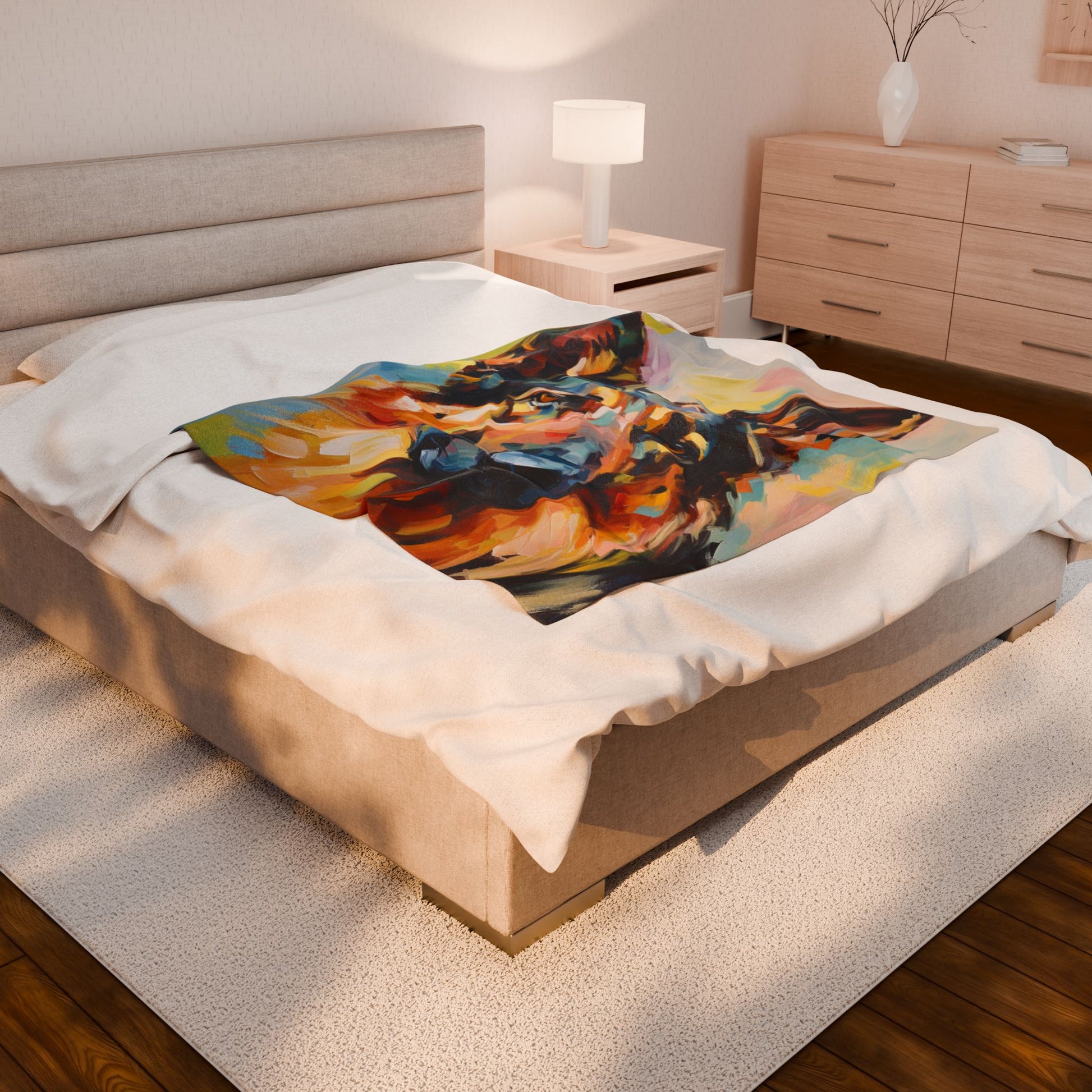 This vibrant portrait of a German Shepherd is composed of bold, impasto-style strokes, creating a mosaic of colorful abstraction that breathes life and personality into the subject. Create a cozy and warm atmosphere at home with this plush velveteen blanket. It is soft to touch and perfect for any home. Customize with a one-sided print to add your personal touch or create a gift for your friends and family. Available in three sizes: 30x40", 50x60", 60x80".