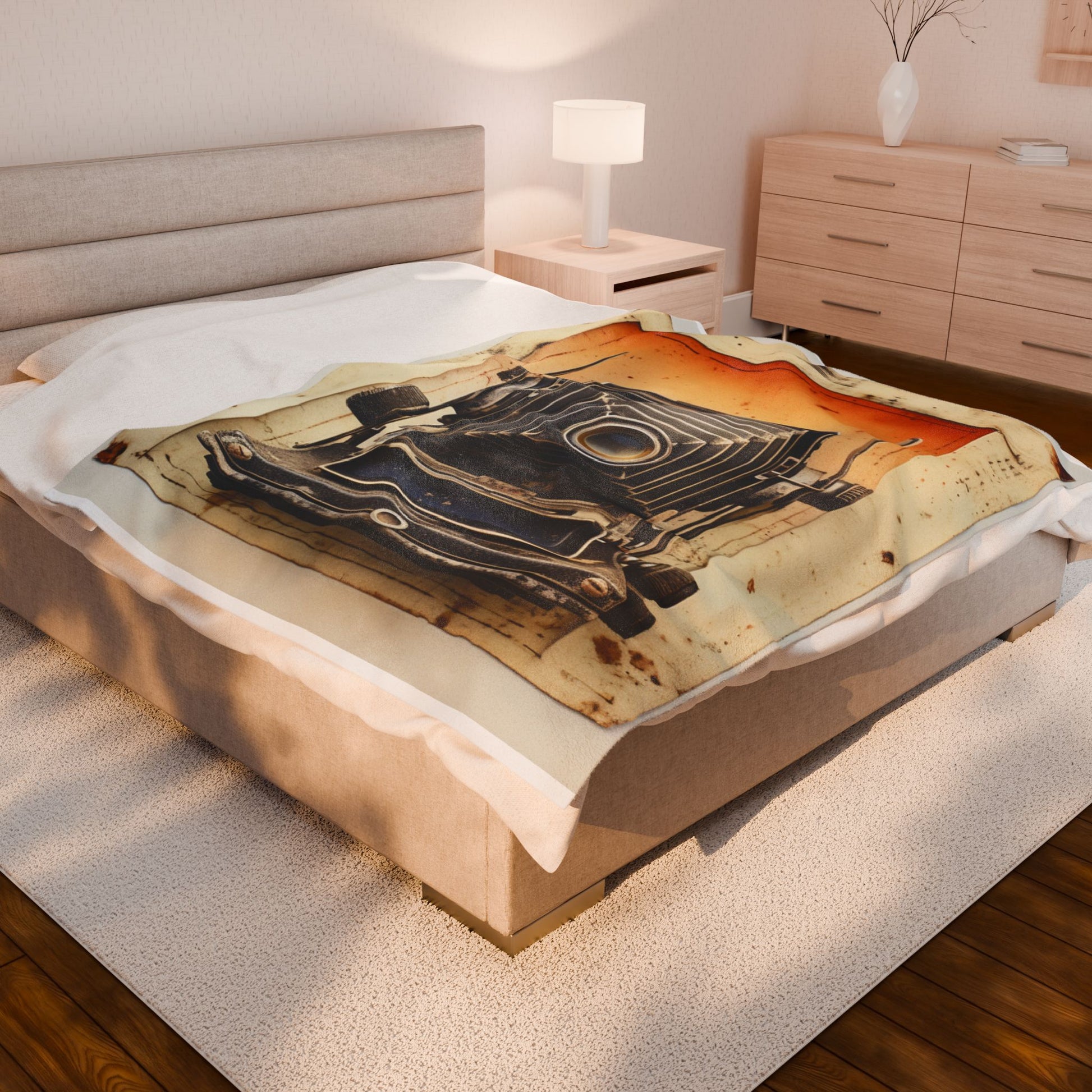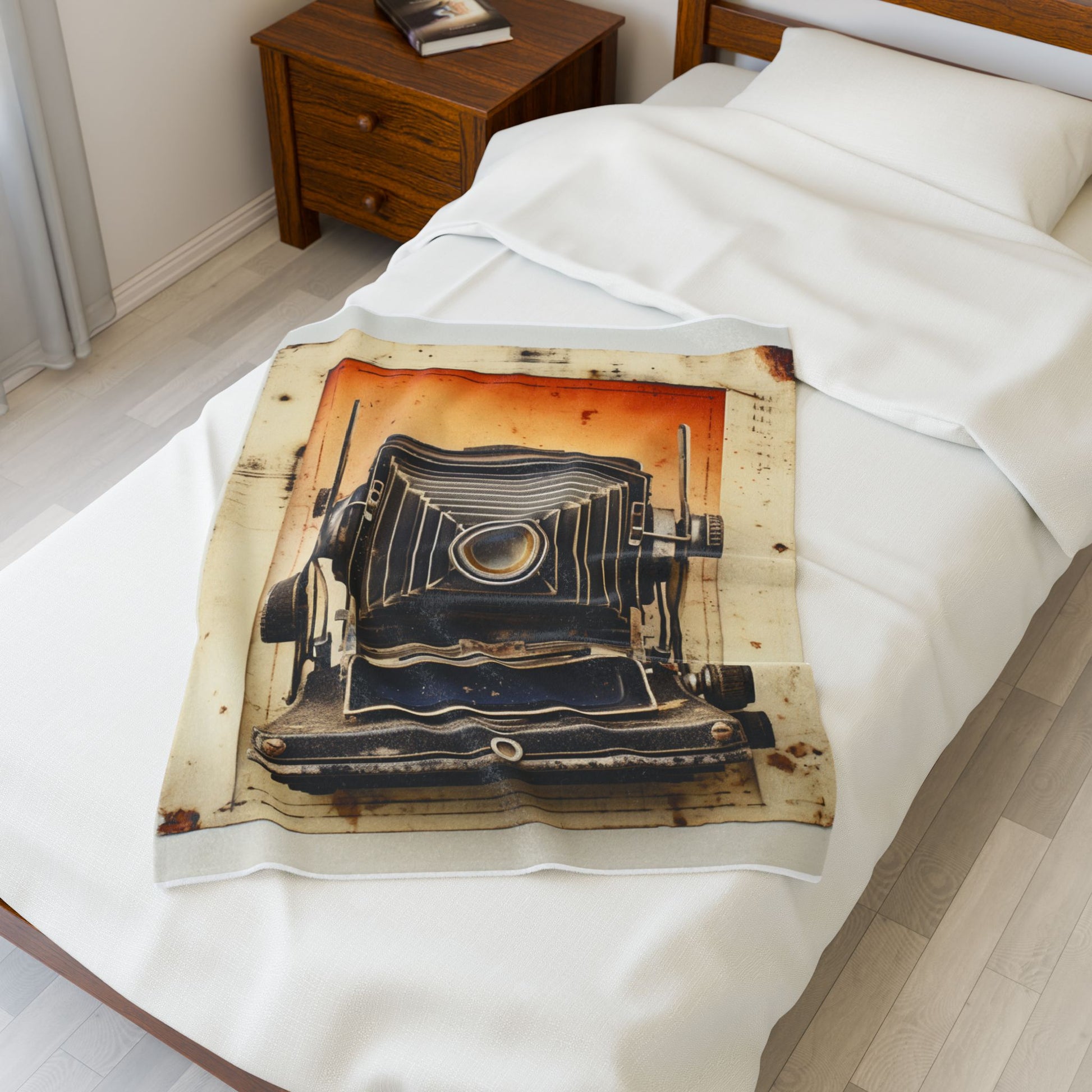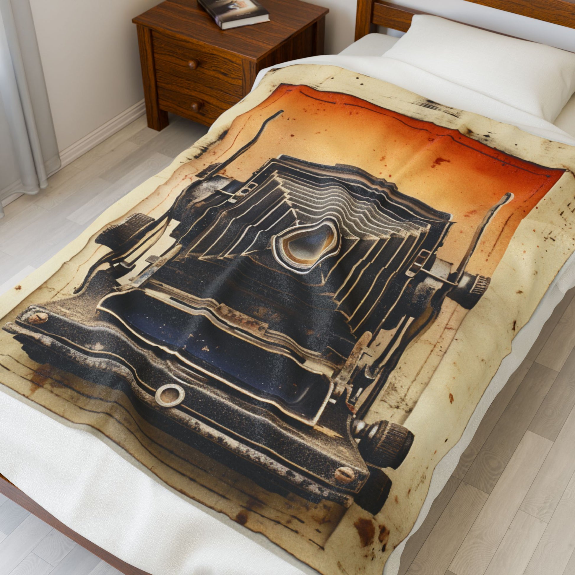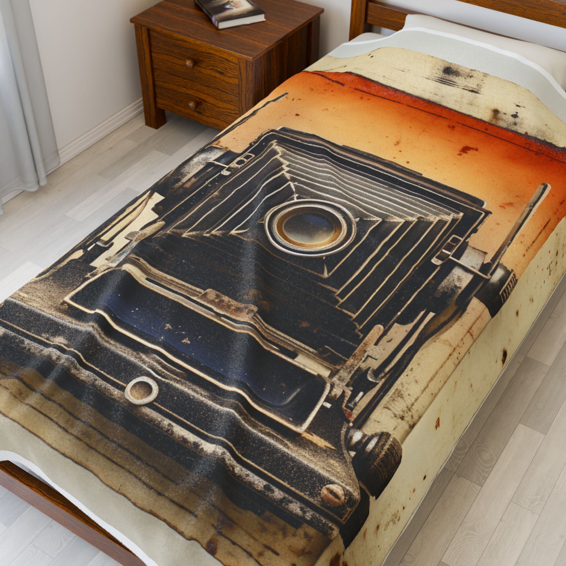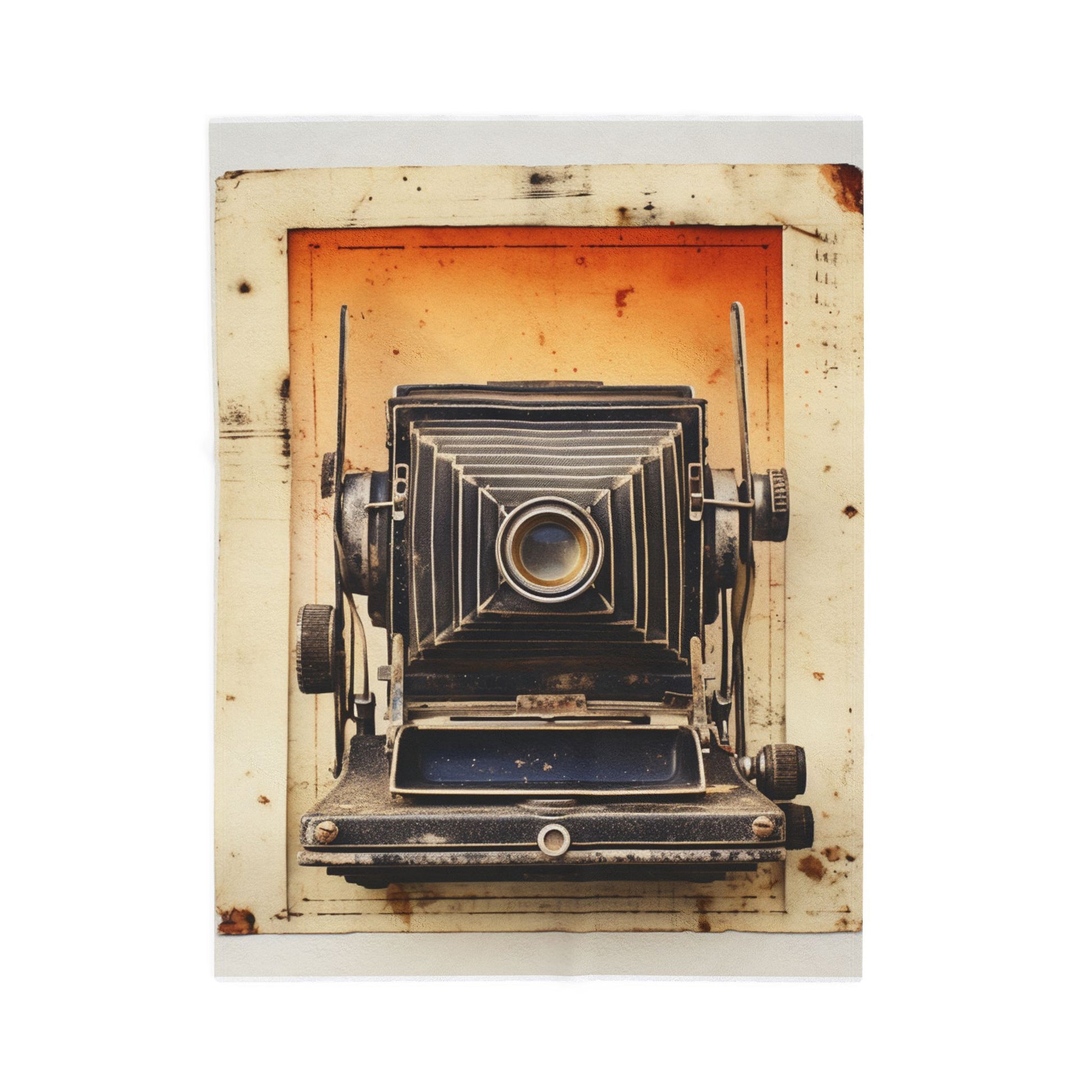 An antiquated camera with a bellows design rests against a weathered backdrop with gradient orange hues. Its vintage allure is amplified by the visible wear and rust, evoking nostalgia and appreciation for classic photography craftsmanship. Create a cozy and warm atmosphere at home with this plush velveteen blanket. It is soft to touch and perfect for any home. Customize with a one-sided print to add your personal touch or create a gift for your friends and family. Available in three sizes: 30x40", 50x60", 60x80".