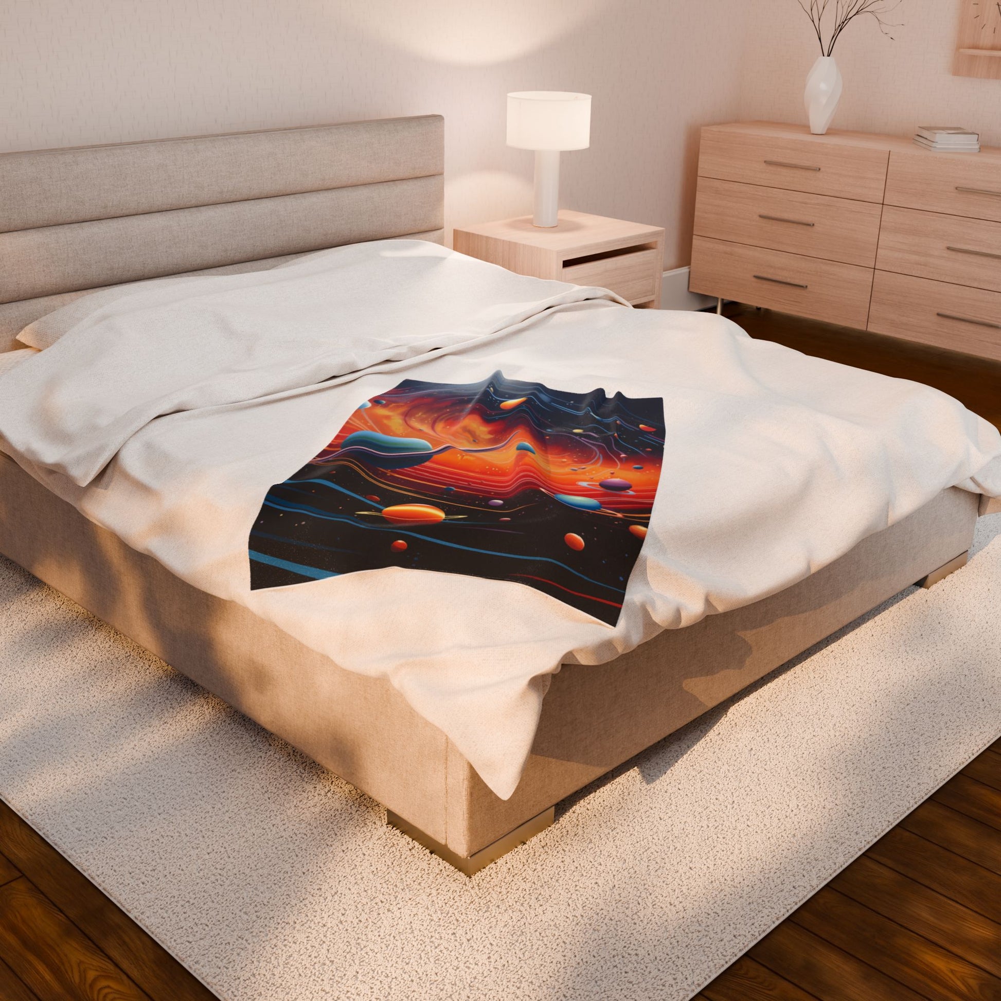 This image presents a vibrant rendition of a celestial dance, with a swirl of colorful planets and stars set against a fiery nebula backdrop. It captures the imagination with a sense of motion and the cosmic interplay of astral bodies in a stylized, almost whimsical universe. Create a cozy and warm atmosphere at home with this plush velveteen blanket. It is soft to touch and perfect for any home. Customize with a one-sided print to add your personal touch or create a gift for your friends and family. Available in three sizes: 30x40", 50x60", 60x80".