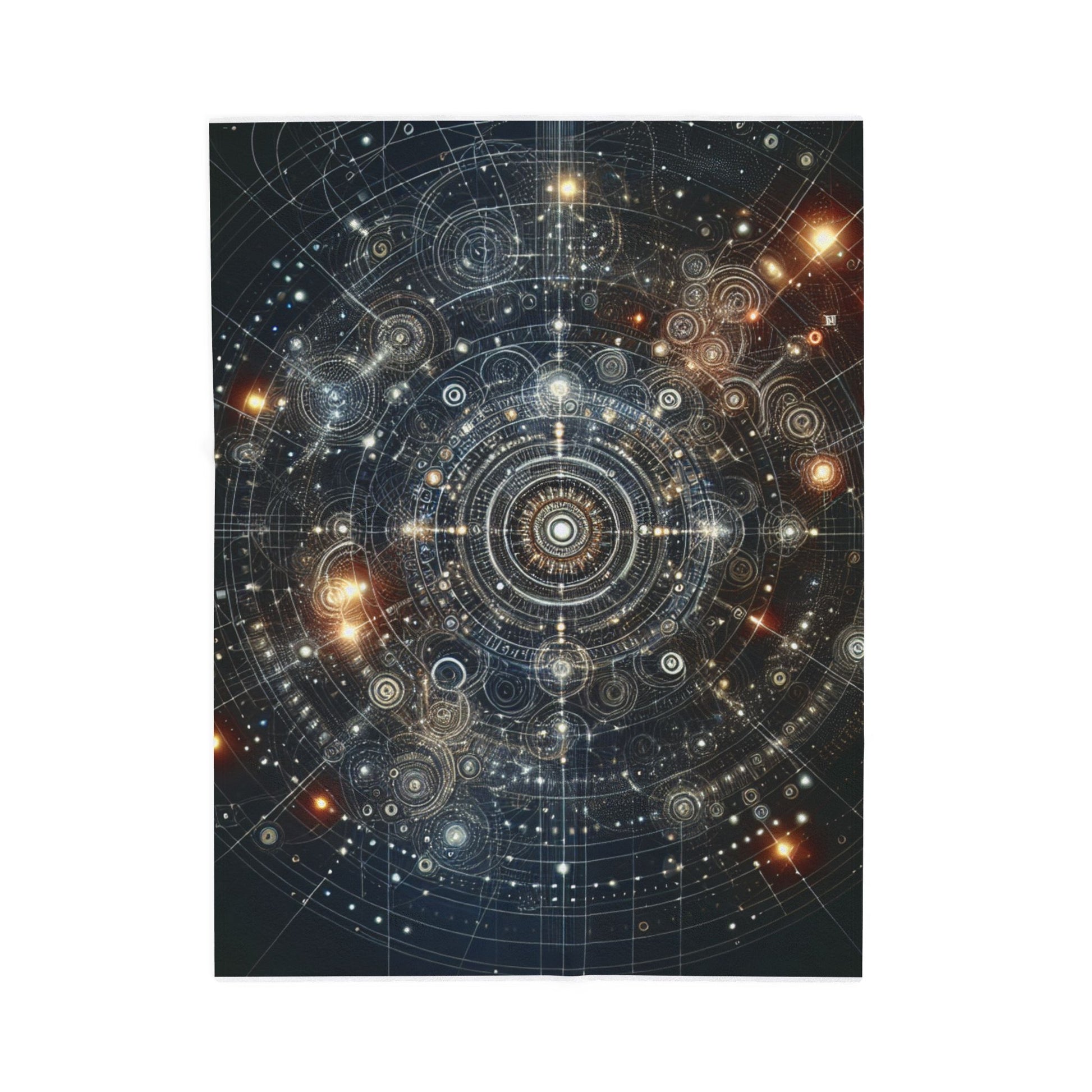 This intricate, celestial mandala features glowing orbs and geometric patterns, creating a cosmic tapestry. Radiant spirals and interconnected lines form a mesmerizing digital constellation, blending science and art seamlessly for a stellar visual experience. Create a cozy and warm atmosphere at home with this plush velveteen blanket. It is soft to touch and perfect for any home. Customize with a one-sided print to add your personal touch or create a gift for your friends and family. Available in three sizes: 30x40", 50x60", 60x80".