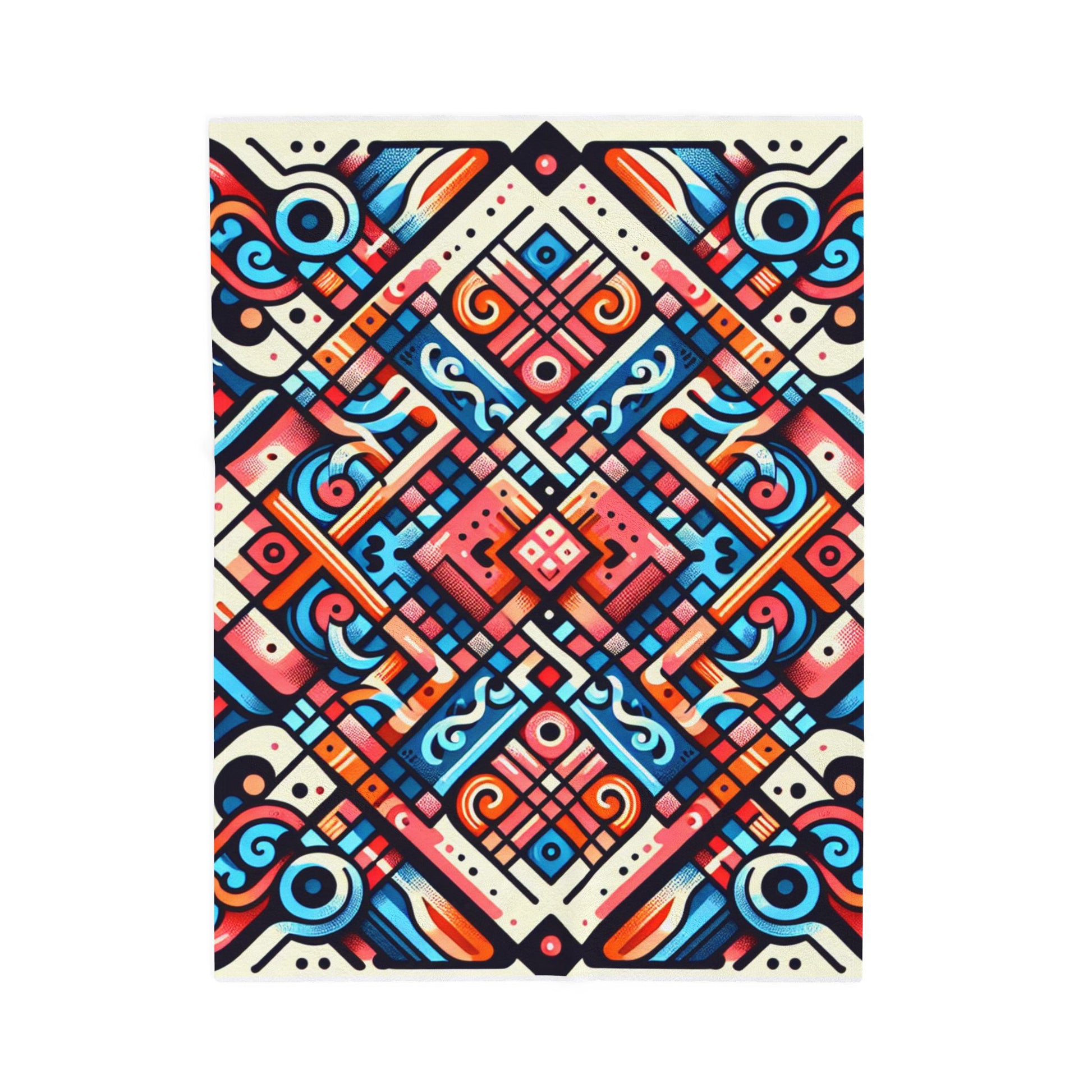 Vibrant geometric symphony with bold colors and intricate patterns intertwining. Abstract motifs blend with fluid lines, creating a dynamic tapestry of symmetry and movement. The vivid palette of blues, pinks, and oranges brings an energetic harmony, inviting endless exploration of its artistic balance. Create a cozy and warm atmosphere at home with this plush velveteen blanket. It is soft to touch and perfect for any home. Customize with a one-sided print to add your personal touch or create a gift for your friends and family. Available in three sizes: 30x40", 50x60", 60x80".