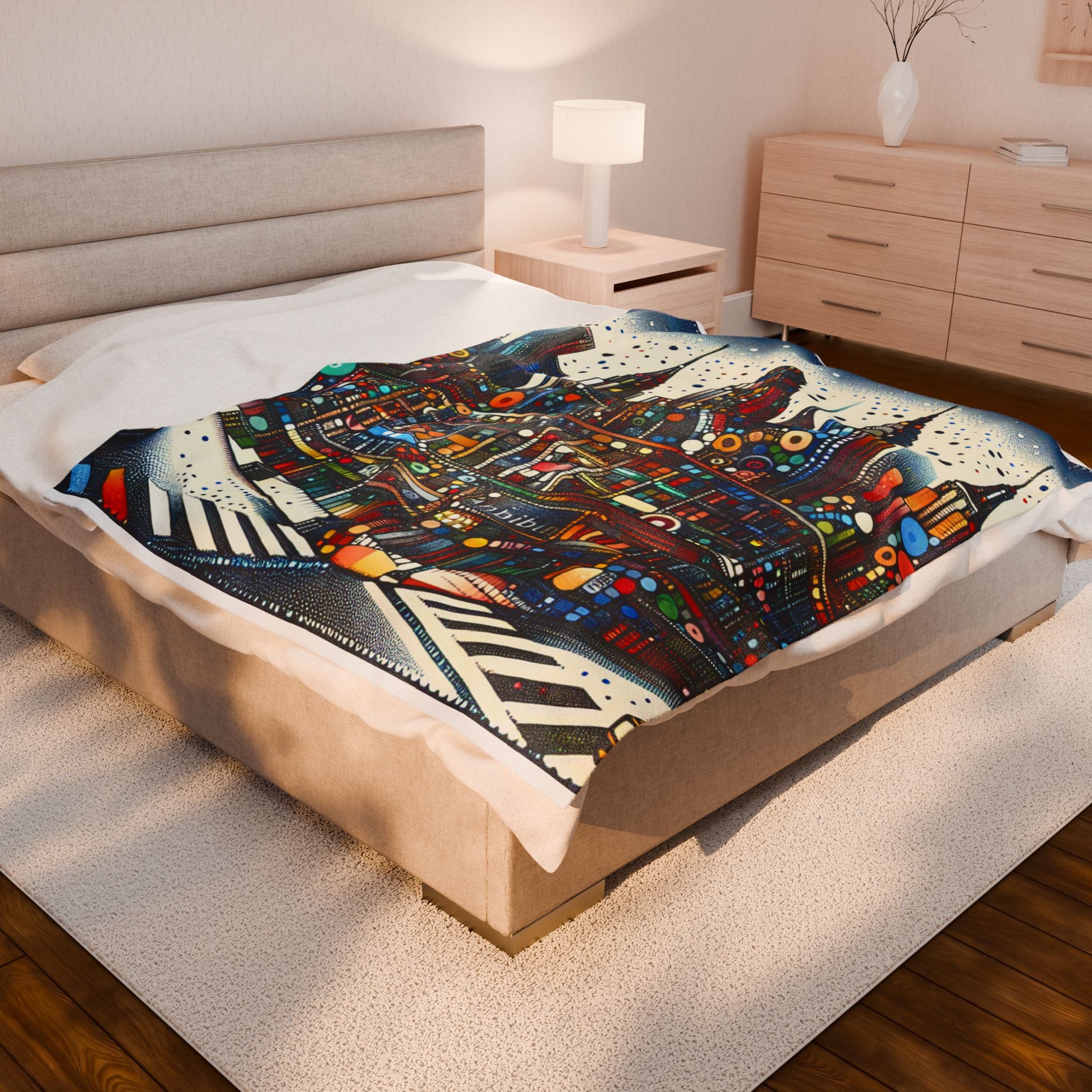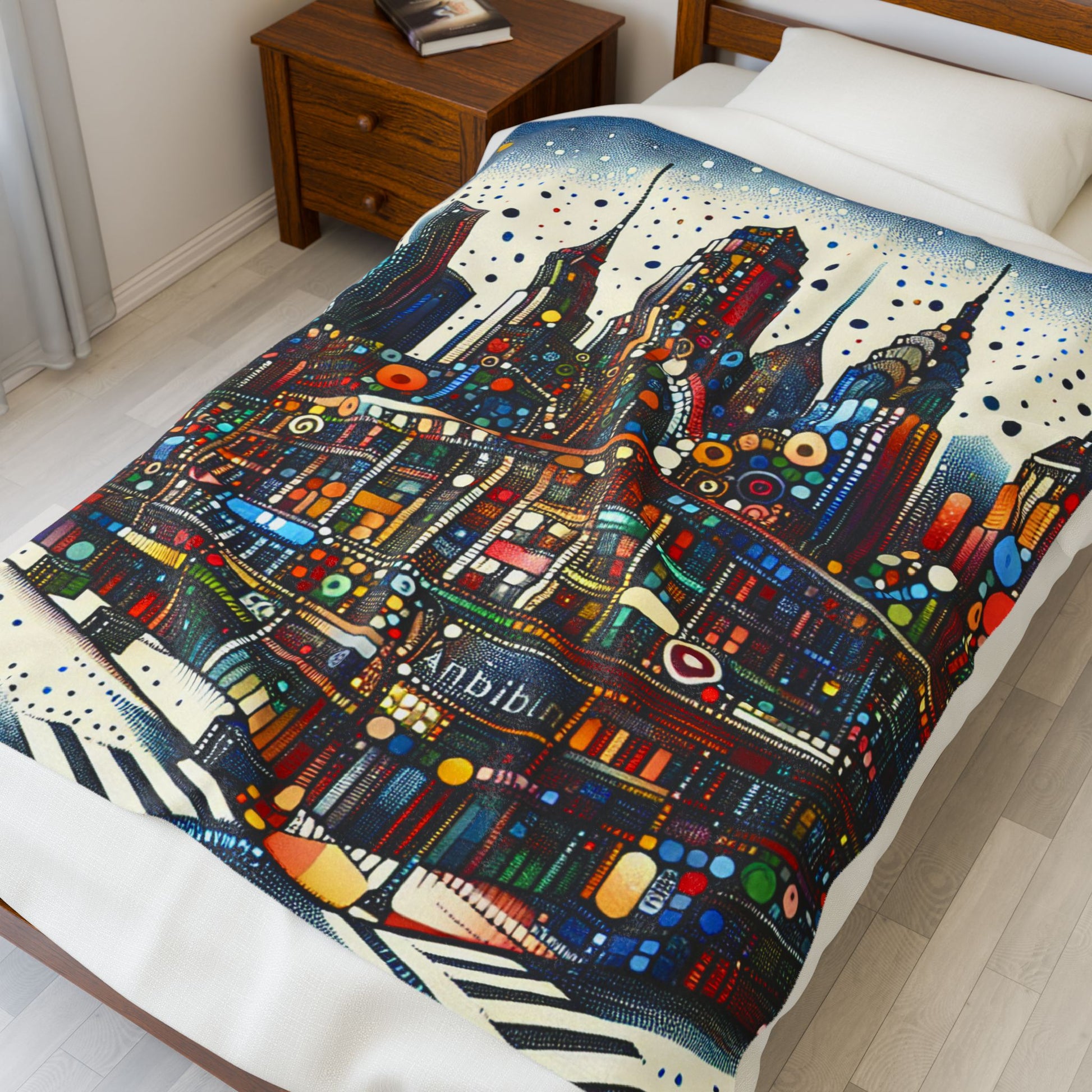 A vibrant cityscape explodes with colorful dot patterns and swirling abstract shapes, creating a mosaic-like texture. The whimsical blend of architecture and playful circles transforms an urban scene into a dynamic, dreamlike vision. Create a cozy and warm atmosphere at home with this plush velveteen blanket. It is soft to touch and perfect for any home. Customize with a one-sided print to add your personal touch or create a gift for your friends and family. Available in three sizes: 30x40", 50x60", 60x80".