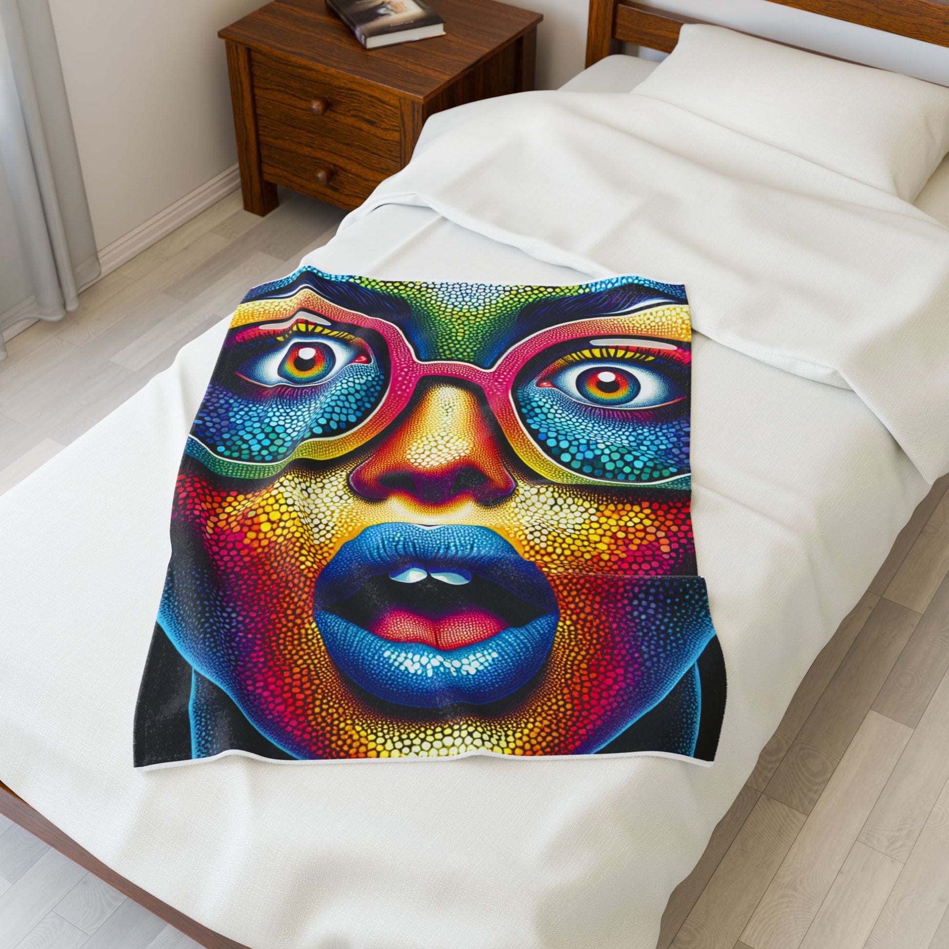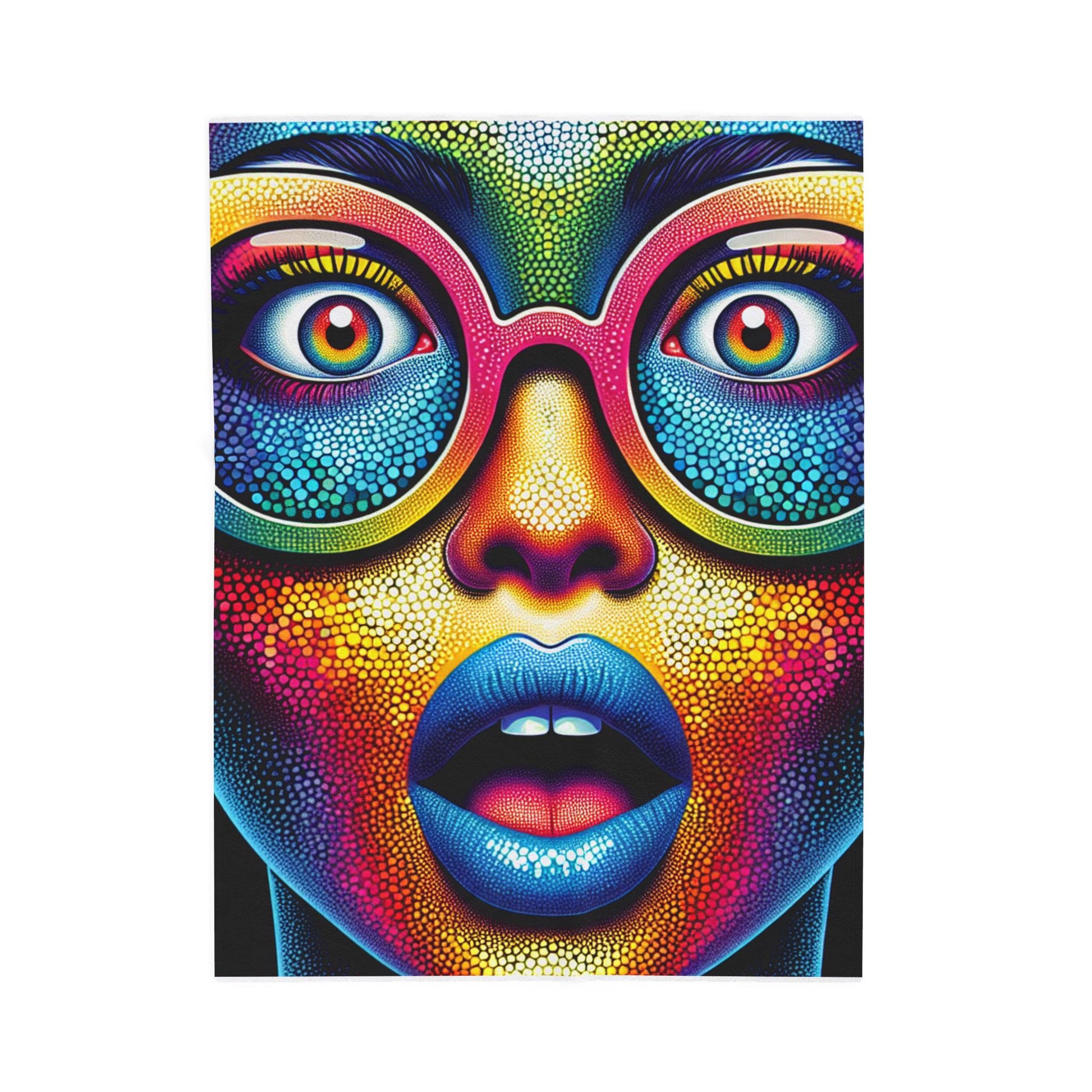 A vibrant digital artwork featuring a face with kaleidoscopic glasses, and a pattern of vivid, mosaic-like dots. The expression is one of wonder and surprise, highlighted by bold, contrasting colors and intricate detail, creating a strikingly surreal and energetic visual experience. Create a cozy and warm atmosphere at home with this plush velveteen blanket. It is soft to touch and perfect for any home. Customize with a one-sided print to add your personal touch or create a gift for your friends and family. Available in three sizes: 30x40", 50x60", 60x80".