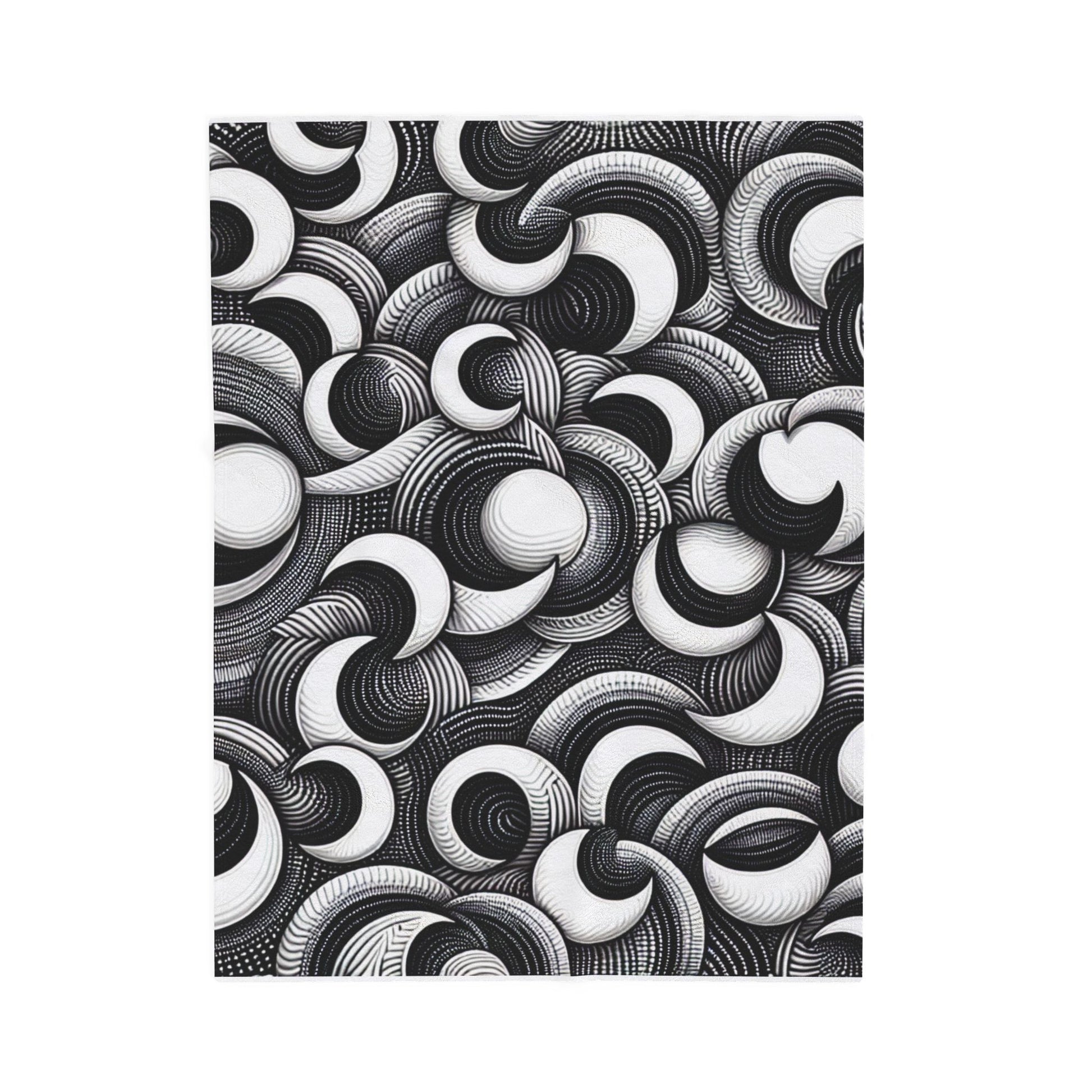 A mesmerizing black-and-white swirl of intricate patterns and crescents creates dynamic movement. Layered textures and dot work form a captivating dance of shadow and light, evoking a sense of cosmic energy and harmony. Create a cozy and warm atmosphere at home with this plush velveteen blanket. It is soft to touch and perfect for any home. Customize with a one-sided print to add your personal touch or create a gift for your friends and family. Available in three sizes: 30x40", 50x60", 60x80".
