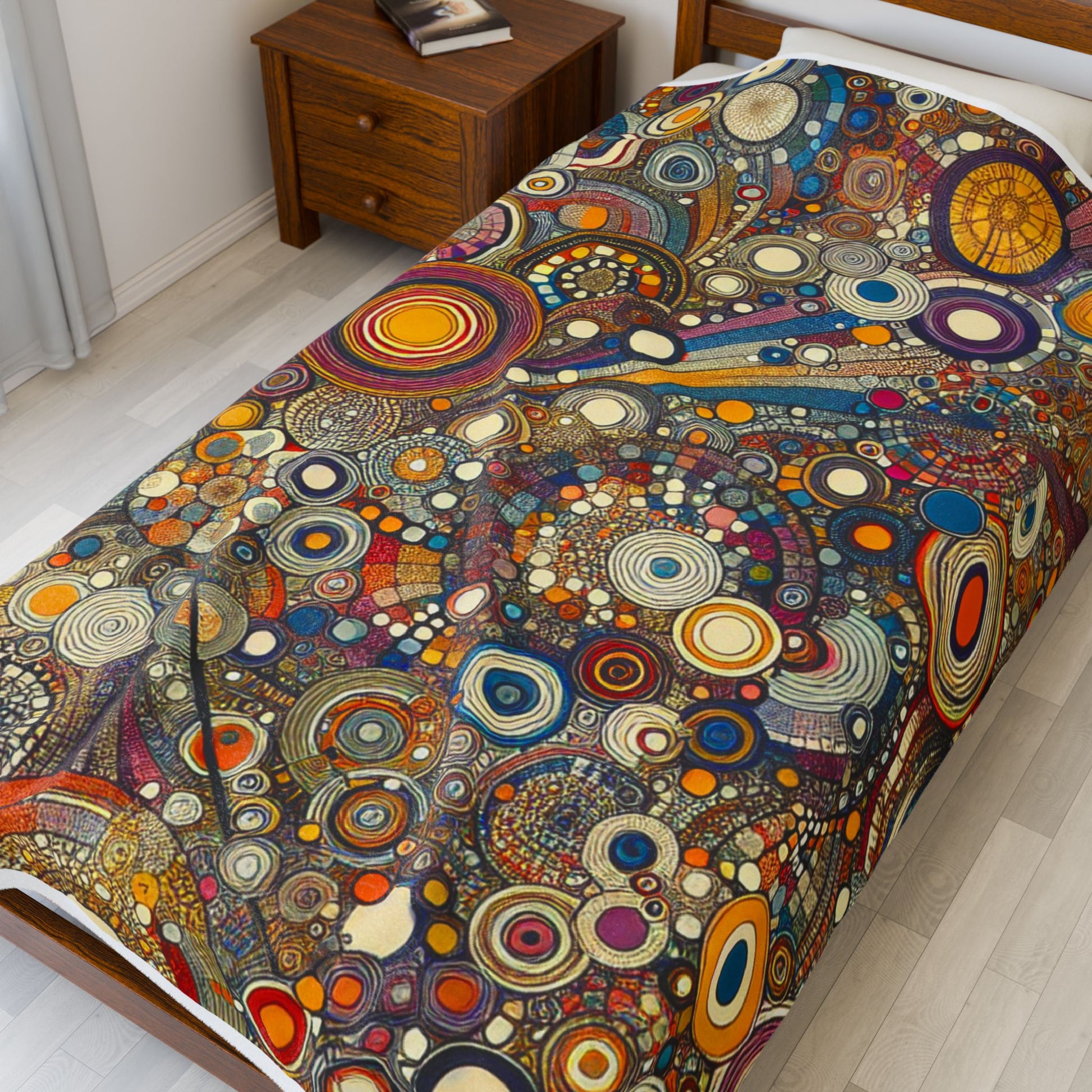 A vibrant tapestry of concentric circles bursts with dynamic energy, weaving bold colors and intricate patterns into a mesmerizing cosmic dance. This abstract artwork invites viewers to explore its kaleidoscope of shapes and hues, evoking a sense of infinite movement and creativity. Create a cozy and warm atmosphere at home with this plush velveteen blanket. It is soft to touch and perfect for any home. Customize with a one-sided print to add your personal touch or create a gift for your friends and family. Available in three sizes: 30x40", 50x60", 60x80".