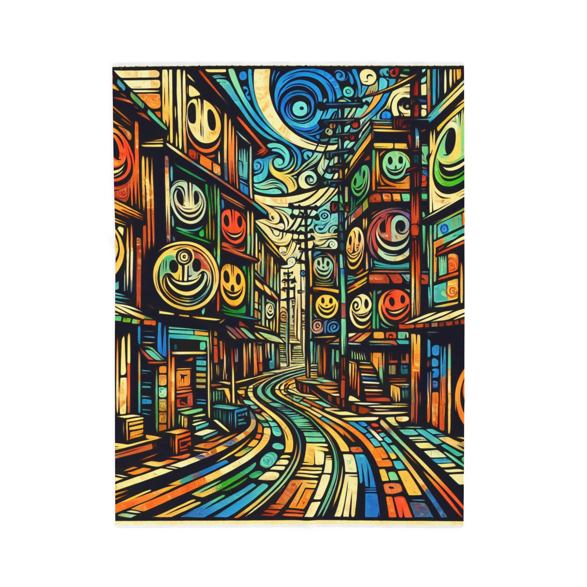 A vibrant, swirling street scene filled with dynamic, geometric patterns and joyful, abstract smiley faces. The bold colors and playful composition create a whimsical, surreal urban landscape, merging architecture with expressive art. Create a cozy and warm atmosphere at home with this plush velveteen blanket. It is soft to touch and perfect for any home. Customize with a one-sided print to add your personal touch or create a gift for your friends and family. Available in three sizes: 30x40", 50x60", 60x80".