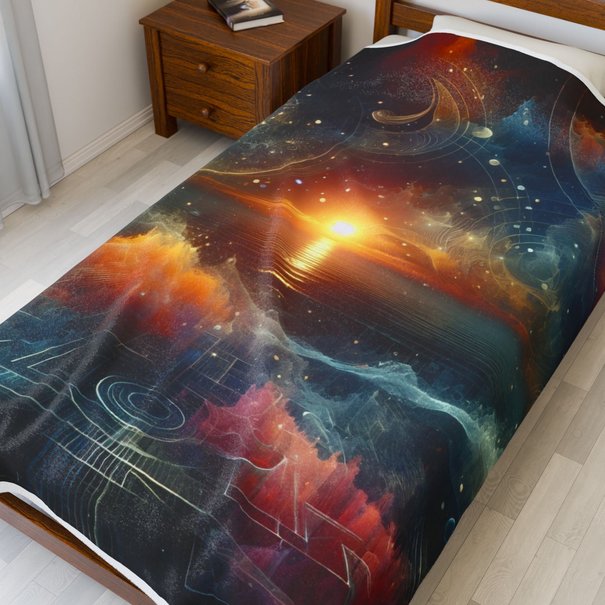 An ethereal fusion of technology and nature, this digital artwork showcases a vibrant sunset over a tranquil sea interlaced with circuit-like patterns, giving a surreal impression of a world where the digital and the organic intertwine seamlessly. Create a cozy and warm atmosphere at home with this plush velveteen blanket. It is soft to touch and perfect for any home. Customize with a one-sided print to add your personal touch or create a gift for your friends and family. Available in three sizes: 30x40", 50x60", 60x80".
